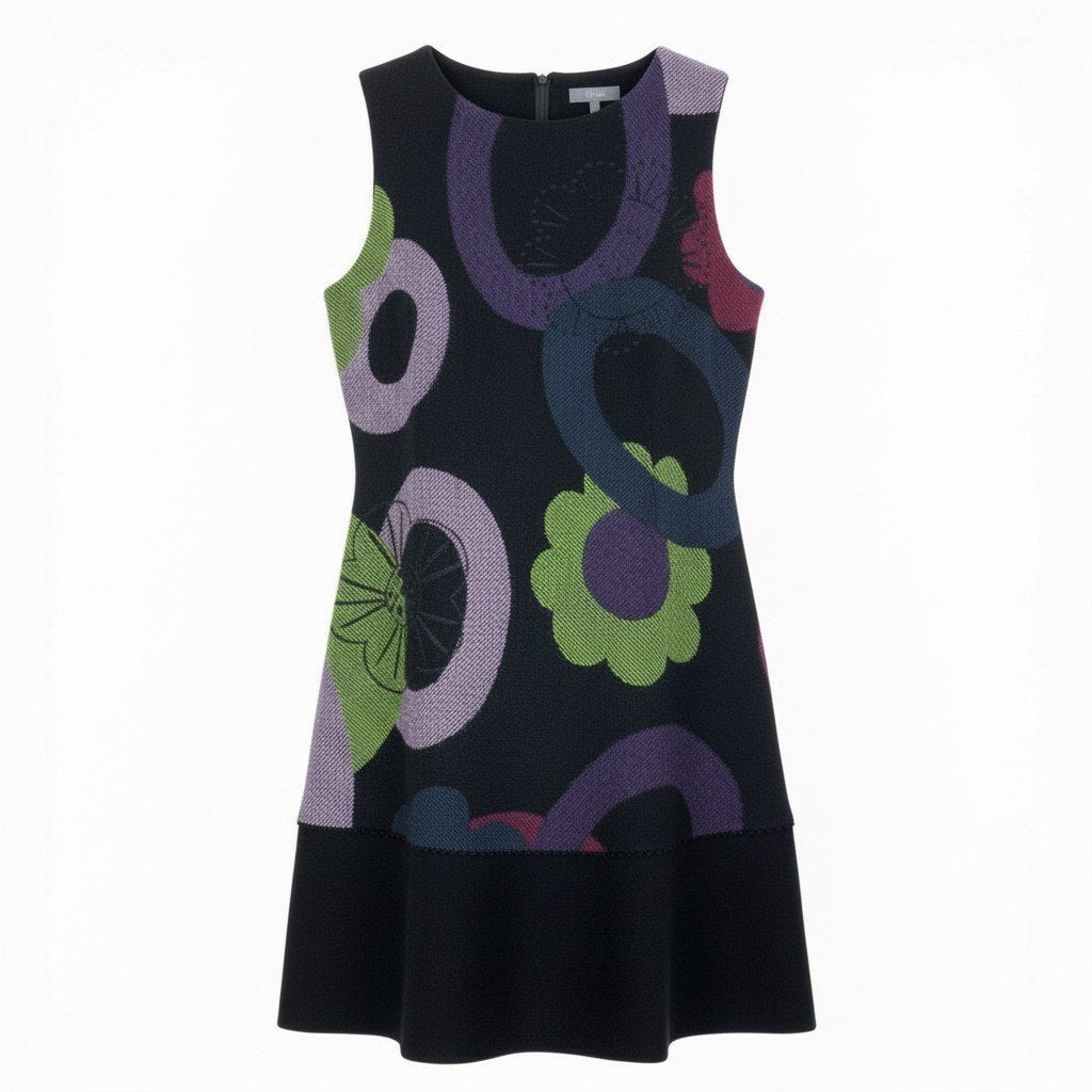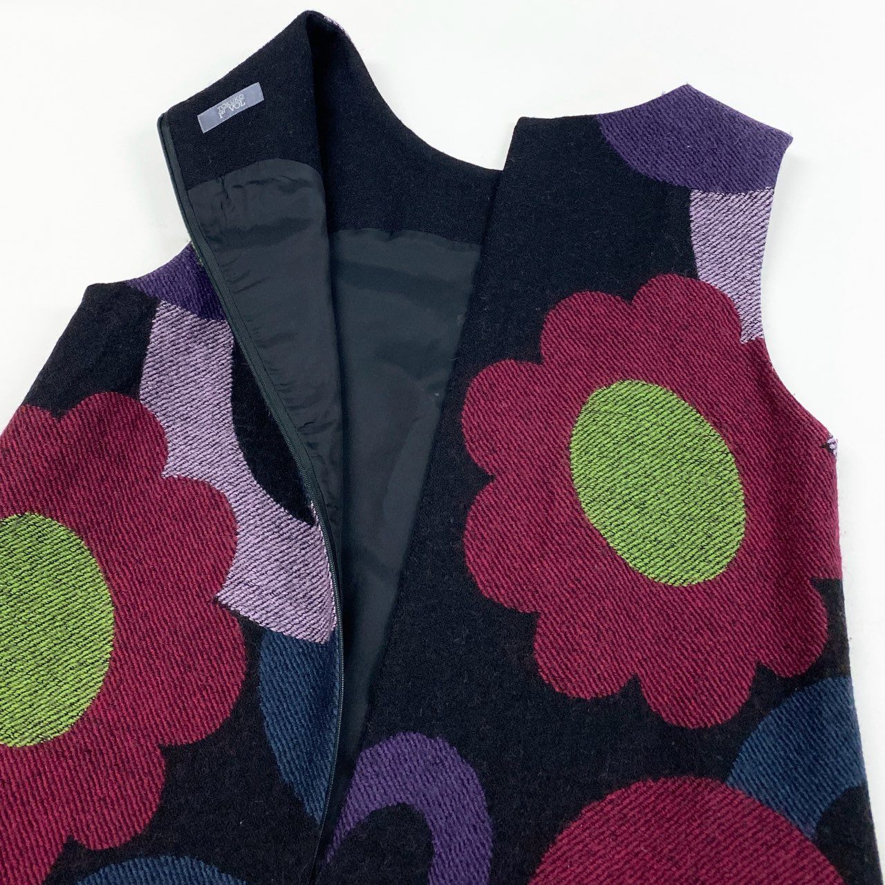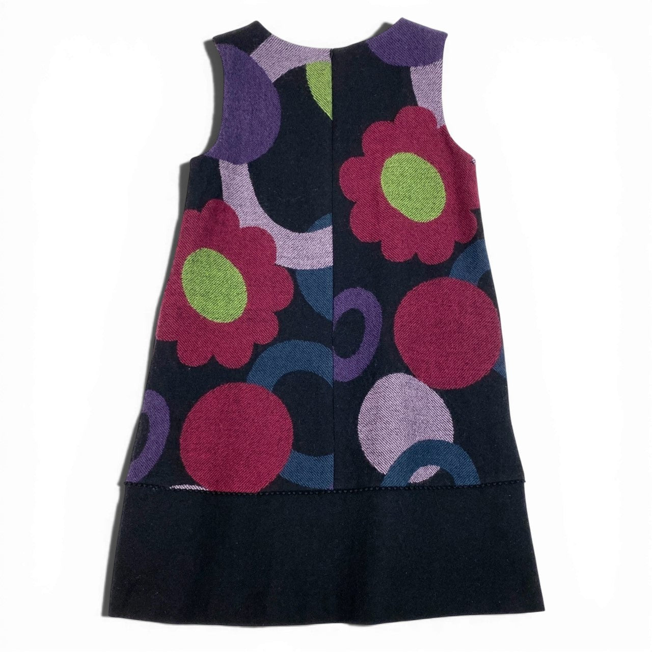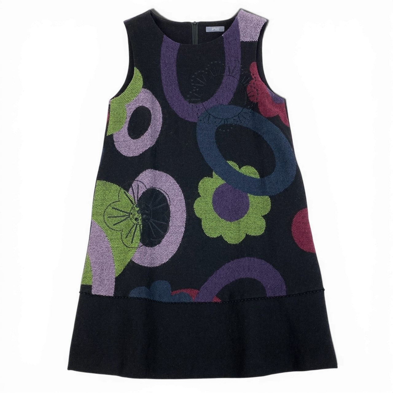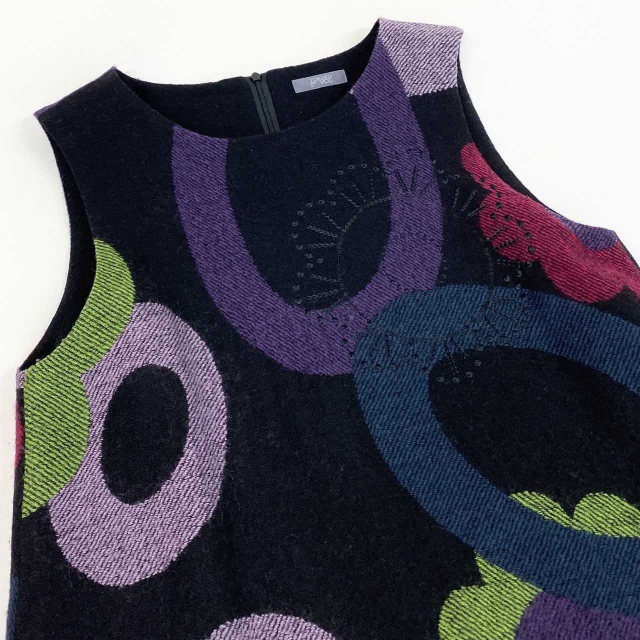 ブラックをベースに、グリーン・パープル・ピンクなどの大胆なフラワー&サークルモチーフが映えるノースリーブワンピースです。 立体的な刺繍やスパンコール装飾がアクセントとなり、華やかでアート性の高い印象に。 マットなウール素材と切替フレア裾が美しいシルエットを演出します。 一枚着はもちろん、インナー重ねで季節感あるコーディネートを楽しめる存在感抜群の一着です。