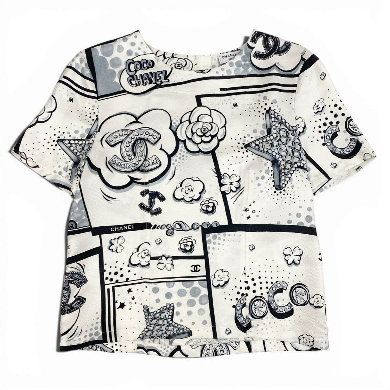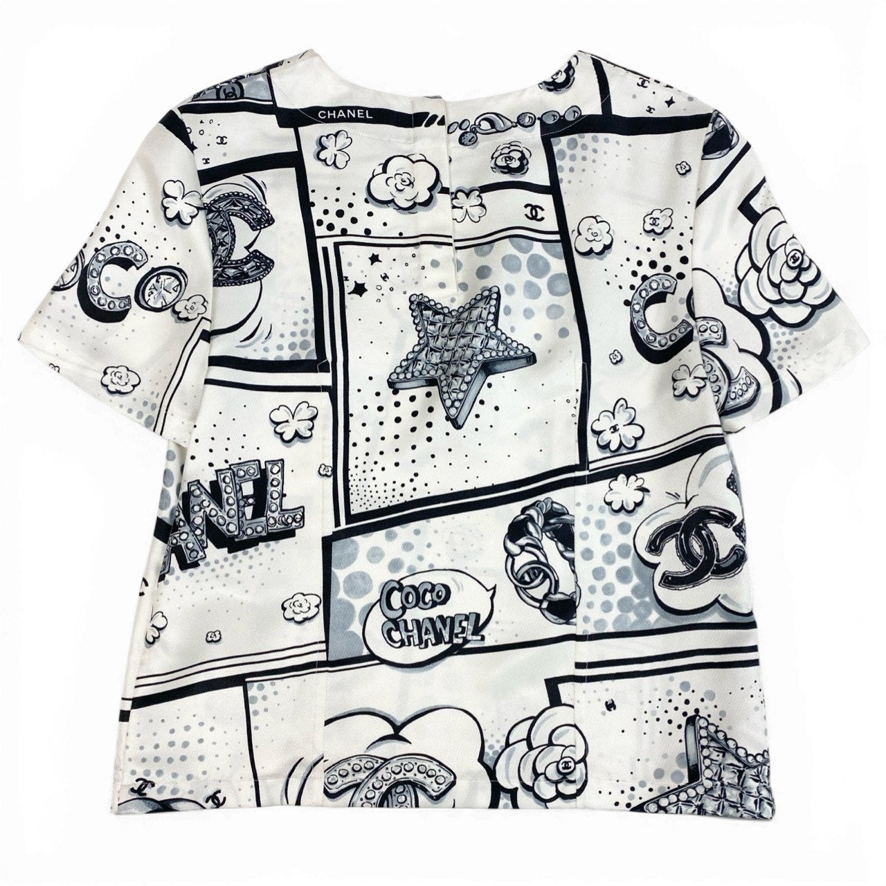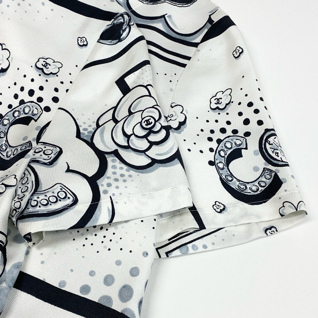 シャネルのアイボリーホワイトベースにブラックのモノトーンプリントが映える半袖シルクブラウスです。カメリア、ココマーク、スター、ドットなどを組み合わせたポップアート風総柄デザインが印象的。上質でなめらかな光沢感のあるシルク素材がエレガントな雰囲気を引き立てます。デニムでカジュアルダウンから、ジャケット合わせのモードスタイルまで幅広く活躍する一着です。