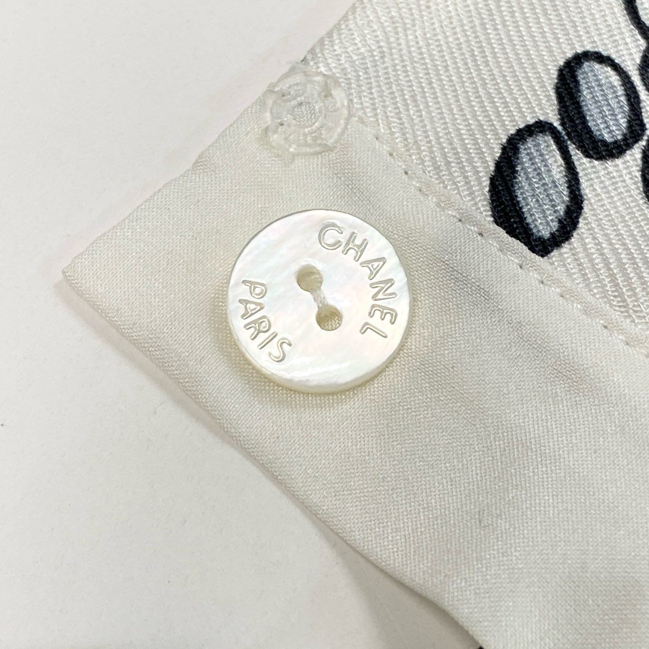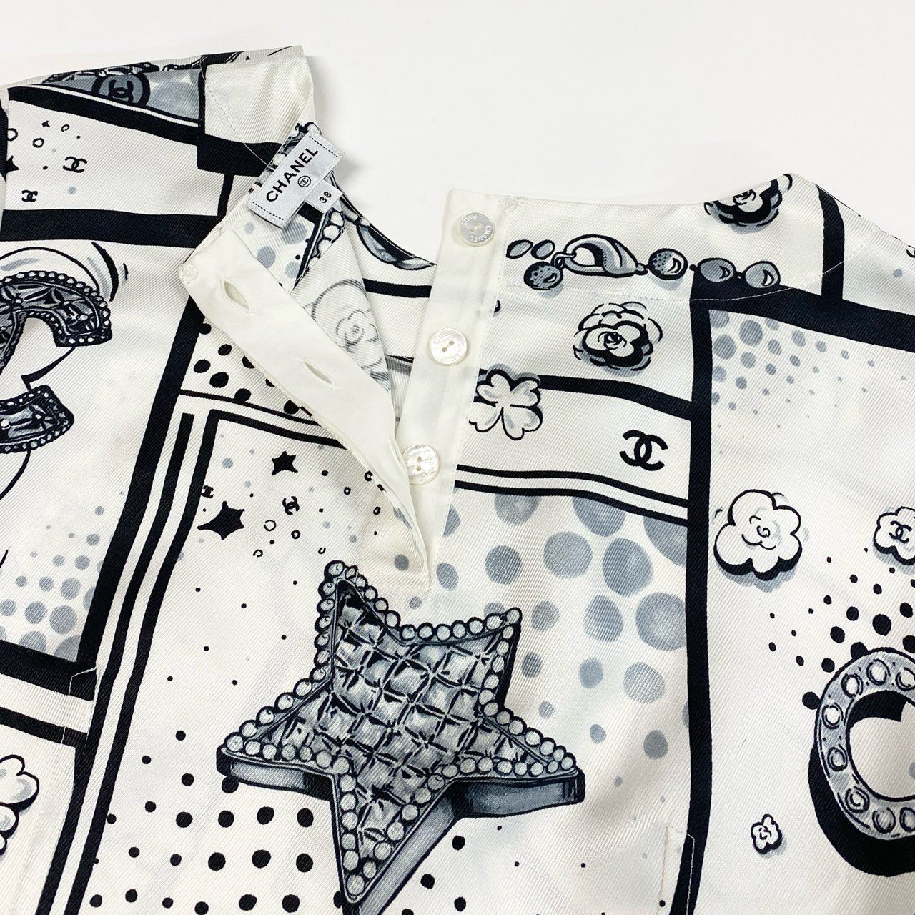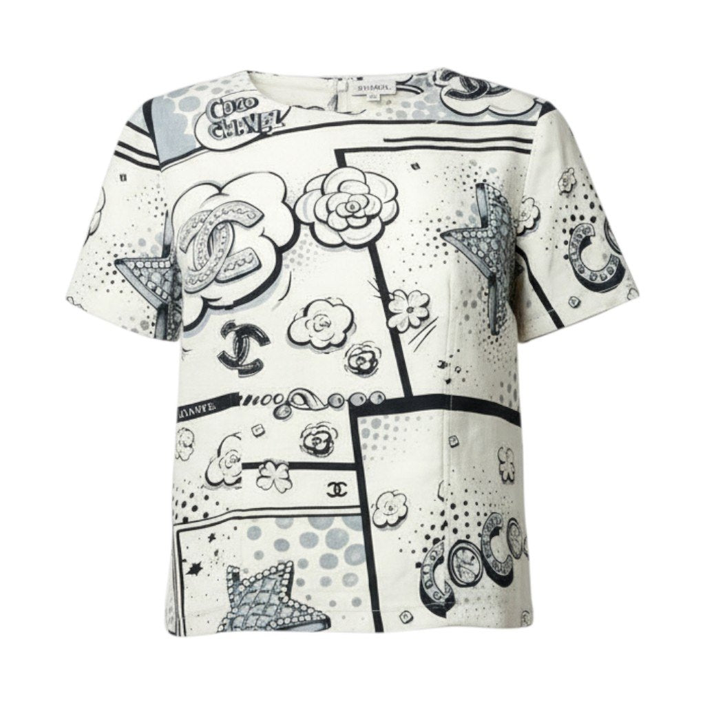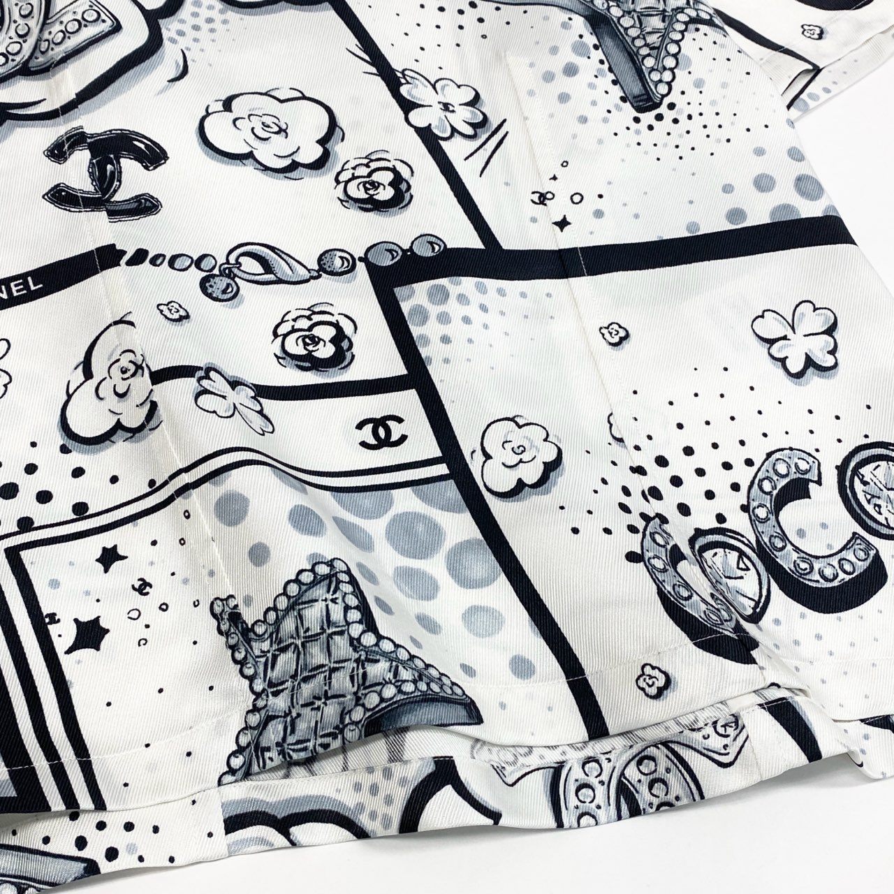 シャネルのアイボリーホワイトベースにブラックのモノトーンプリントが映える半袖シルクブラウスです。カメリア、ココマーク、スター、ドットなどを組み合わせたポップアート風総柄デザインが印象的。上質でなめらかな光沢感のあるシルク素材がエレガントな雰囲気を引き立てます。デニムでカジュアルダウンから、ジャケット合わせのモードスタイルまで幅広く活躍する一着です。