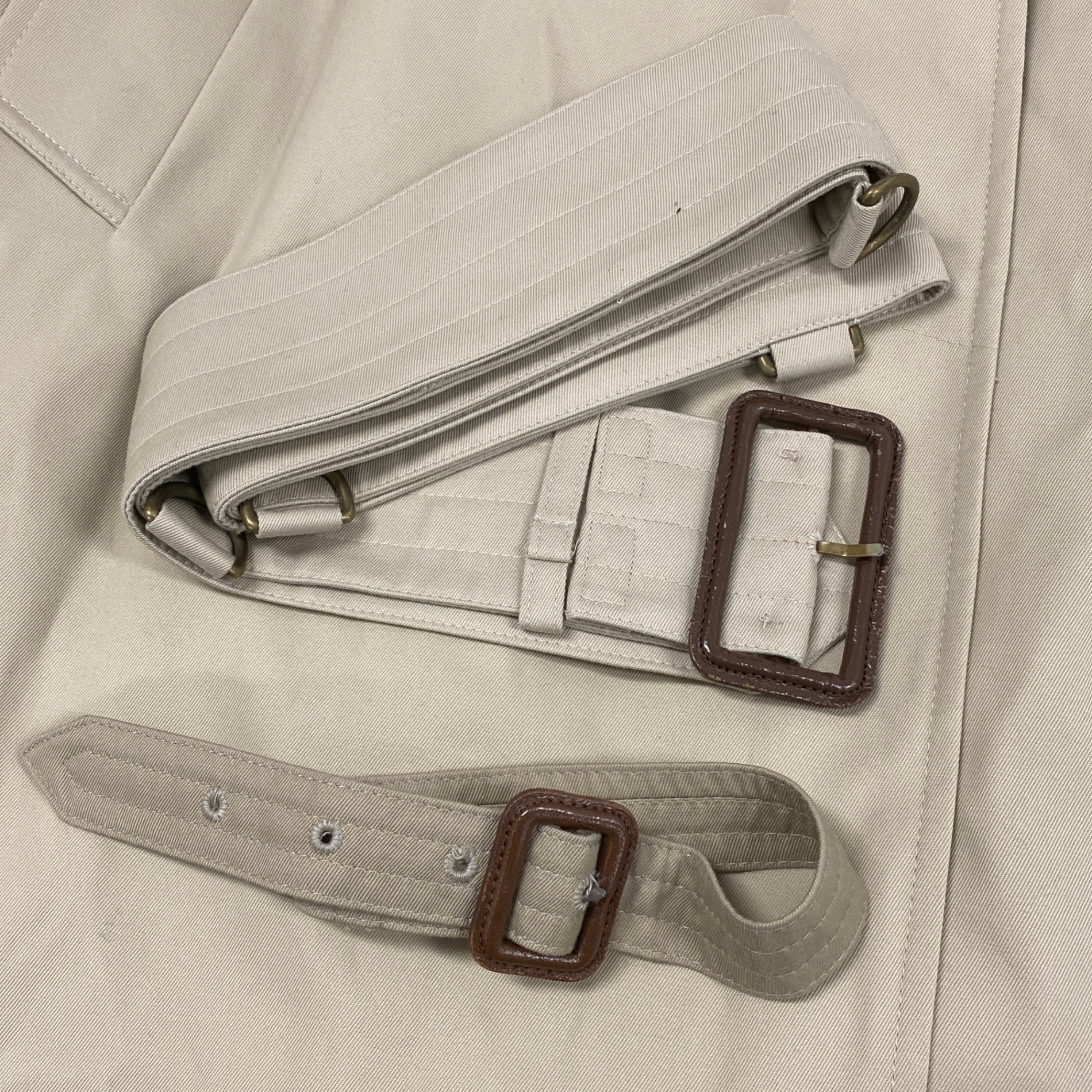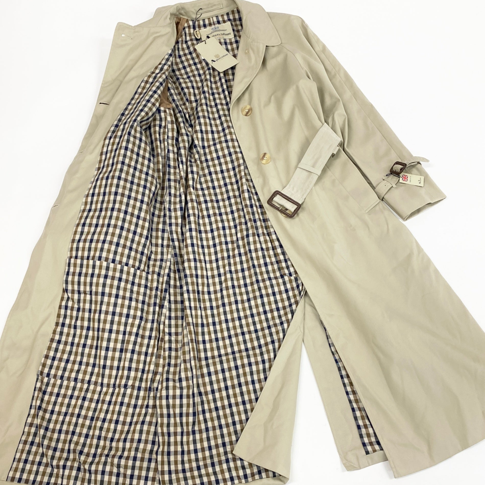 アクアスキュータムらしいクラシックなベージュのステンカラーコートです。素材はマットなコットン100%で、ハリ感がありながらも上品な風合い。裏地にはブランド定番のチェック柄を配し、袖口ベルトやウエストベルトのメタルバックルがアクセントになっています。通勤からきれいめカジュアルまで幅広く活躍する一着です。
