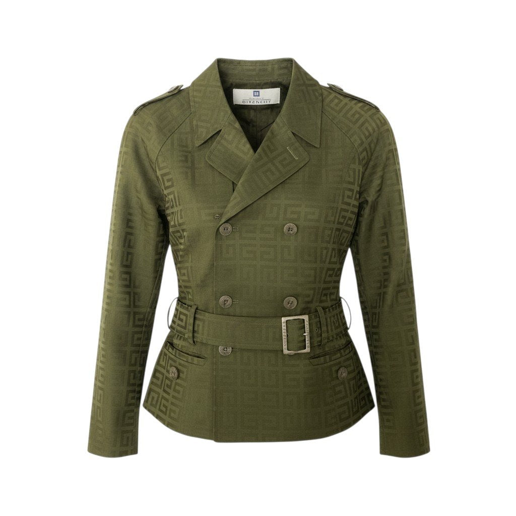 落ち着いたカーキグリーンカラーにジャガード織りのロゴパターンが施されたGIVENCHYのジャケットです。ブランドモノグラムがさりげなく浮かび上がる上品なデザインが特徴です。ダブルブレスト仕様とウエストベルト、メタルバックルがクラシックで洗練された印象を演出します。程よくハリのある素材感で、パンツやスカートと合わせたモード感のあるスタイリングに活躍する一着です。