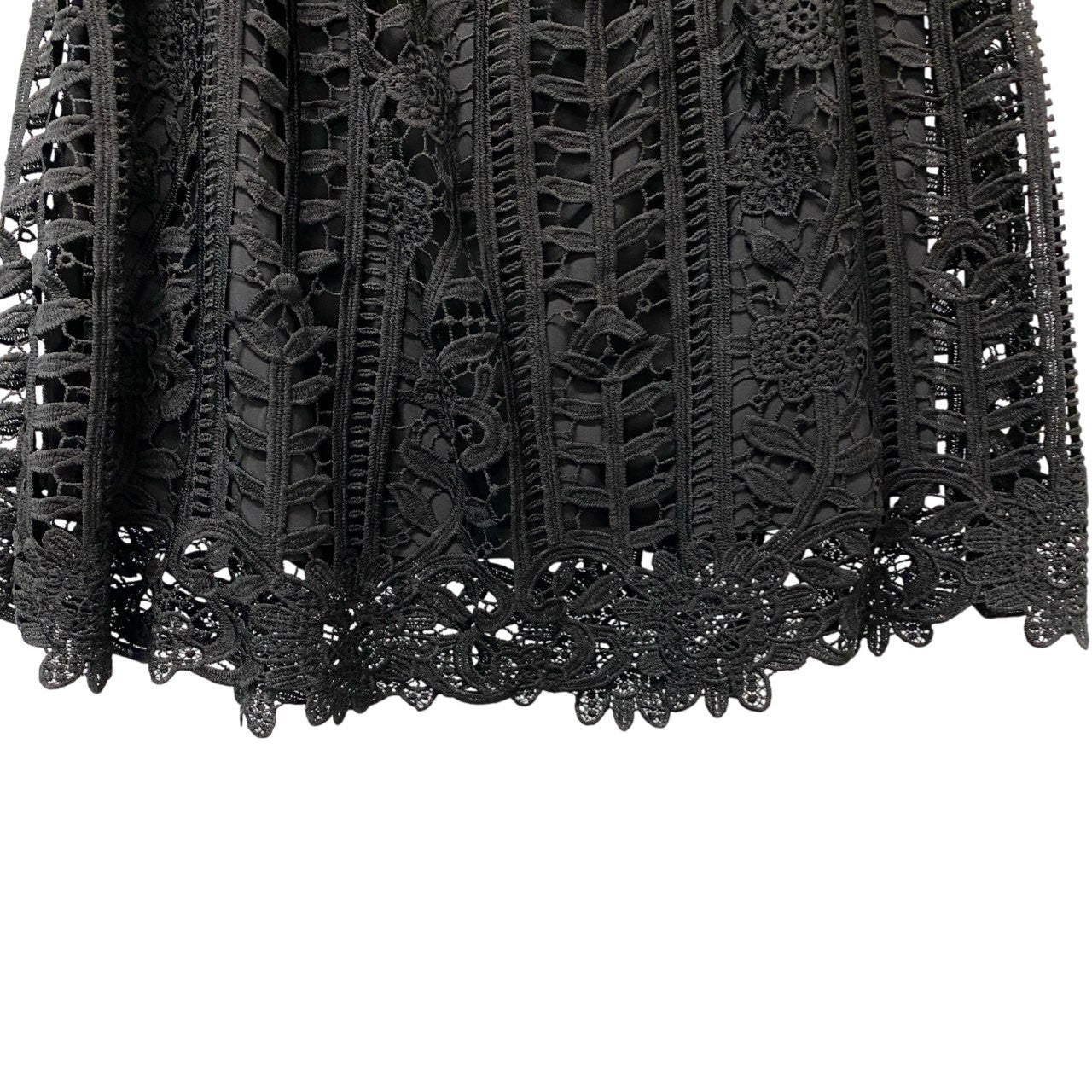 Blugirl Blumarine のフラワーモチーフレーススカートです。カラーはブラックで、花柄モチーフの立体的なレースとストライプ状の透かし編みが組み合わされたエレガントなデザイン。素材は軽やかなマットなポリエステルレースで、裾のスカラップカットがフェミニンな印象を引き立てます。上品な透け感とフレアシルエットが魅力で、ブラウスやニットと合わせたきれいめコーディネートにおすすめの一着です。