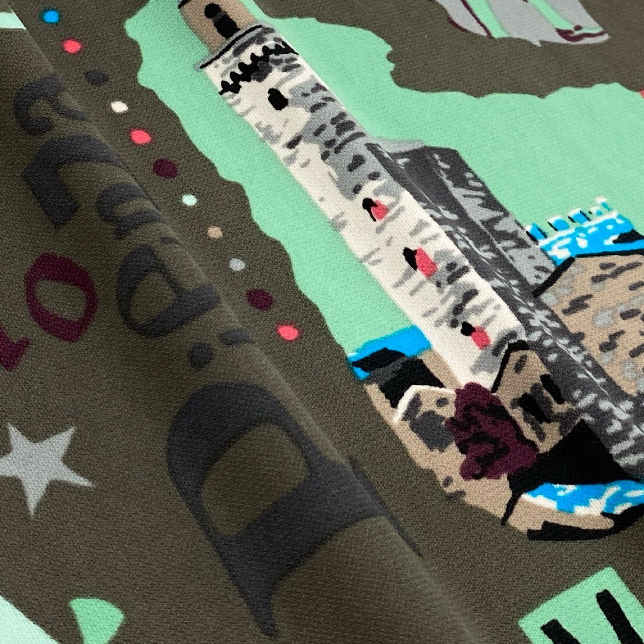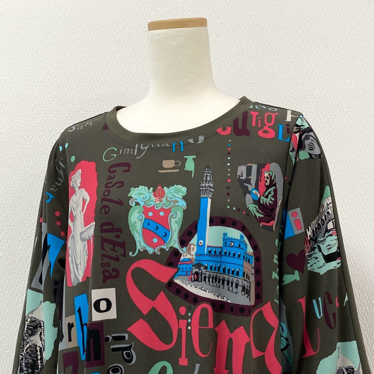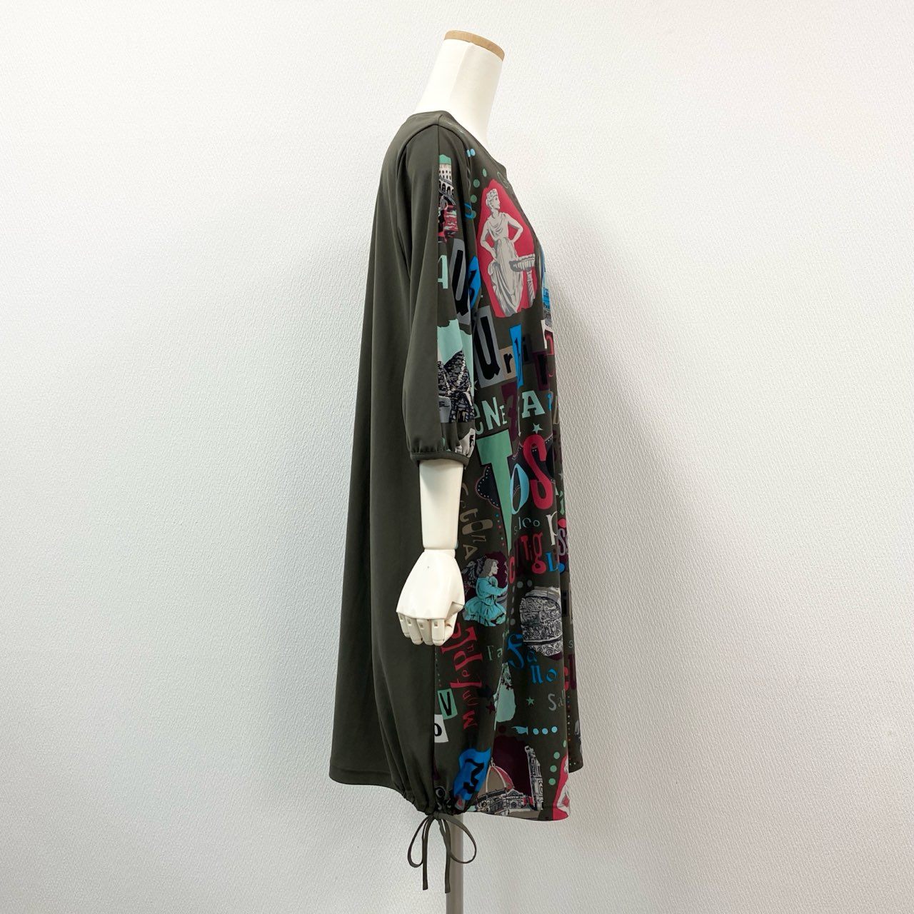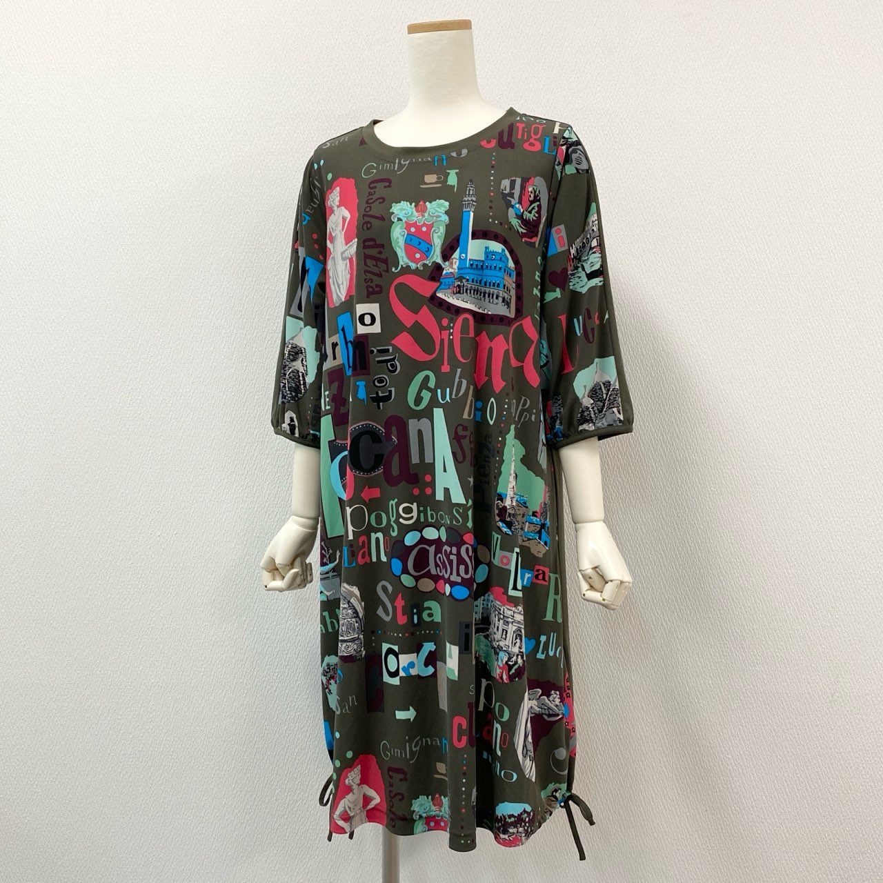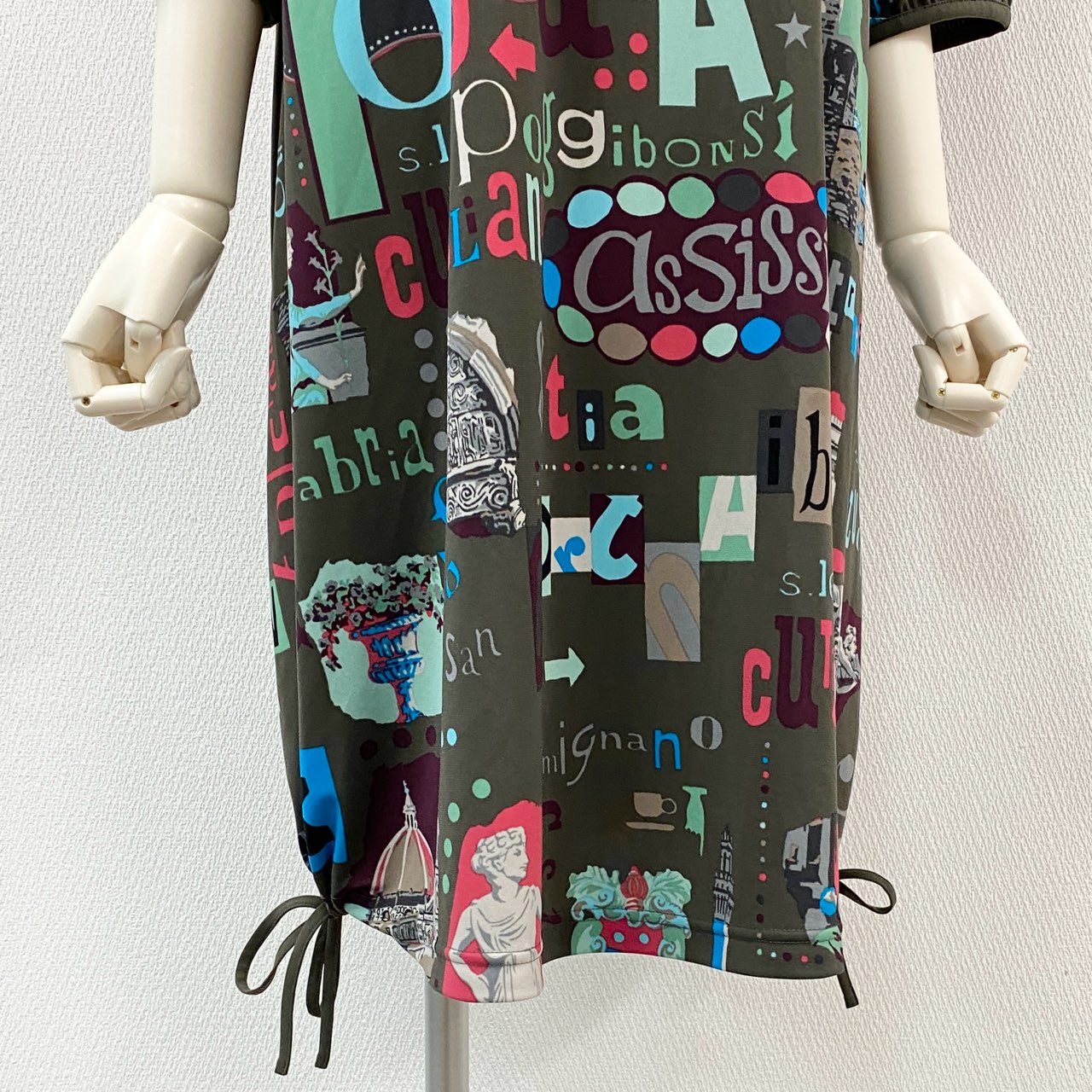 カーキグリーンをベースに、都市名や建物をポップに散りばめた総柄デザインが目を引く、TOKUKO 1er Volの7分袖ワンピースです。軽やかな生地感とゆとりあるシルエットで、暑い季節にも快適な着心地。裾にはさりげないドローコードが施され、シルエットに変化をつけるアレンジも可能。旅行やリゾート、アートな街歩きにも映える、遊び心ある1枚です。