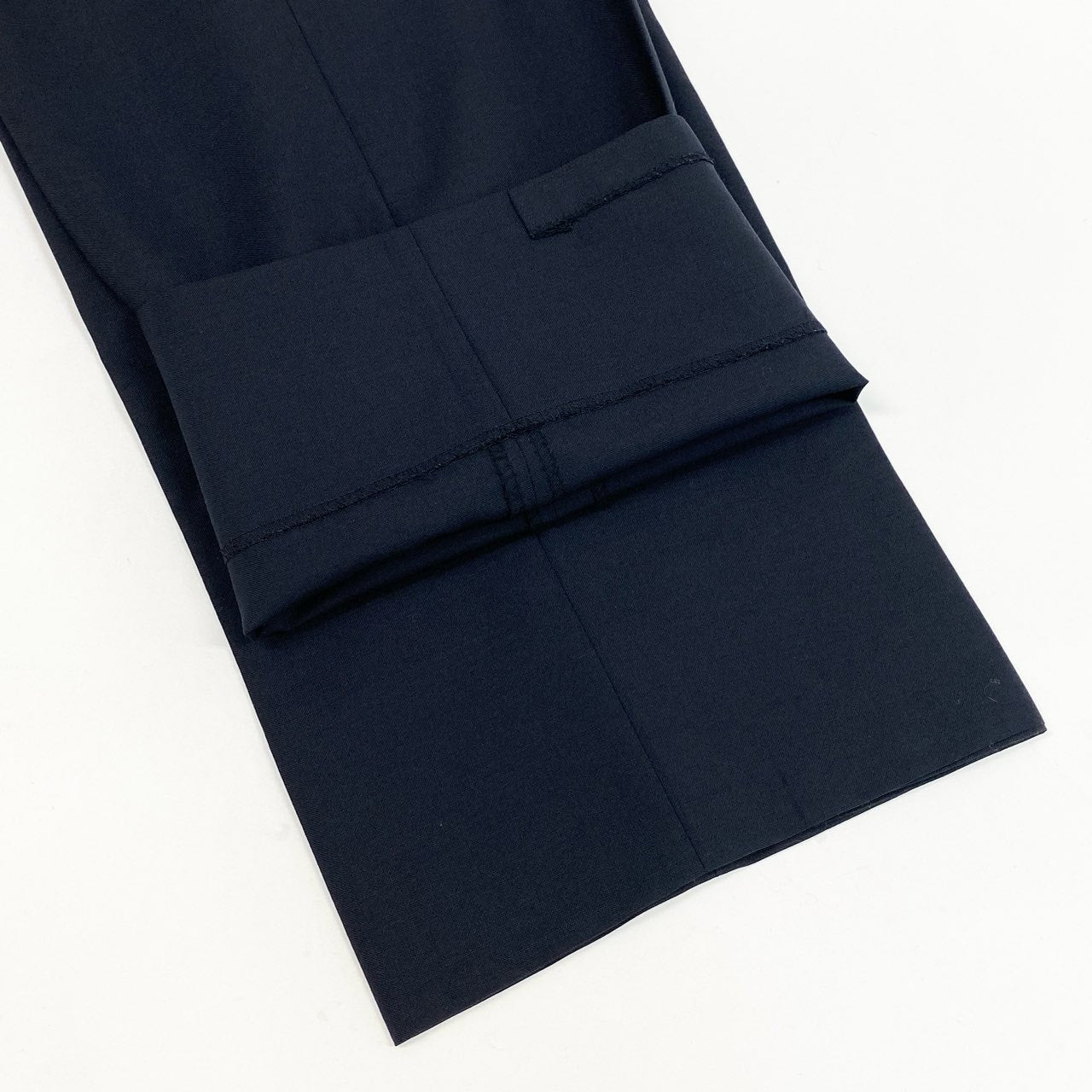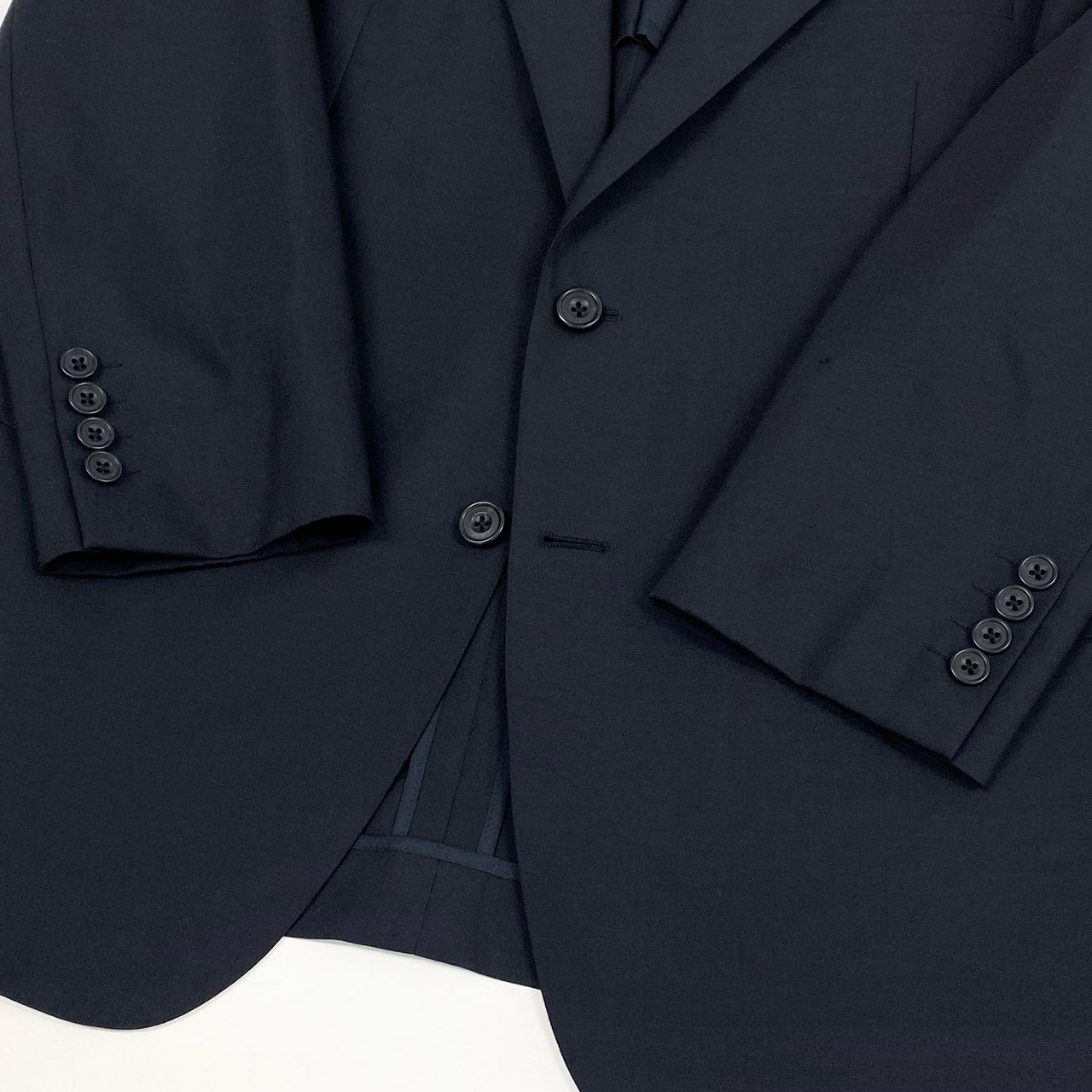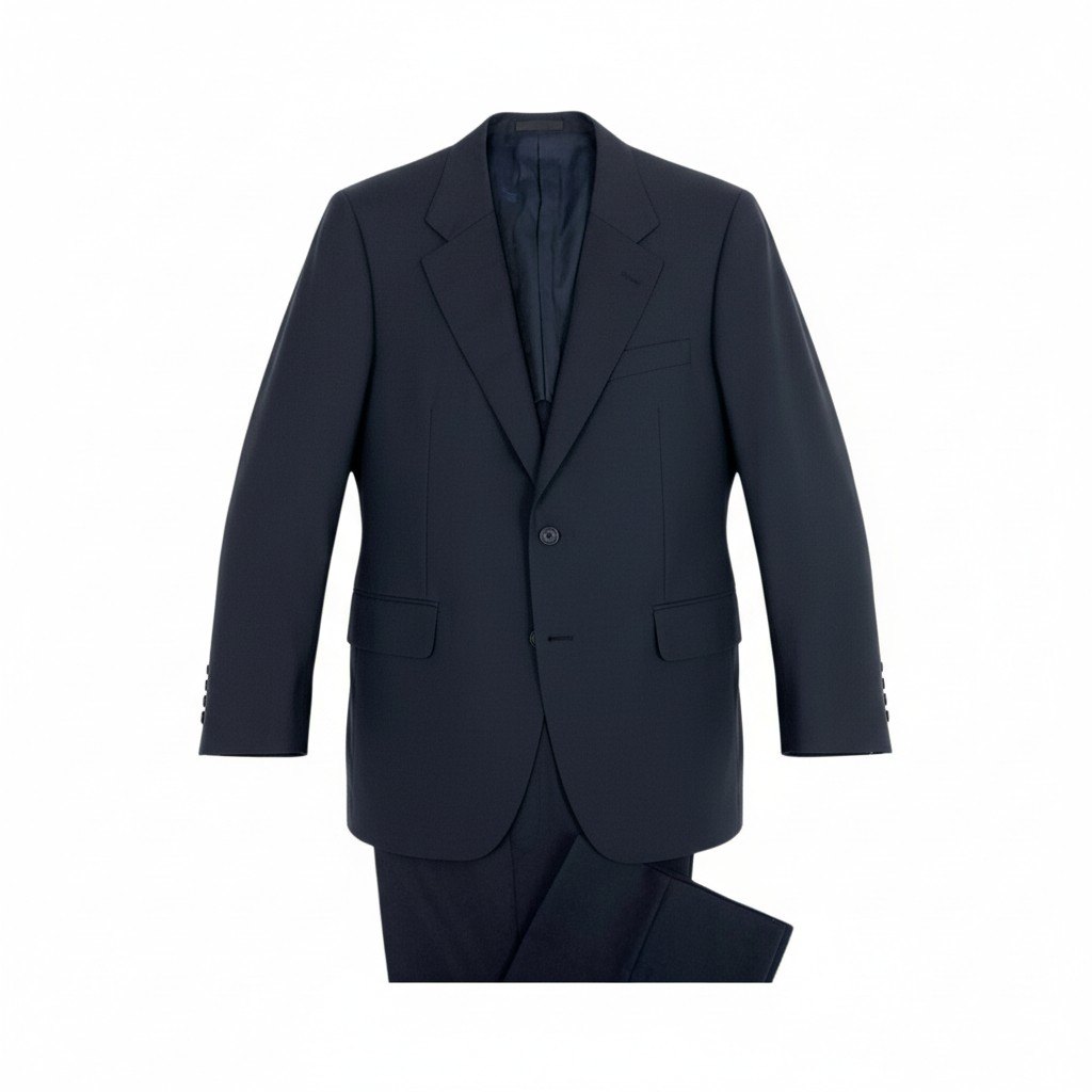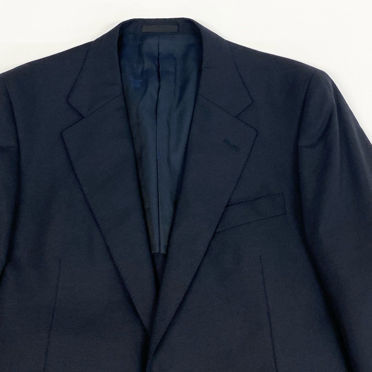 落ち着いたダークネイビーが上品な、BURBERRYのスーツセットアップ。マットで滑らかなウール系素材感が端正な表情を演出し、クラシカルな2ボタン仕様・ノッチドラペルが洗練された印象です。フラップポケットや袖ボタンなど、正統派テーラードのディテールも魅力。ビジネスシーンはもちろん、式典やフォーマルな場にも安心して着用できる、長く使える定番スーツです。