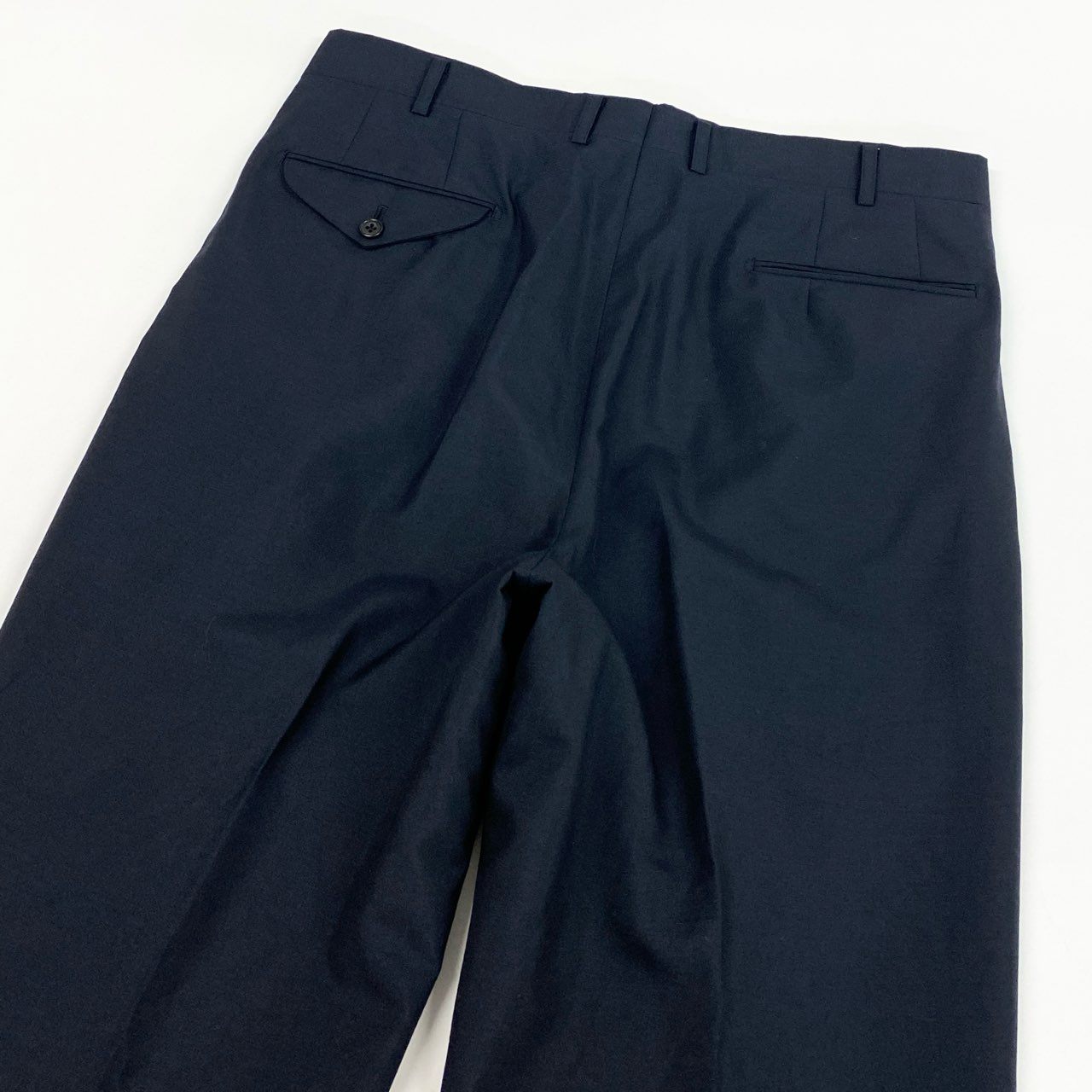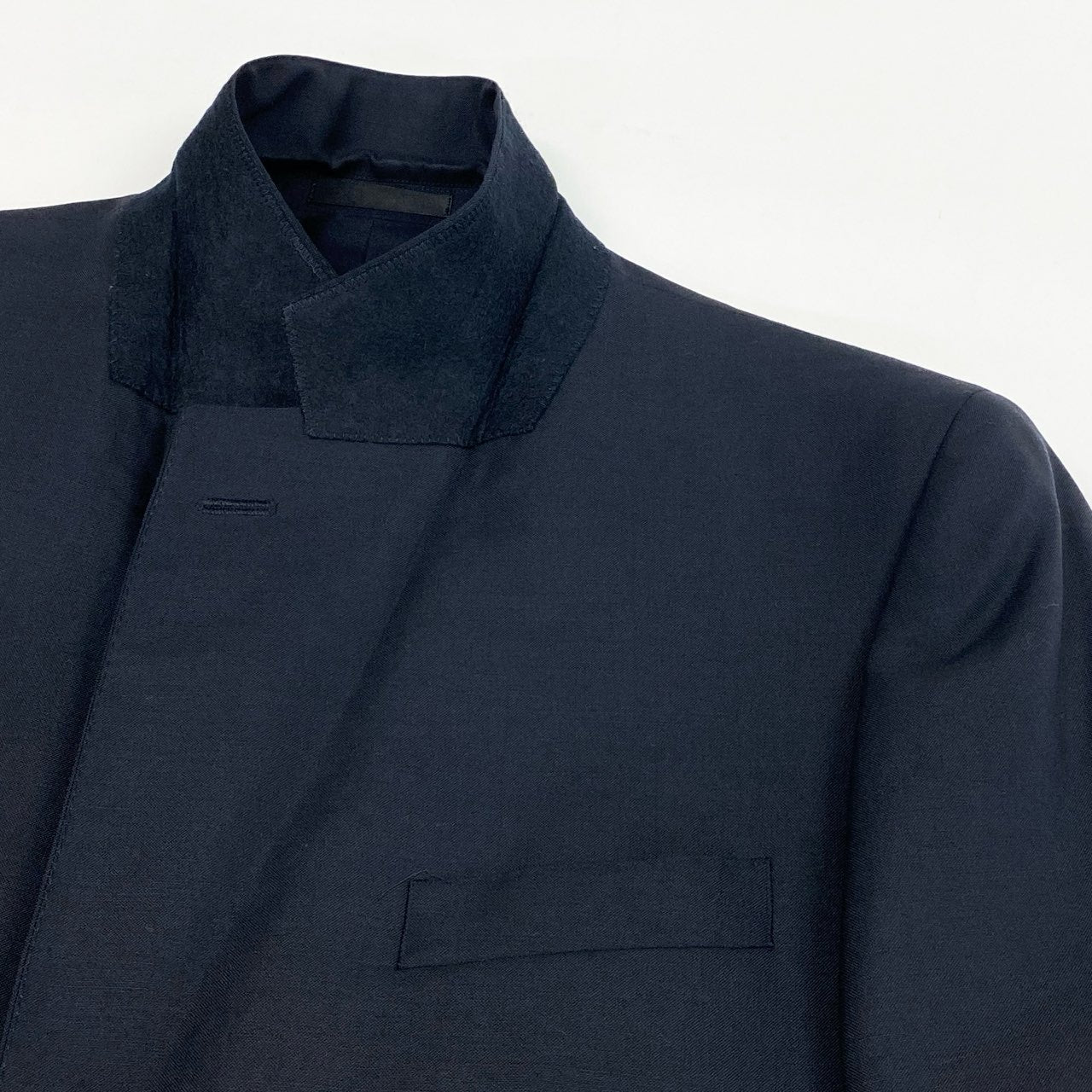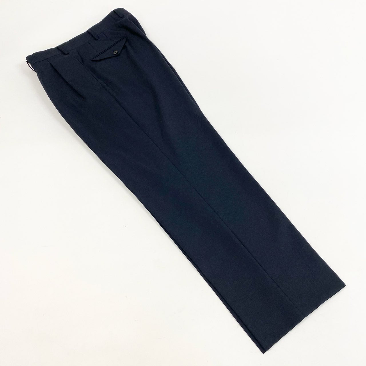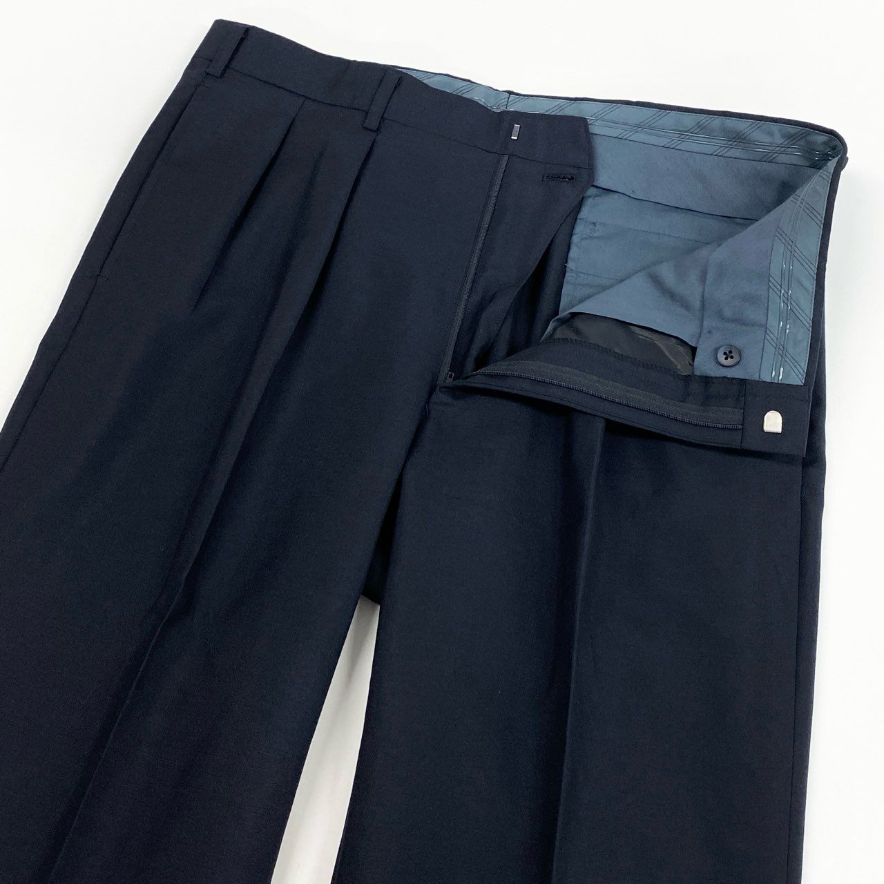 落ち着いたダークネイビーが上品な、BURBERRYのスーツセットアップ。マットで滑らかなウール系素材感が端正な表情を演出し、クラシカルな2ボタン仕様・ノッチドラペルが洗練された印象です。フラップポケットや袖ボタンなど、正統派テーラードのディテールも魅力。ビジネスシーンはもちろん、式典やフォーマルな場にも安心して着用できる、長く使える定番スーツです。