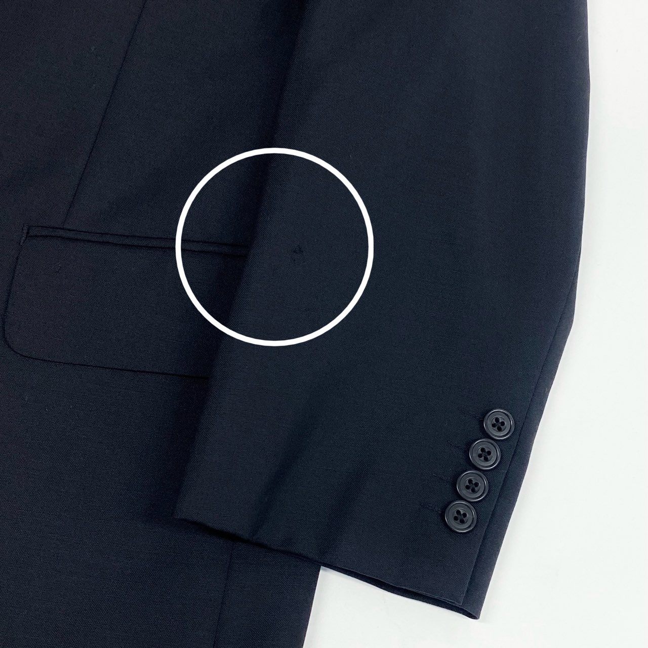 表記サイズBB5、実寸はジャケット肩幅48cm・身幅57cm・着丈75cm、パンツはウエスト46cm(平置)・股下75.5cmで、身長170〜178cm前後/胸囲95〜105cm程度の体型に適しています。