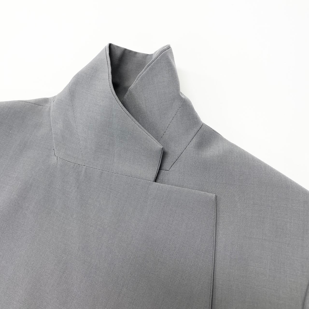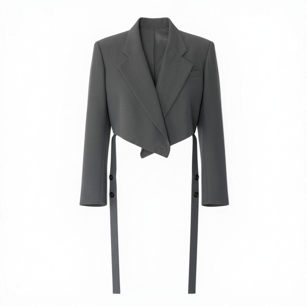 洗練されたチャコールグレーのカラーがモードな印象を与える、ウジョーのラップショートジャケットです。マットな質感の生地に、立体的なテーラードカラーと大胆なクロップドデザインが特徴。サイドから垂れるベルトディテールとボタン装飾がアクセントとなり、エッジの効いたスタイリングを演出します。ハイウエストボトムやワンピースと好相性で、モードからカジュアルまで幅広く活躍する一着です。