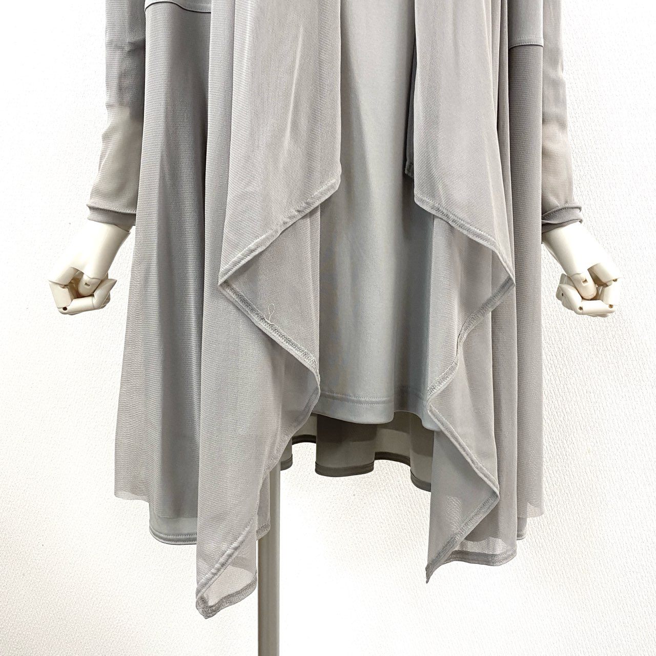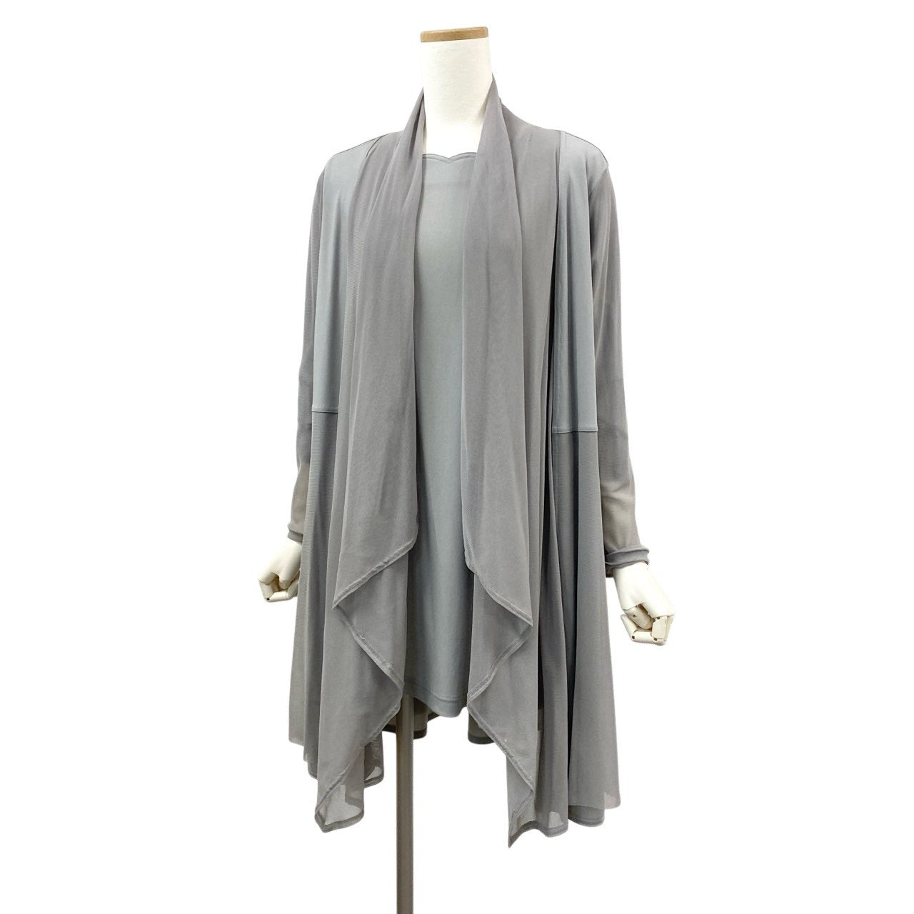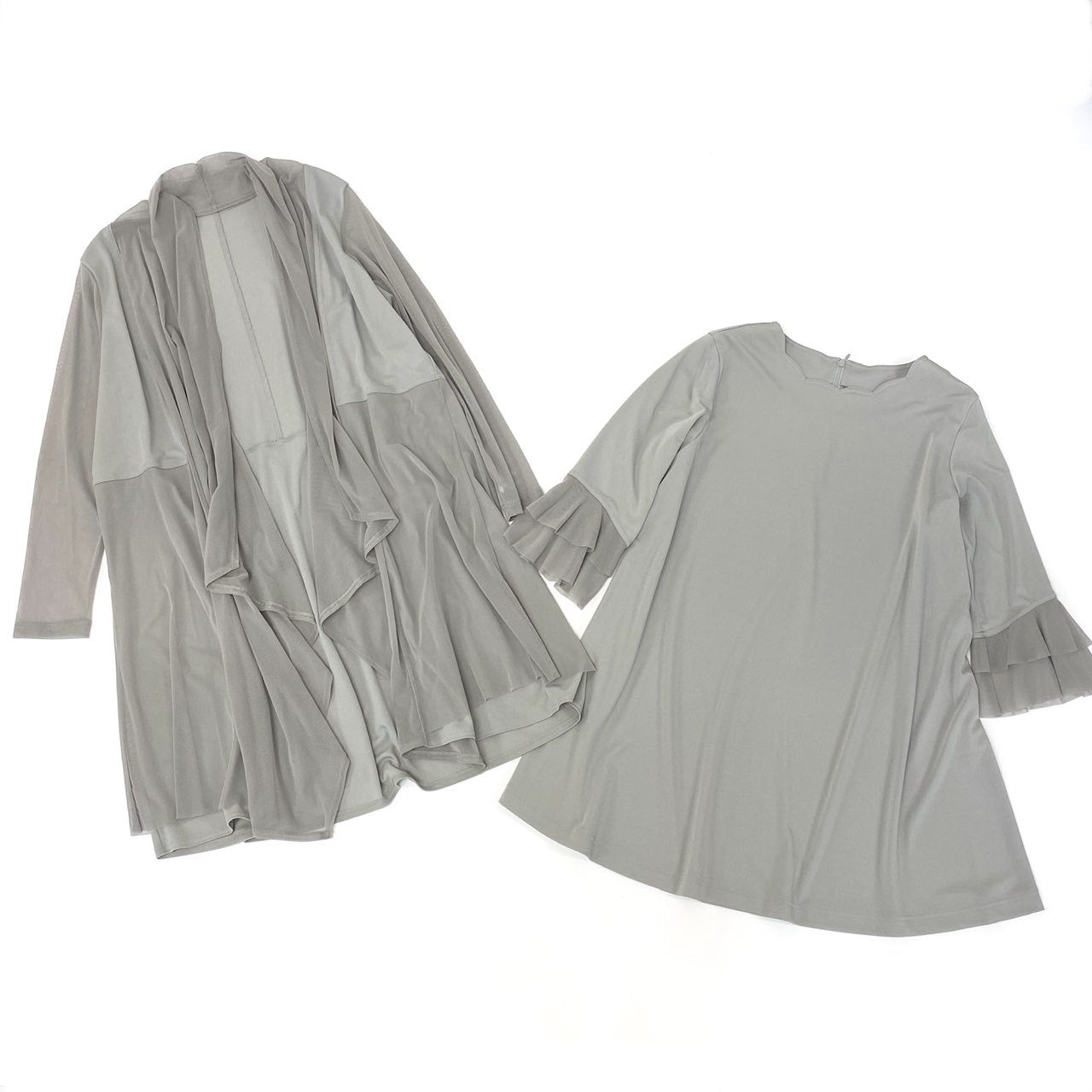 柔らかく落ち感のあるライトグレーが上品な、ワンピースとロングカーディガンのアンサンブルセットです。シアーメッシュの軽やかな素材が女性らしい透け感を与え、動くたびに美しいドレープが生まれます。7分袖のワンピースに、ゆったりと流れるロングカーディガンを重ねたレイヤードスタイルは、体型を優しくカバーしつつエレガントに着こなせる仕上がり。フォーマル寄りの外出、食事会、春夏の羽織りとして幅広く活躍する一着です。