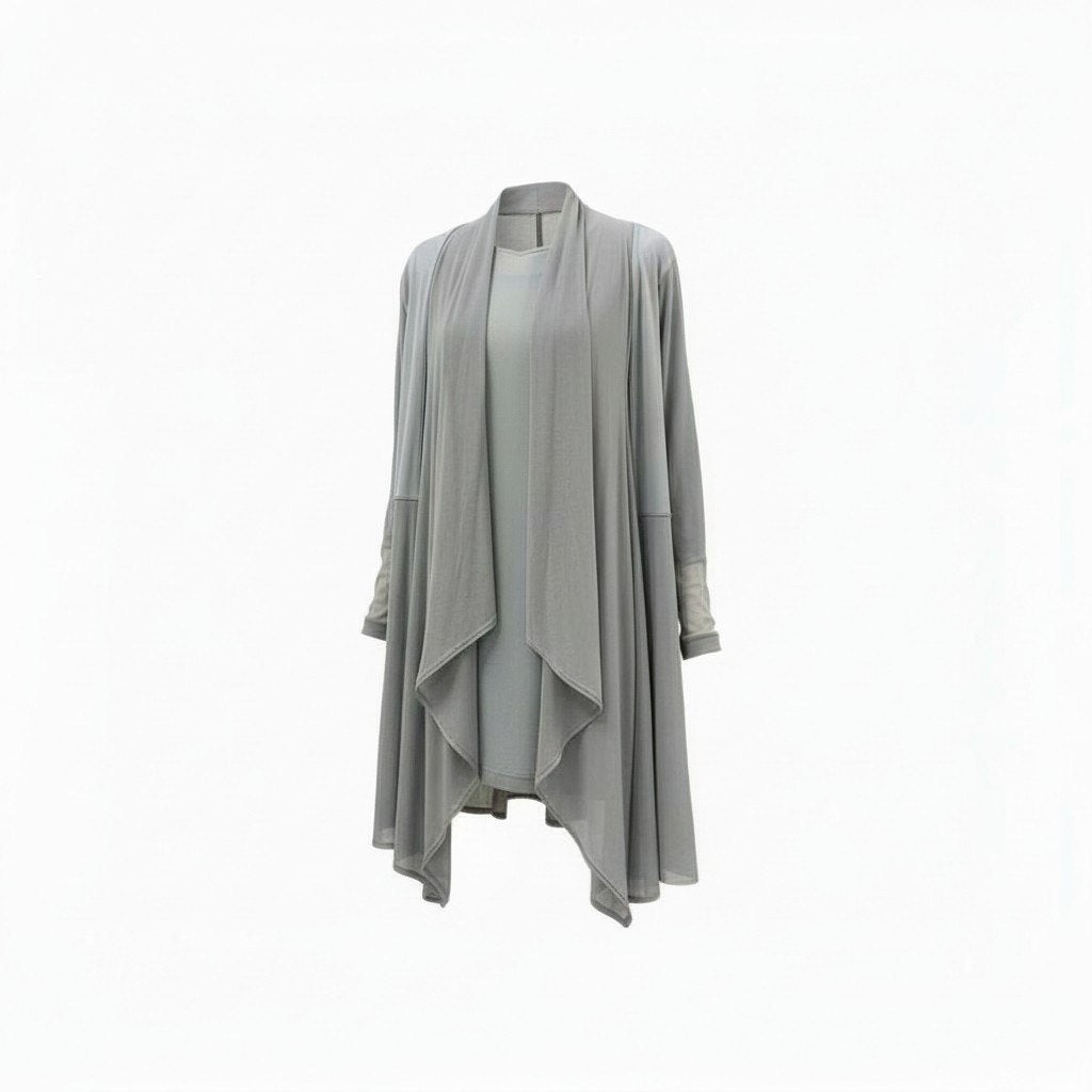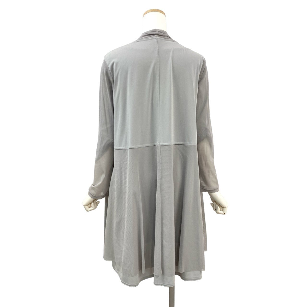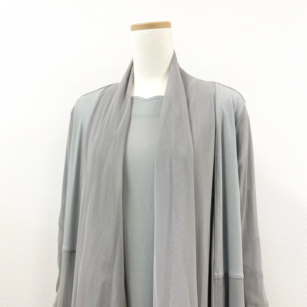 柔らかく落ち感のあるライトグレーが上品な、ワンピースとロングカーディガンのアンサンブルセットです。シアーメッシュの軽やかな素材が女性らしい透け感を与え、動くたびに美しいドレープが生まれます。7分袖のワンピースに、ゆったりと流れるロングカーディガンを重ねたレイヤードスタイルは、体型を優しくカバーしつつエレガントに着こなせる仕上がり。フォーマル寄りの外出、食事会、春夏の羽織りとして幅広く活躍する一着です。
