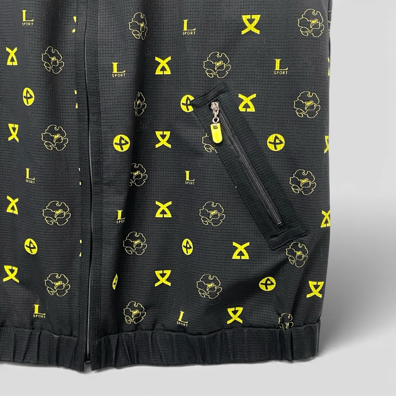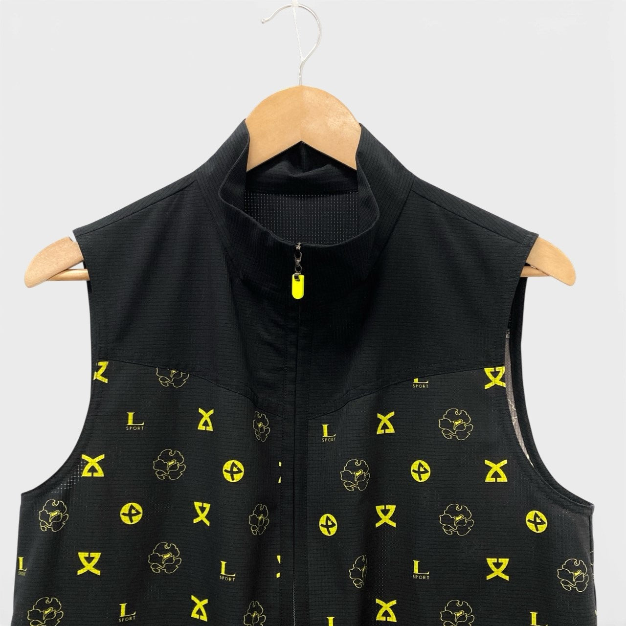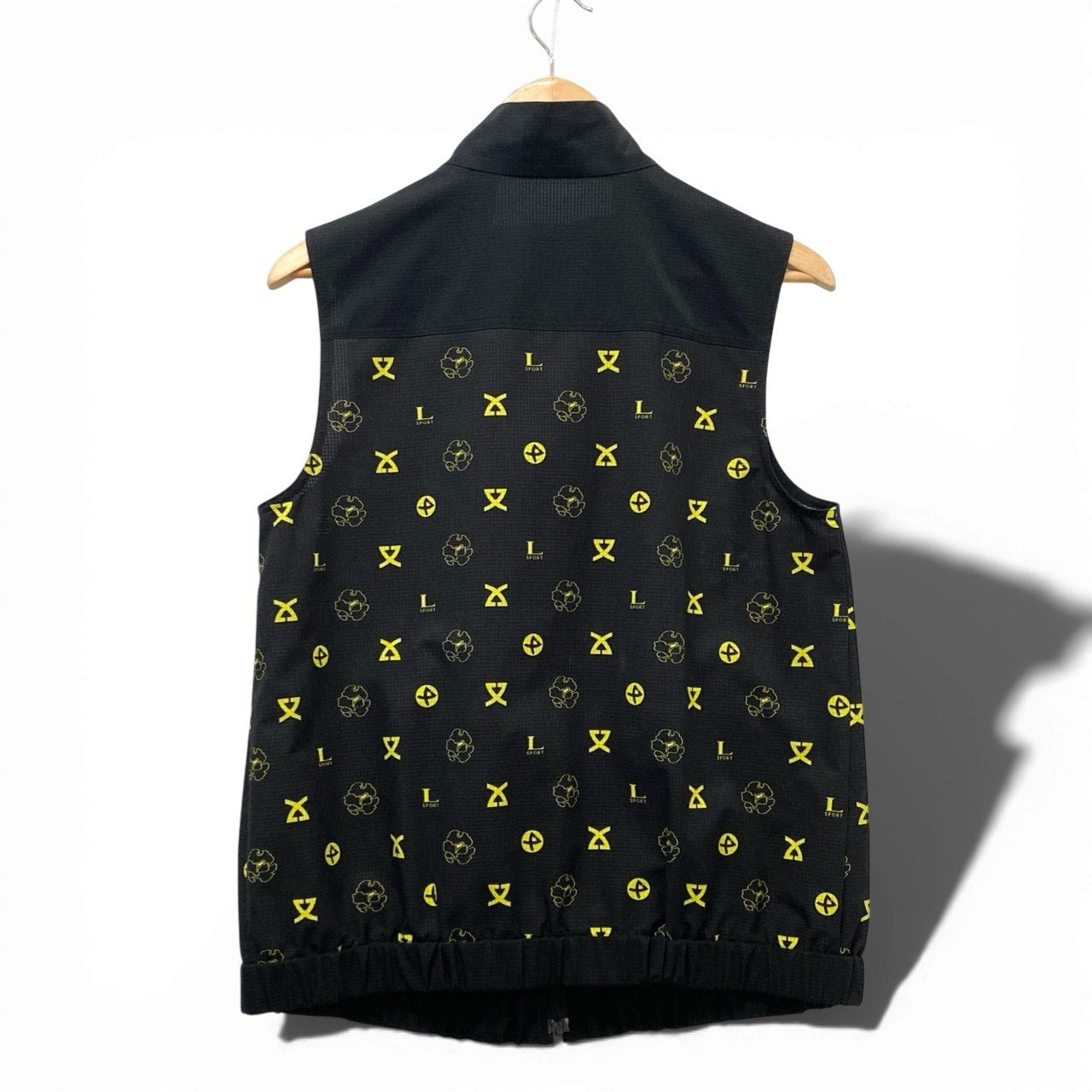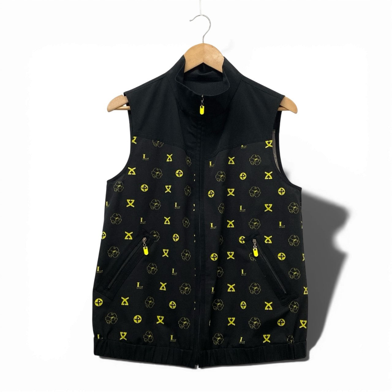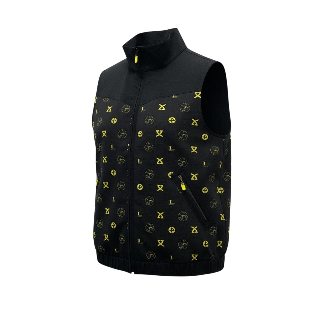 ブラックをベースに、ネオンイエローのロゴモチーフが映える総柄デザインのジップアップメッシュベストです。通気性のあるメッシュ調ポリエステル素材で、マットな質感ながらスポーティーな印象を演出。ハイネック仕様とフロントジップ、ポケットのイエローファスナーパーツがアクセントになっています。アクティブシーンはもちろん、タウンユースのレイヤードスタイルにも映える一着です。