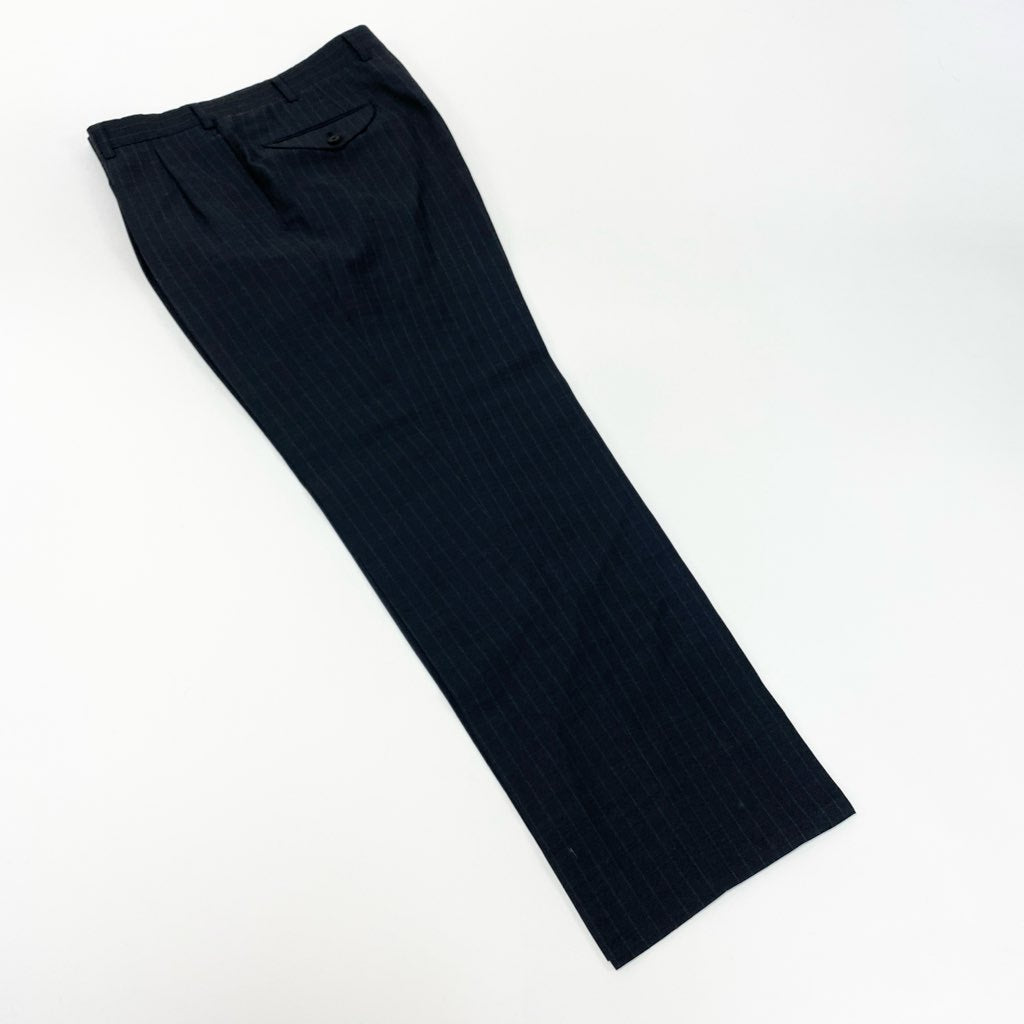 ダークネイビー系のカラーに、細かなピンストライプが入ったBurberrysのスーツセットアップです。マットで上品なウール素材感がクラシックな印象を与え、ダブルブレスト仕様が重厚感を演出します。シンプルな無地感覚のストライプ柄で、年代を問わず着用しやすいデザインです。ビジネスシーンはもちろん、式典やきちんと感が求められる場面にもおすすめの一着です。