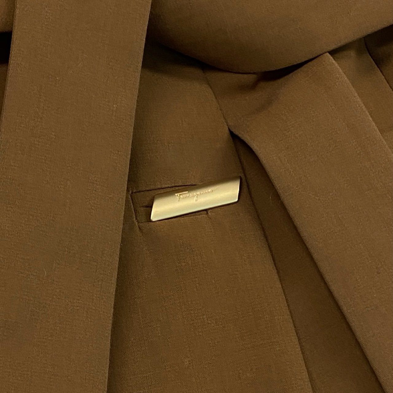 落ち着いたキャメルブラウンカラーが上品なSalvatore Ferragamoのジャケットです。表面はマットでしなやかなコットン素材で、軽やかで洗練された印象があります。フロントにはゴールドカラーのロゴボタンがあしらわれ、ラグジュアリーなアクセントをプラス。ウエストのリボンベルトデザインにより女性らしいシルエットを演出でき、通勤スタイルからきれいめカジュアルまで幅広く活躍する一着です。