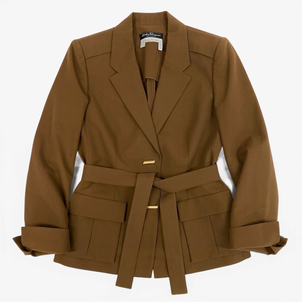 Ec6 Salvatore Ferragamo サルヴァトーレフェラガモ ハーフコート ジャケット ウエストリボン 金ロゴボタン レディース 女性服 イタリア製 44 キャメル コットン100%u02t