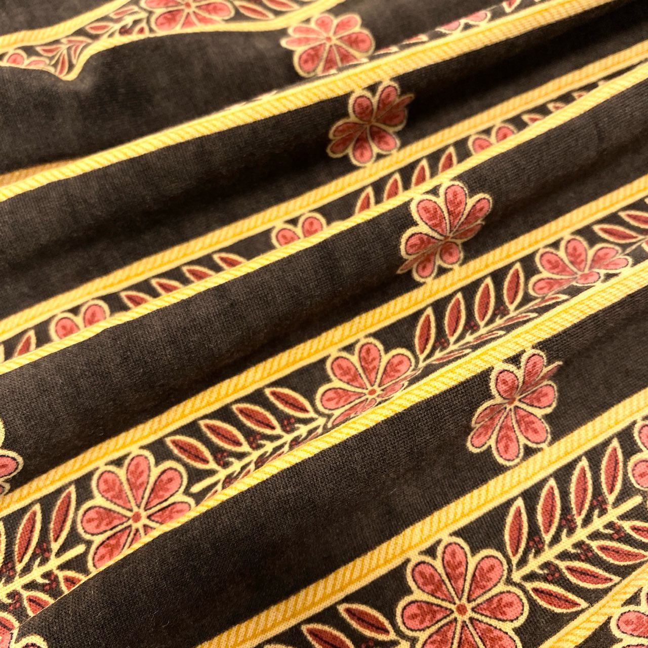 ダークブラウンをベースに、フラワーモチーフを配した縦ストライプ柄が印象的なヴィンテージ感漂うニットワンピースです。マットなニット素材で落ち着きがあり、襟付きデザインがクラシックで上品な雰囲気を演出します。1枚で主役になるデザイン性があり、秋冬のデイリーからお出かけシーンまで幅広く活躍します。ブーツやローファーと合わせることで、より洗練された大人のスタイリングが完成します。
