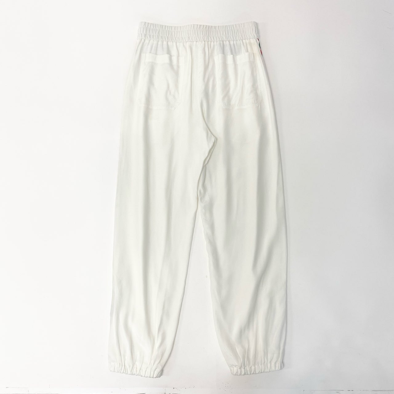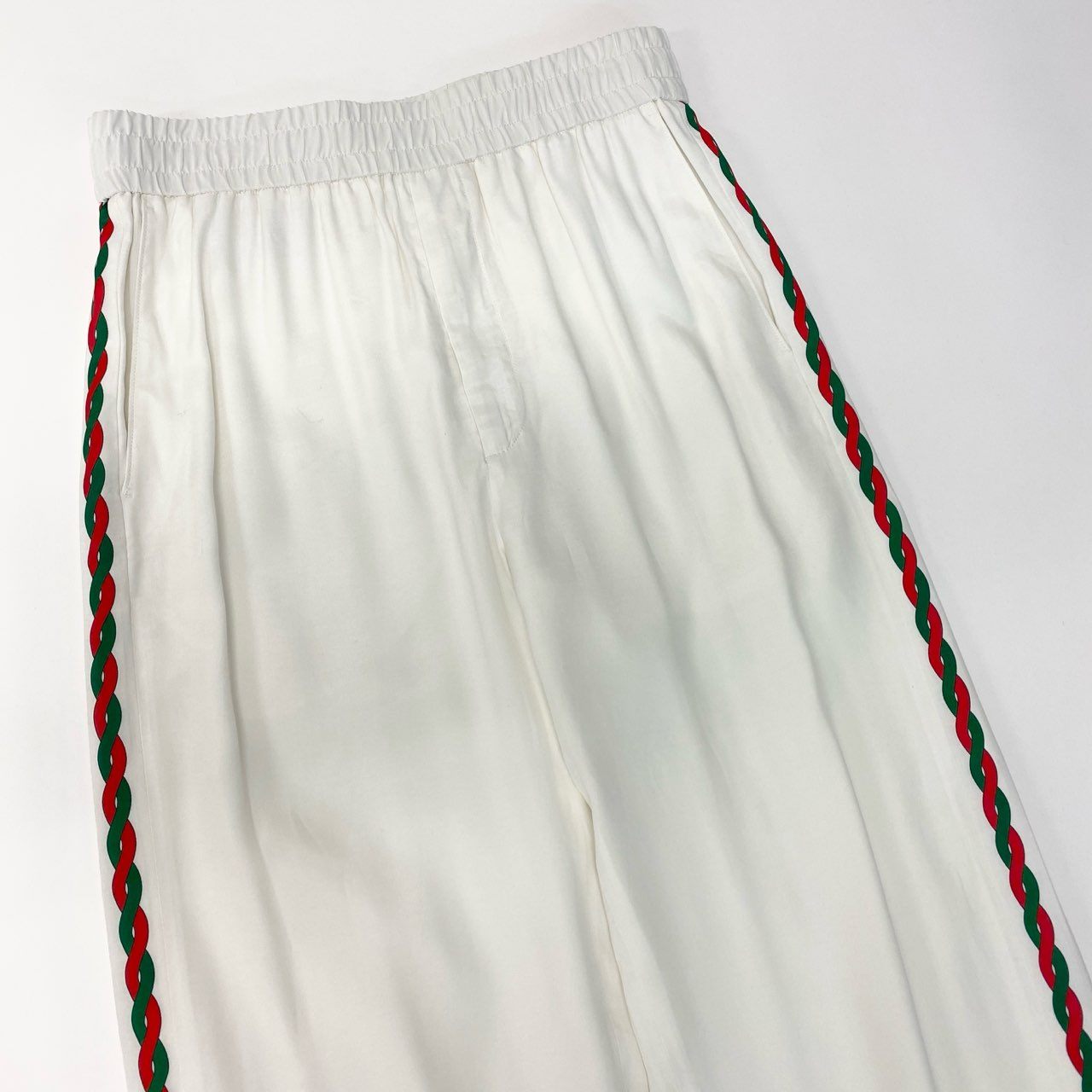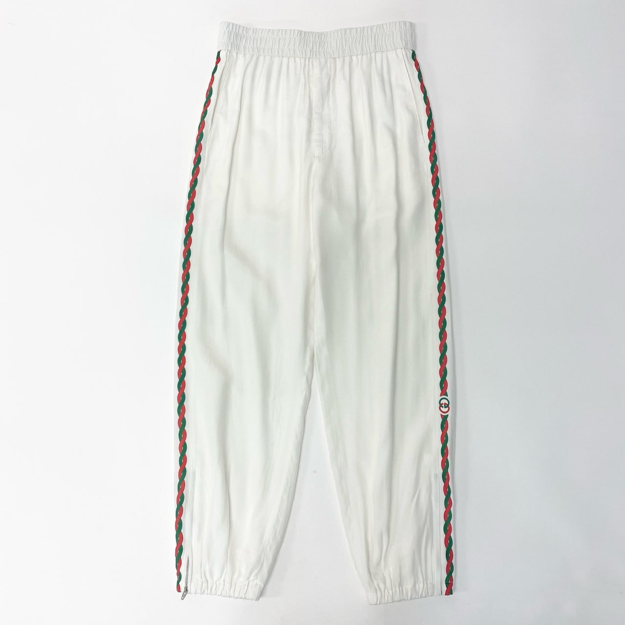 ホワイトカラーが爽やかな印象の、グッチのイージーパンツです。両サイドに施されたグリーン×レッドのロープラインとインターロッキングGディテールが、ブランドらしい存在感を演出しています。レーヨン100%素材で、落ち感があり滑らかな肌触りが特徴です。スニーカーやローファーとも相性が良く、リラックス感のあるラグジュアリーカジュアルスタイルにおすすめの一本です。