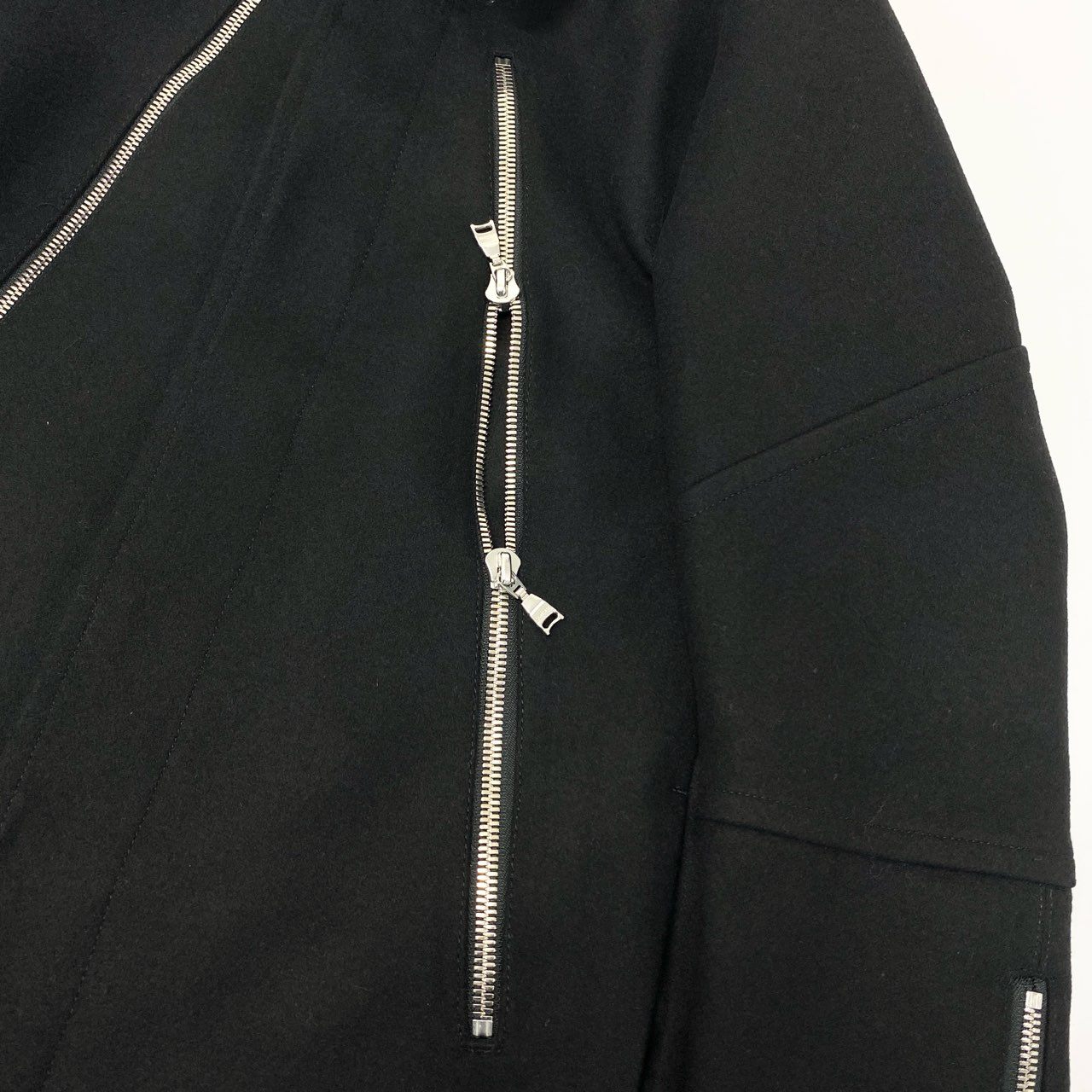 LOVELESS(ラブレス)のチェスターコート。深みのあるミッドナイトネイビーのウール素材で、マットながら上質な艶を感じさせる仕上がりです。胸元から裾に伸びるシルバーのロングジップがモードな印象を与え、袖口ジップなどのメタルディテールもアクセントに。シンプルながら存在感のあるデザインで、ビジネスからカジュアルスタイルまで幅広く活躍する一着です。
