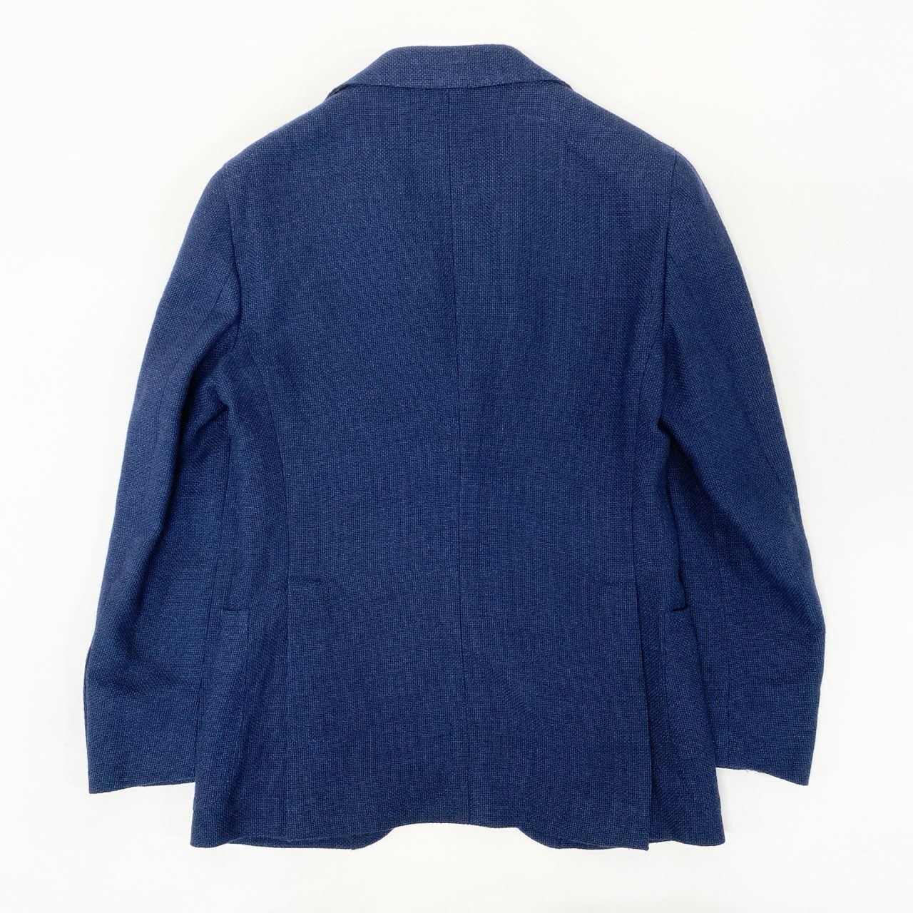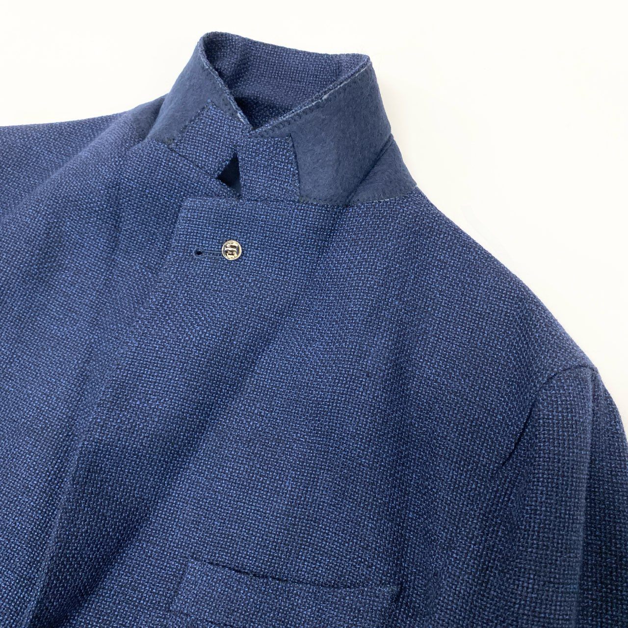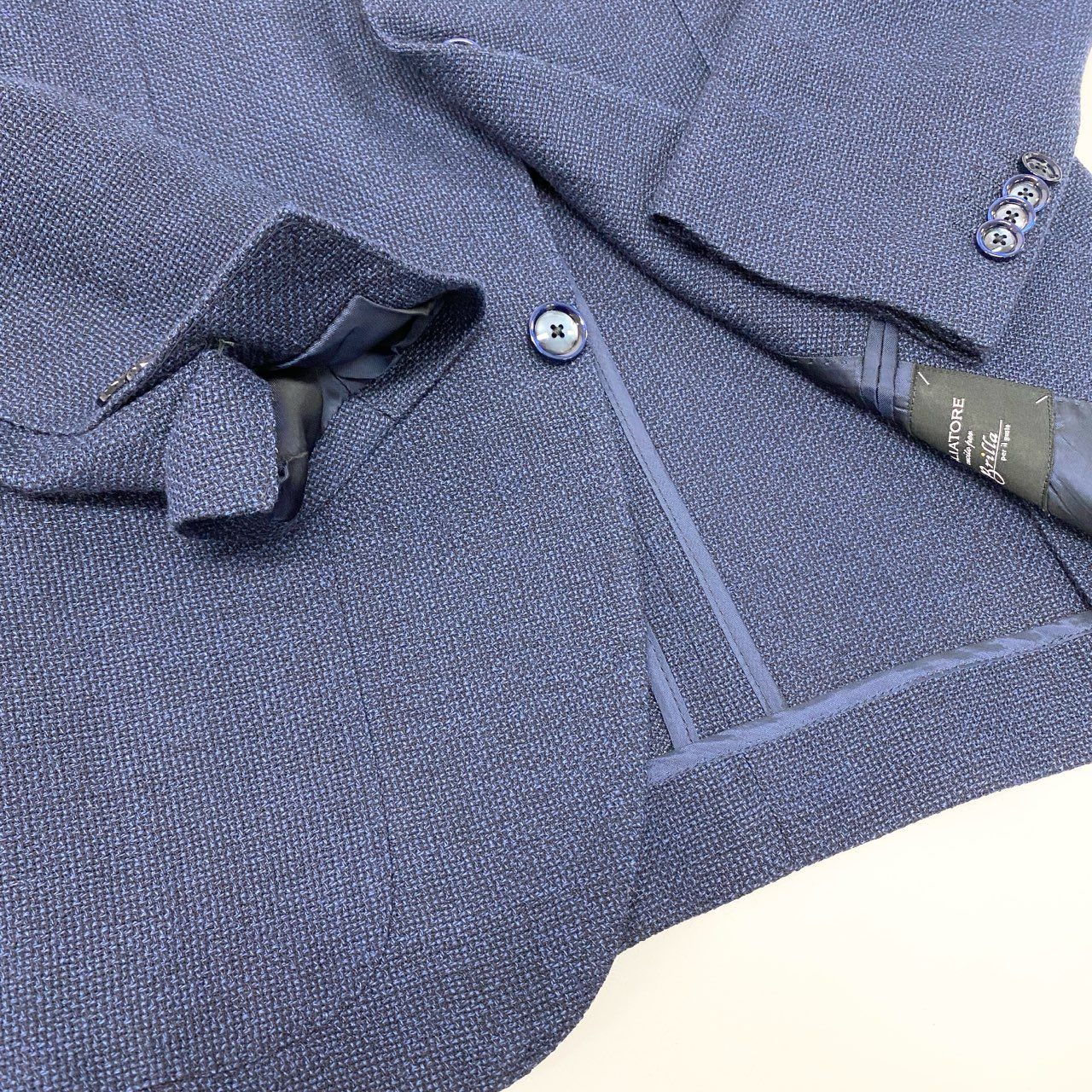 タリアトーレのテーラードジャケット「1SVF22K」、カラーは明るさのあるネイビーです。素材はウールリネンで、清涼感がありながら上品な質感を兼ね備えています。フロント2ボタン、袖の4つボタンといったクラシックなディテールに加え、ラペルピンがさりげないアクセント。イタリア製ならではの立体的な仕立てで、オンスタイルからジャケパンコーデまで幅広く活躍する一着です。