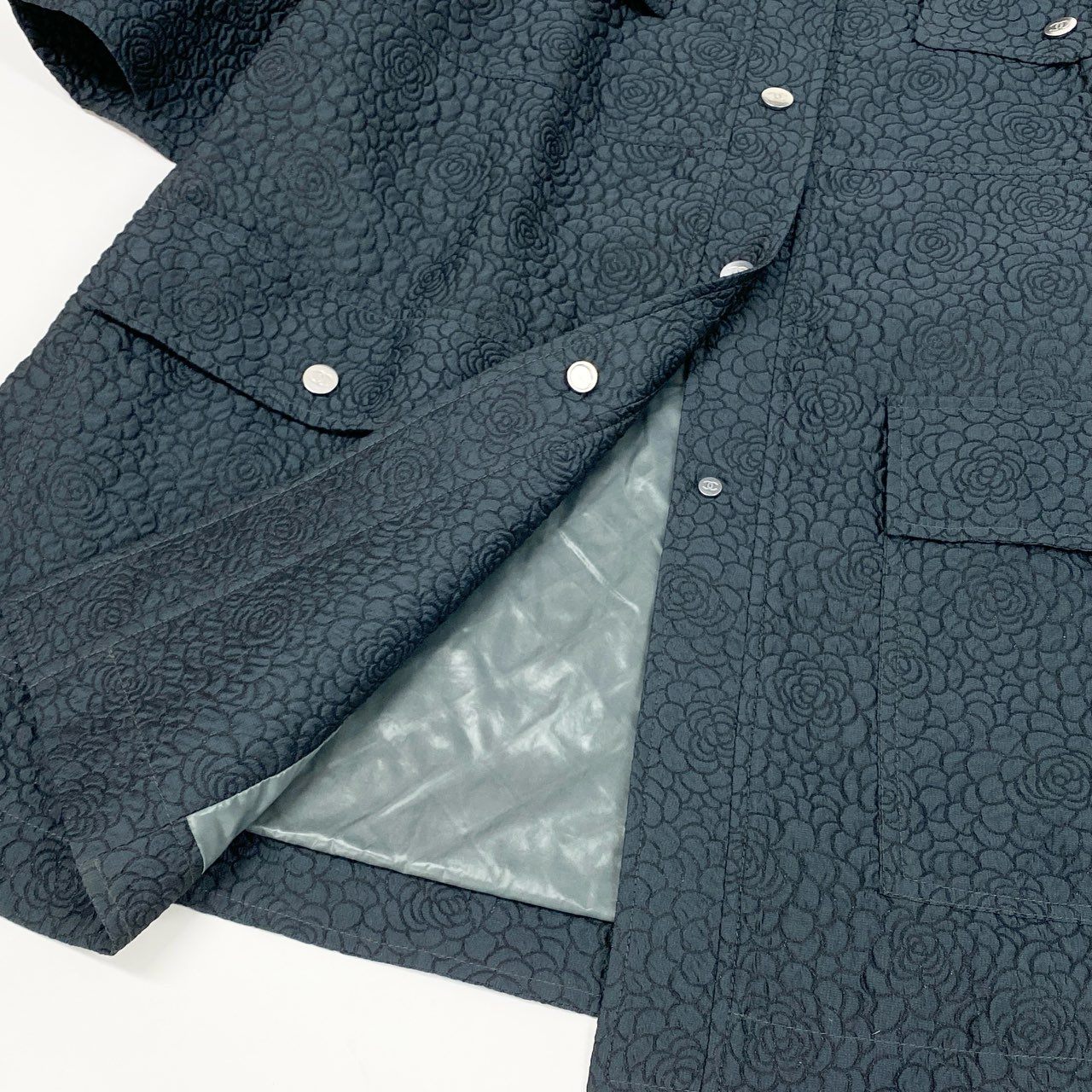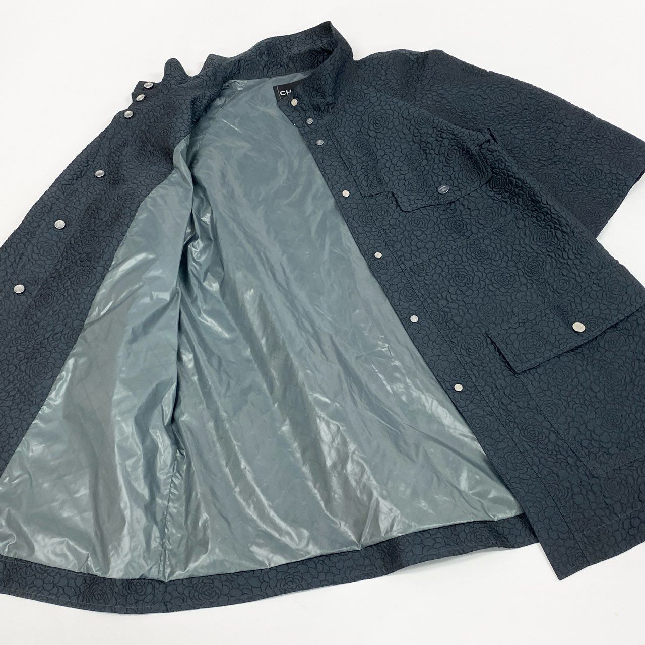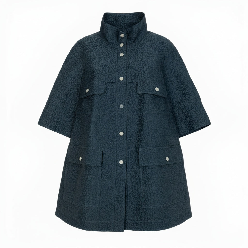 CHANELの2014年モデル(P46220V33837)ジャケットコートです。 色味は上品なネイビーで、全体にカメリア柄の織りがさりげなく入ったエレガントな表情。 マットでハリのある素材感に、スタンド襟・ココマークのメタルボタンがアクセント。 きれいめスタイルはもちろん、ワンピースの上に羽織っても映える、品格のある一着です。