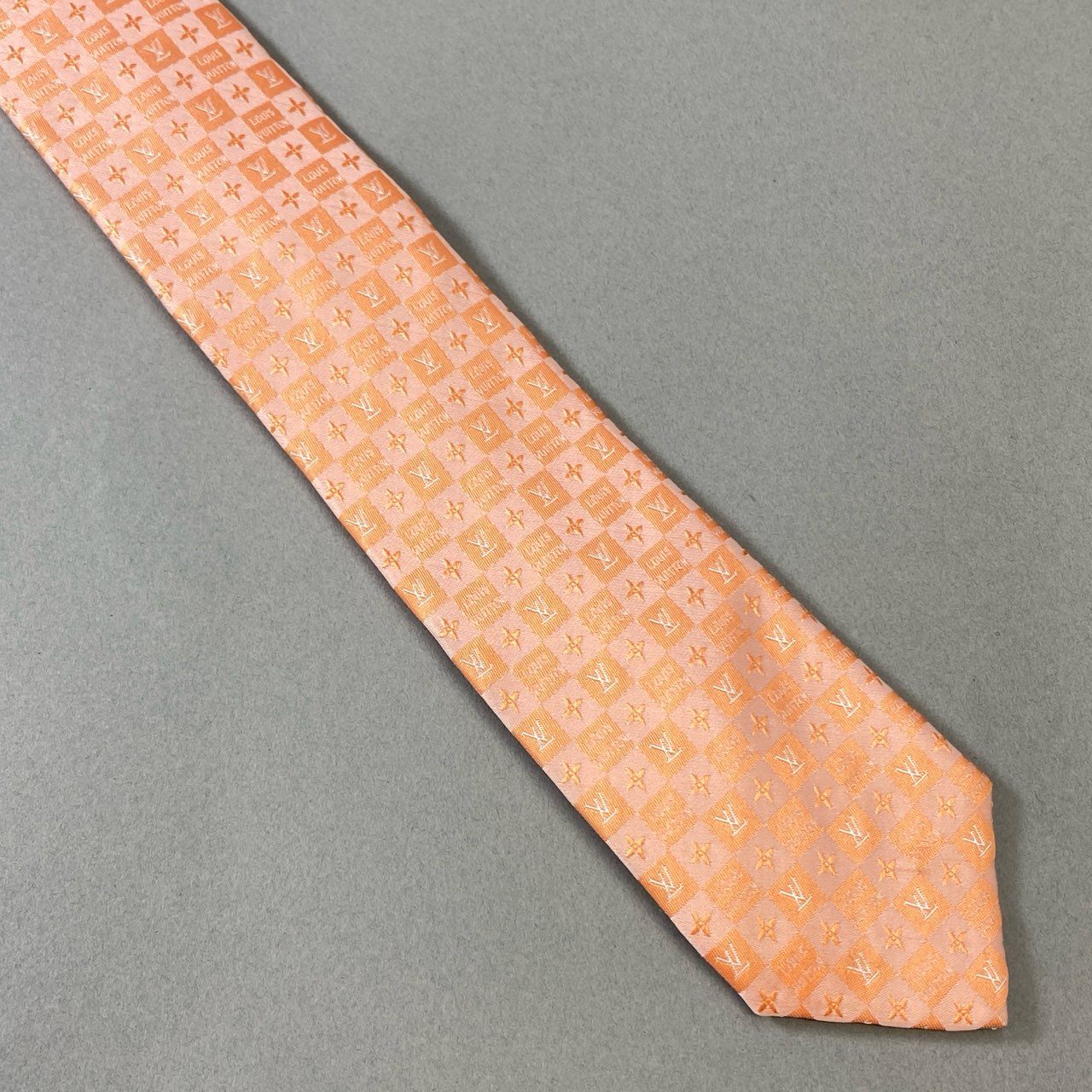 j16《極美品》LOUIS VUITTON ルイヴィトン ネクタイ シルク 絹100% フォーマル ダミエ LVロゴ ペールオレンジ メンズu02t