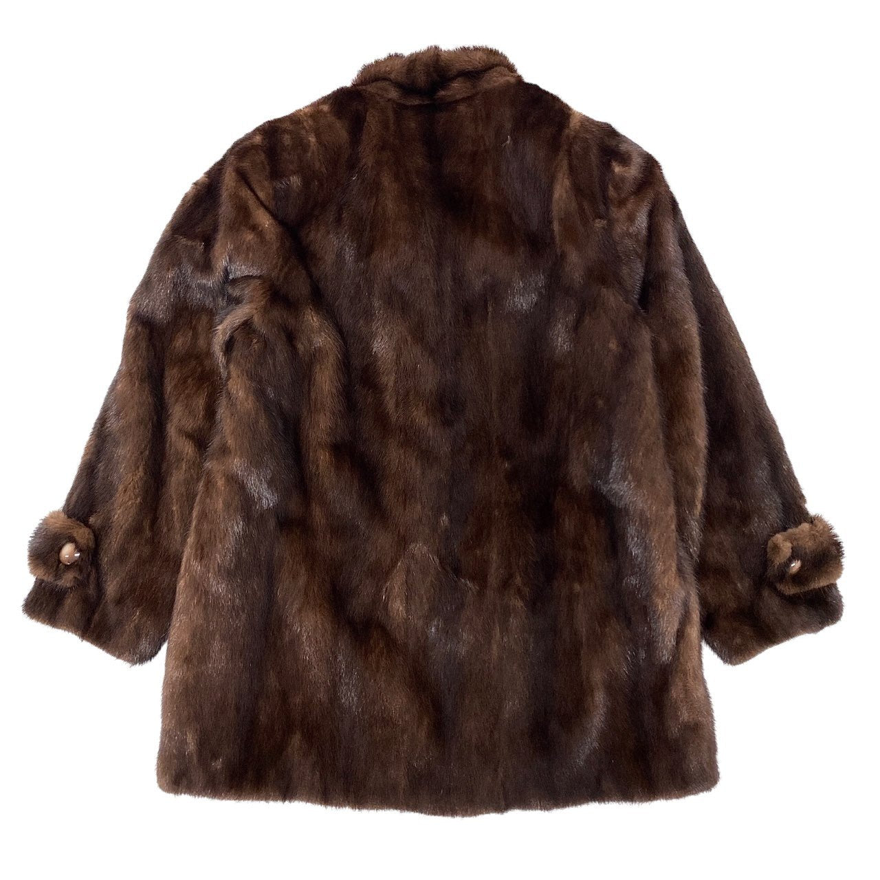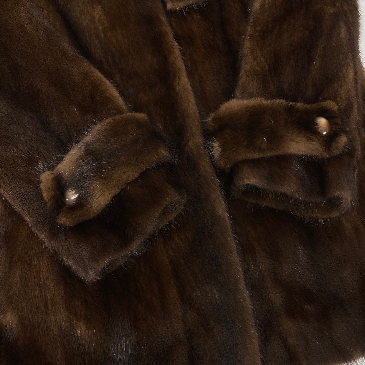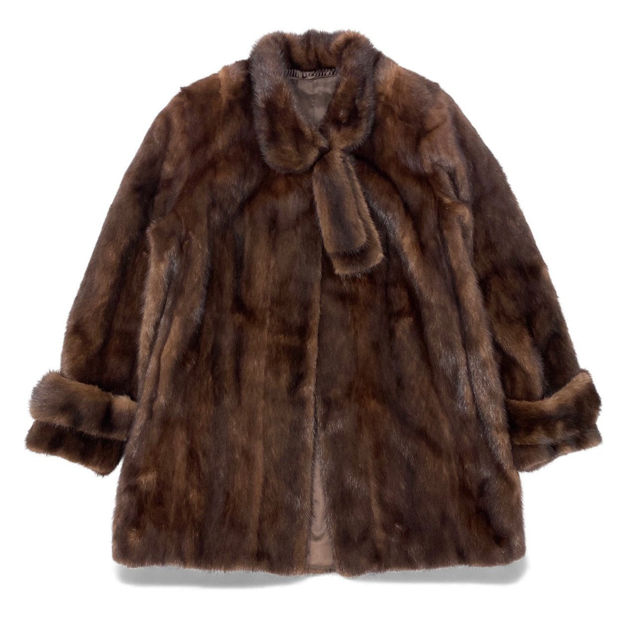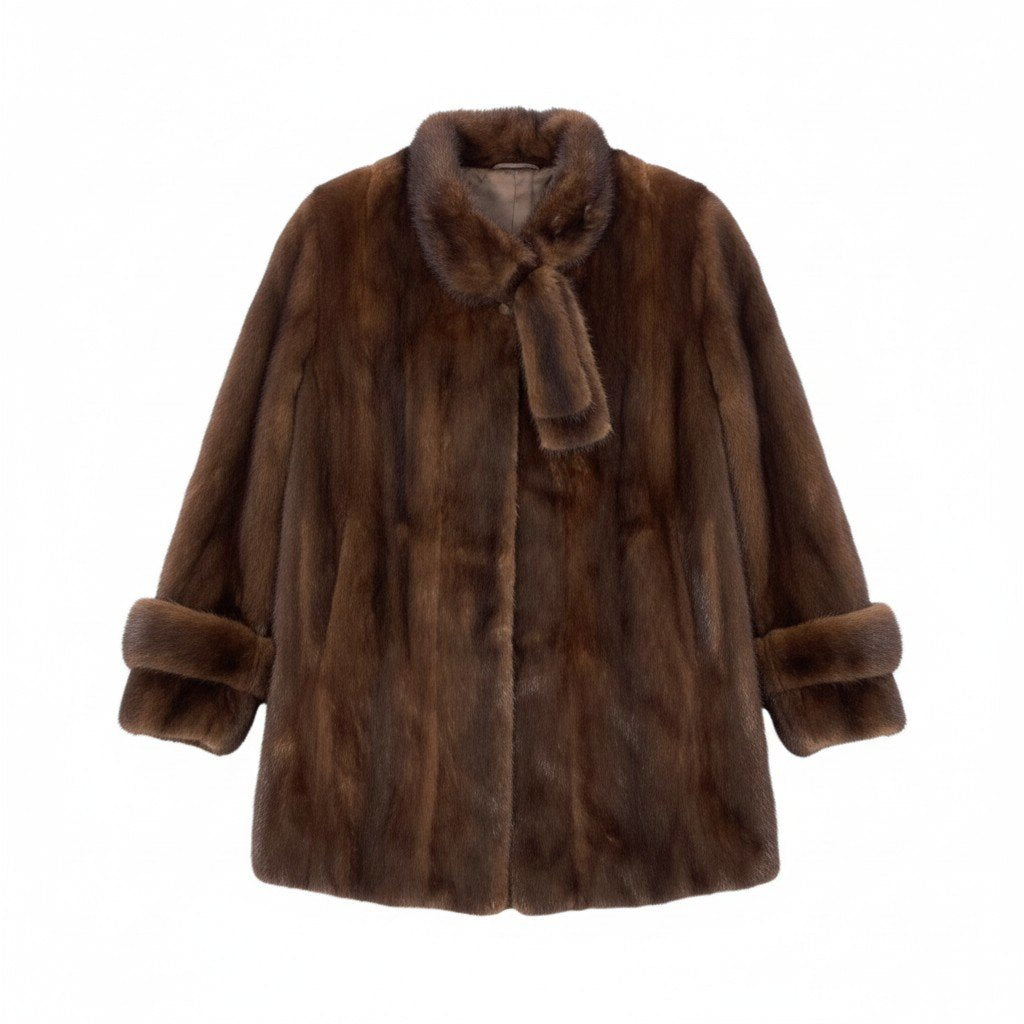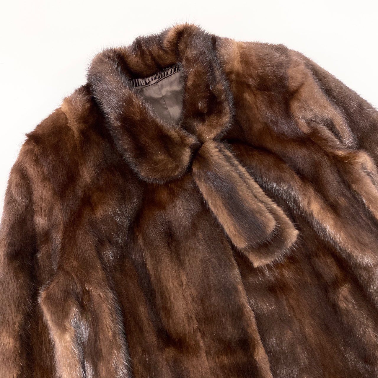 上質な光沢を放つ**デミバフミンク(SAGA / 銀サガ)**を使用したミドル丈コート。深みのあるブラウンカラーが上品で、毛足の密度も非常に高く、高級ミンクならではのなめらかな手触りが魅力です。襟元はクラシックなショールカラー風で女性らしい柔らかさを演出し、袖にはアームバンドが付き、シルエット調整が可能です。フォーマルシーンから特別なお出かけまで、冬のスタイルを格上げしてくれる一着。長く愛用いただける王道のSAGAミンクです。