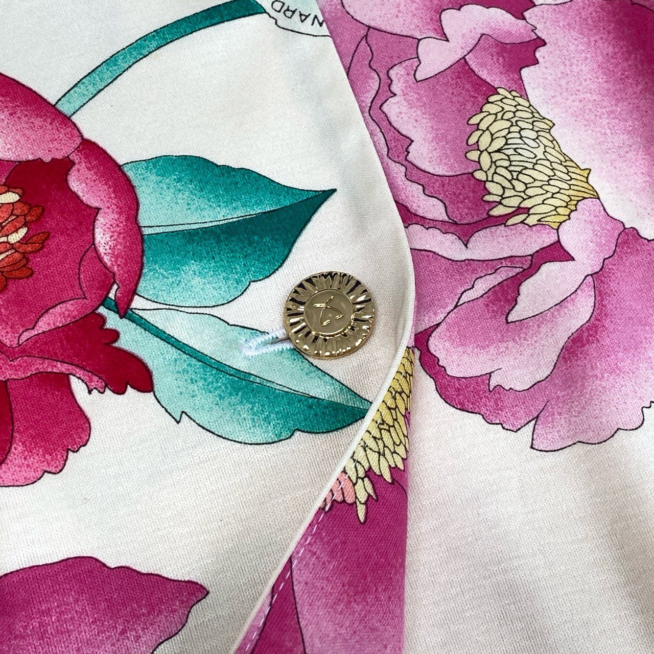 レオナールらしい華やかなフラワープリントが目を惹く半袖チュニックです。アイボリーをベースに、ピンク・レッド・イエローの大輪の花柄が映えるデザインで、コットン素材のやわらかな風合いが特徴です。ゴールド調のボタンや縁取りのパイピングが上品さをプラスし、日常使いからリゾートやお出かけシーンまで幅広く活躍します。1枚で主役になる華やかさがあり、パンツやレギンスとの相性も抜群です。