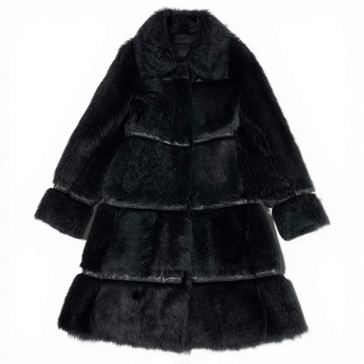 深みのあるブラックカラーが印象的な、プラダのヴィンテージファーコートです。 毛足の長いムートン(羊革)を贅沢に使用し、段切り替えデザインとレザートリミングが立体感と高級感を演出しています。 存在感がありながらも縦ラインを強調するシルエットで、スタイルアップ効果も期待できます。 真冬の外出やドレスアップシーンはもちろん、シンプルなコーディネートに羽織るだけで主役になる一着です。