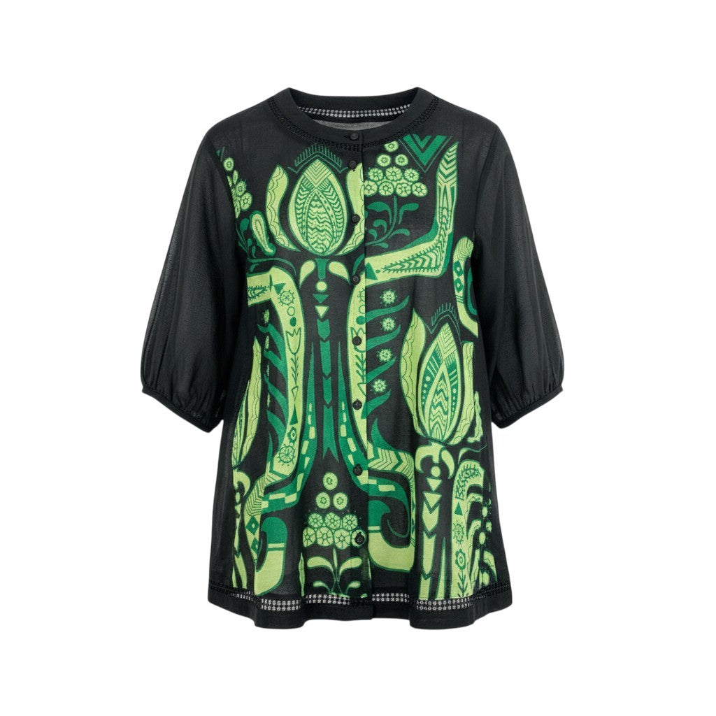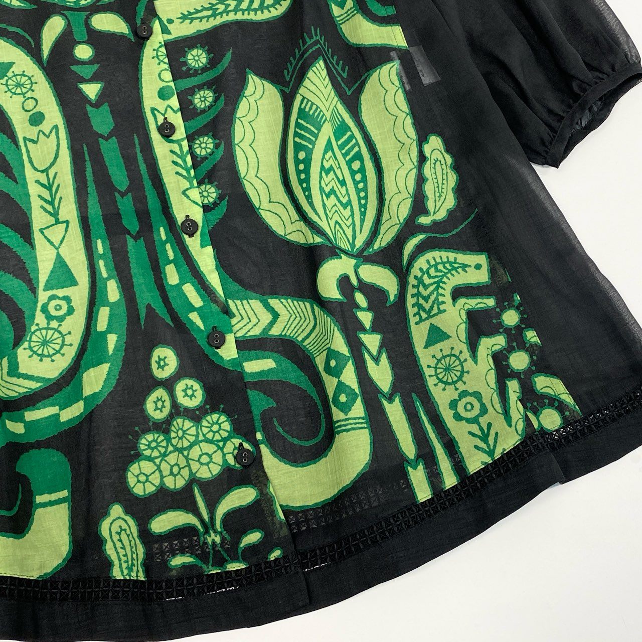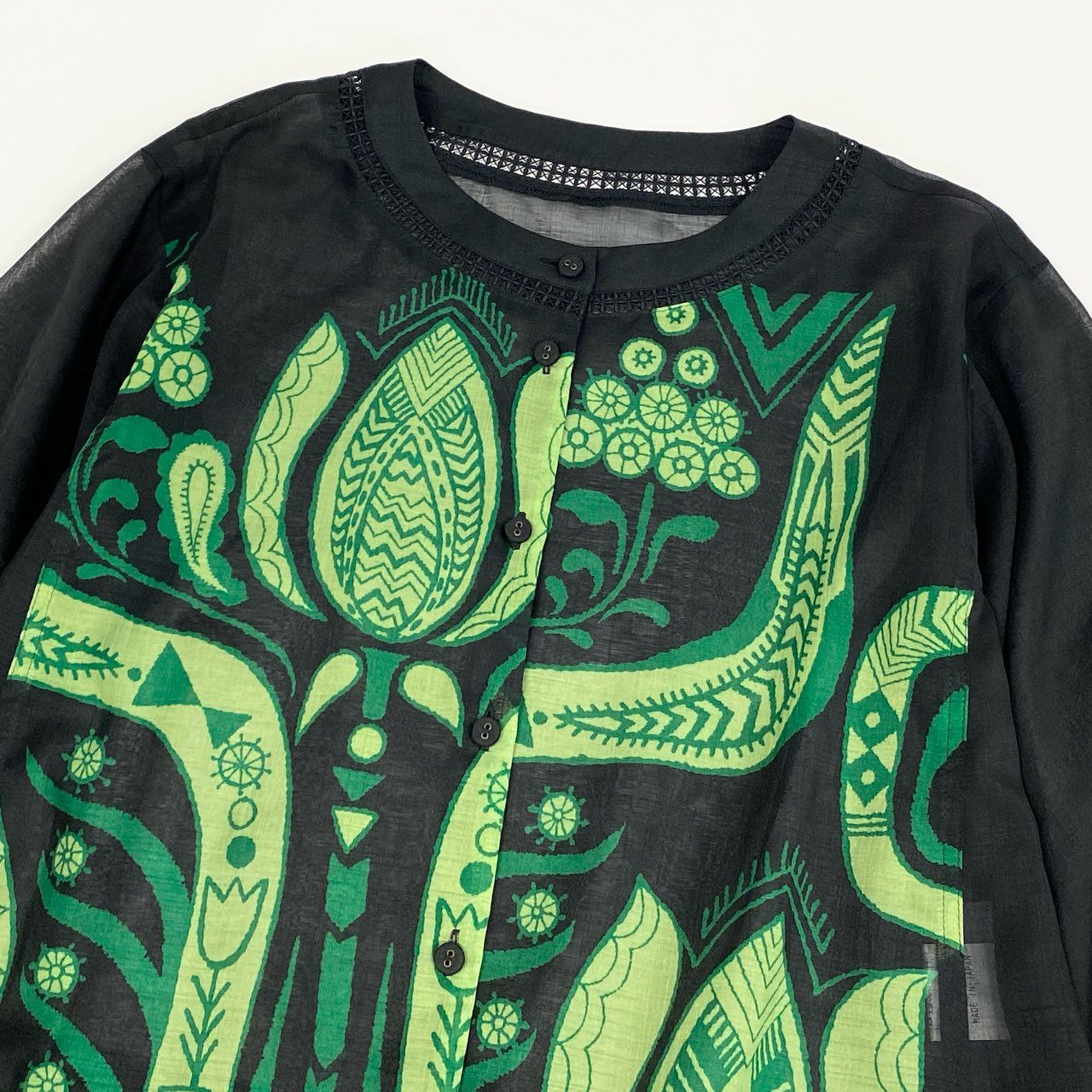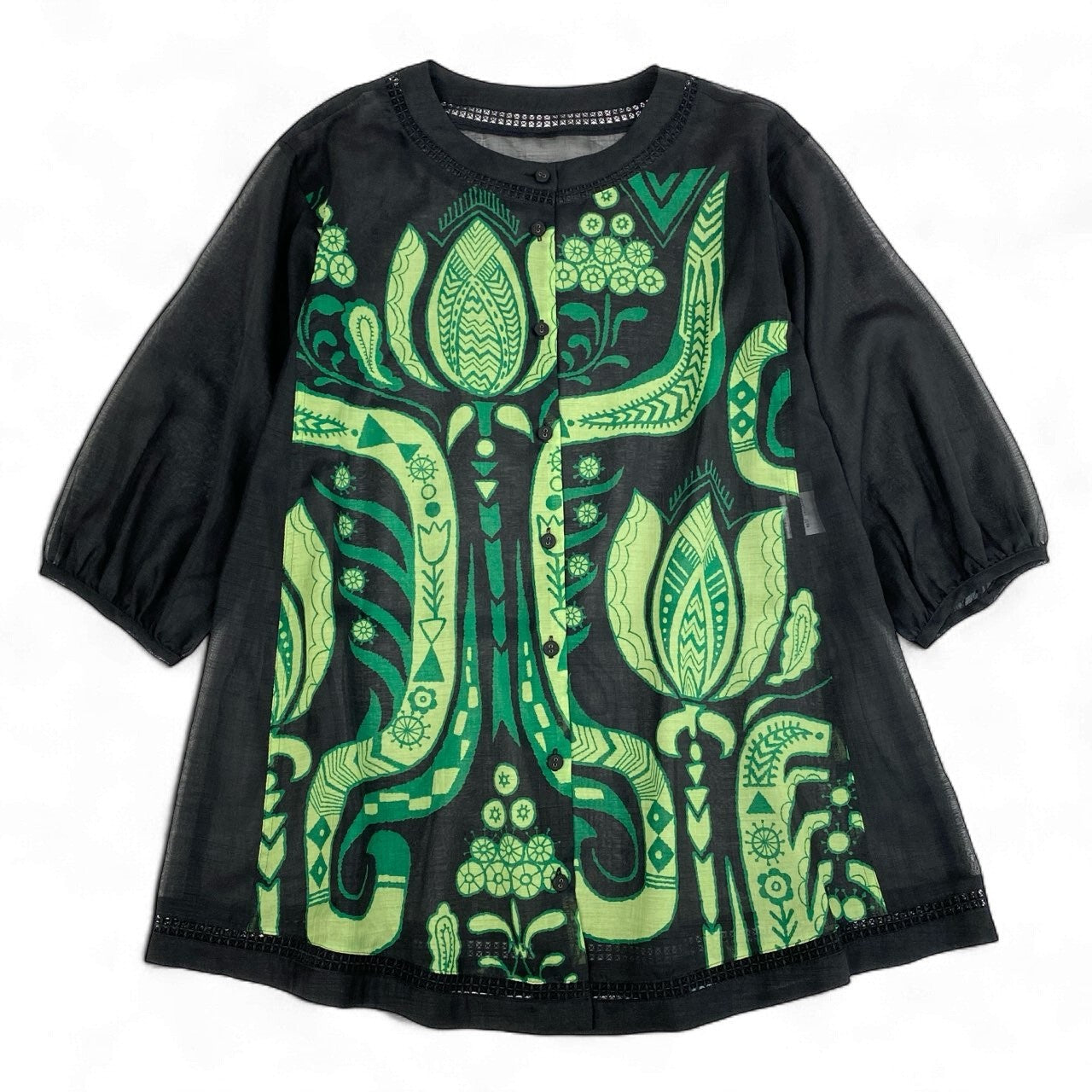 ブラックベースに エメラルドグリーン×ライトグリーンのアートフラワープリント が鮮烈に映える、トクコプルミエヴォルらしい個性派シアーチュニックシャツです。薄手のシアー素材は軽やかで通気性が良く、レイヤードするインナー次第で長い季節活躍します。フロントには細かなボタンとレース風カットワークが施され、上品さと存在感を両立。ヒップをしっかり隠せる丈感で、パンツ・レギンスコーデとも相性抜群の一着です。