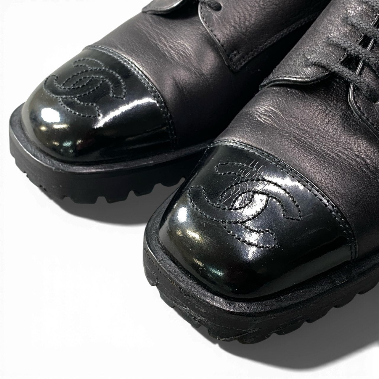 ブラックカラーのレザーを使用した、シャネルのレザーシューズです。つま先には艶のある切り替えとココマークのディテールを配し、上品さの中にブランドらしいアクセントを効かせています。マットなレザーと光沢のあるトゥ部分のコントラストが、足元を引き締める印象です。パンツスタイルはもちろん、スカートやワンピースにも合わせやすく、通勤やきれいめカジュアルに活躍する一足です。