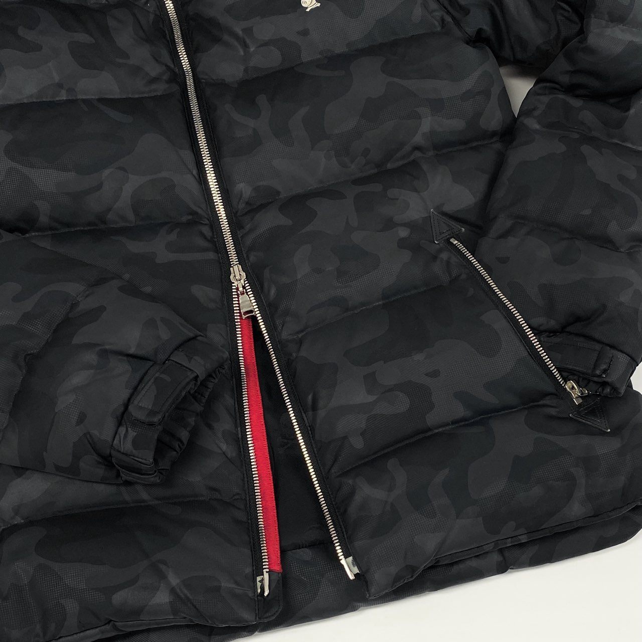 LOVELESS(ラブレス)のカモフラージュ柄ダウンジャケット。マットなブラックトーンに同色のカモパターンを重ねた洗練デザインで、左袖のスカル&クロスボーン刺繍がブランドらしい個性を演出します。高品質ホワイトグースダウンを使用し、軽量ながら抜群の保温性を実現。メタルジップや赤のインナーラインがアクセントとなり、都会的な冬のスタイルに映える1着です。