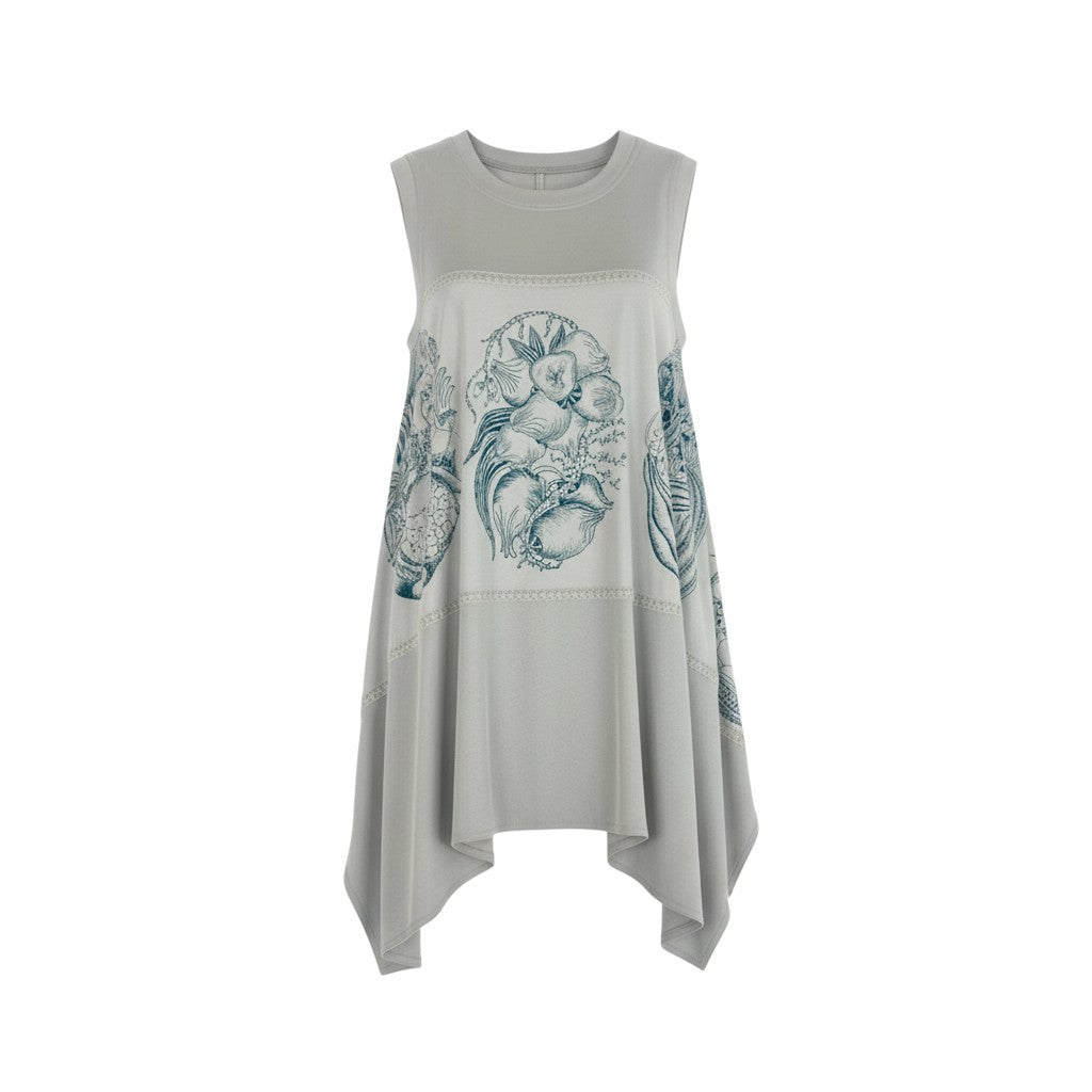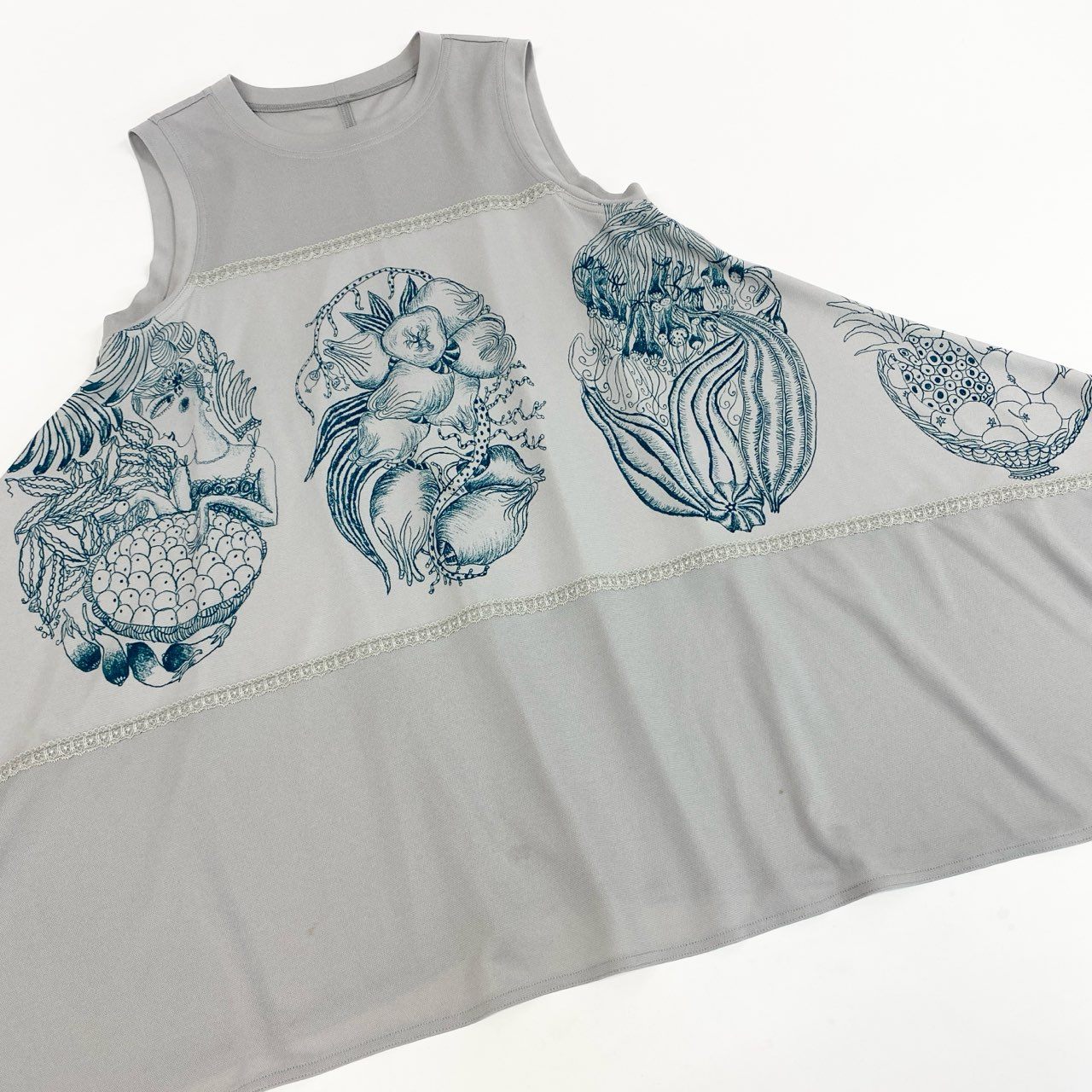 落ち着いた グレー系カラーにアートタッチのイラストプリント が映える、TOKUKO 1er VOL らしい個性あふれるノースリーブワンピースです。さらりとした軽やかな生地感で、1枚ではもちろんタートルニットやカットソーとのレイヤードも楽しめます。ミニ丈のコンパクトなバランスがスタイルを綺麗に見せ、日常使いからお出かけ、旅行シーンまで幅広く活躍。コーディネートの主役として、季節を問わず長く楽しめる一着です。