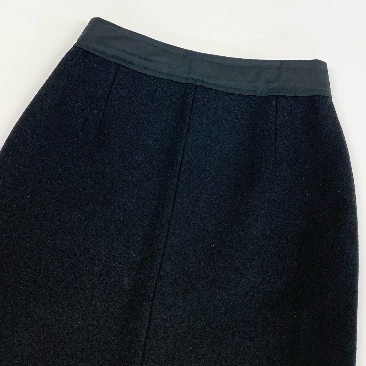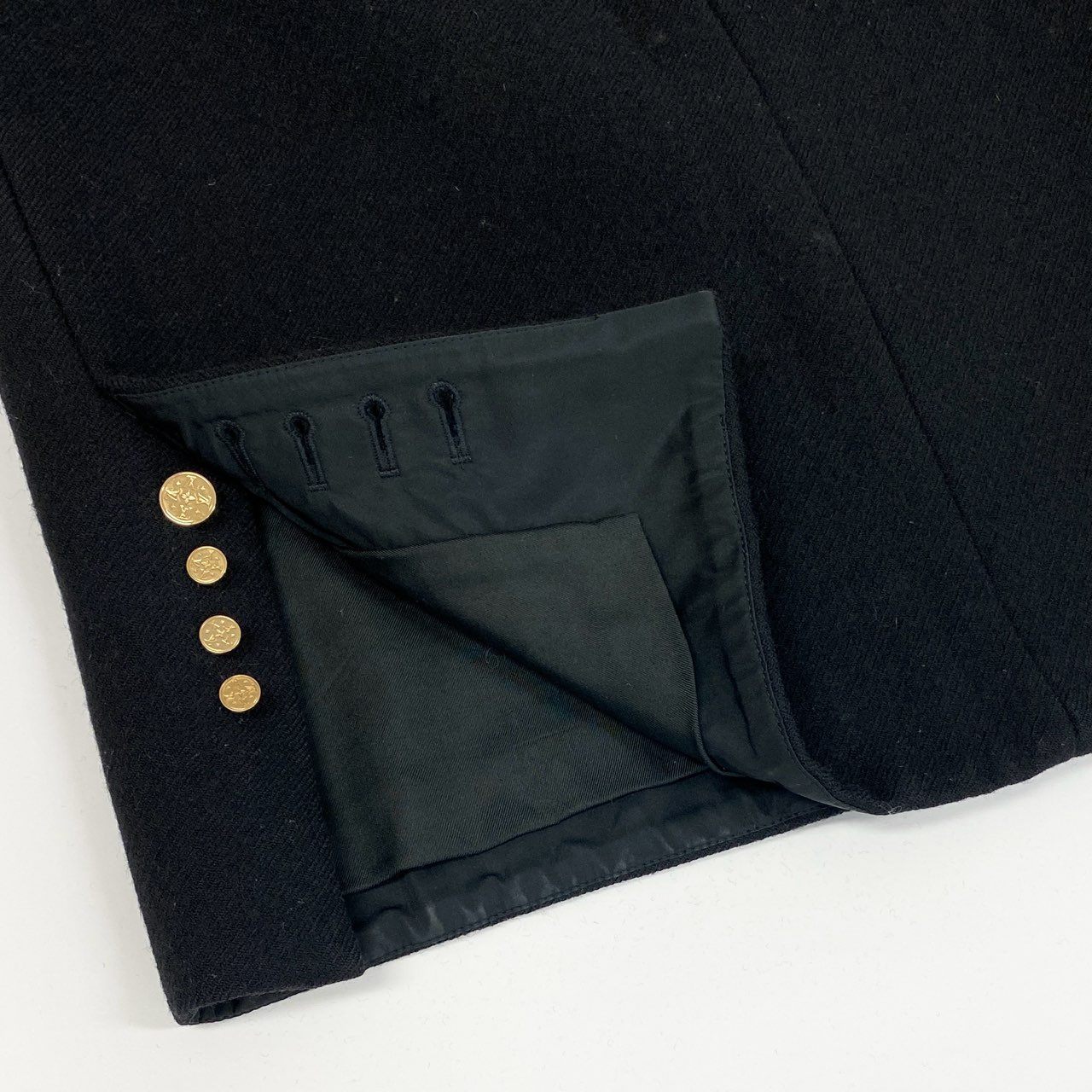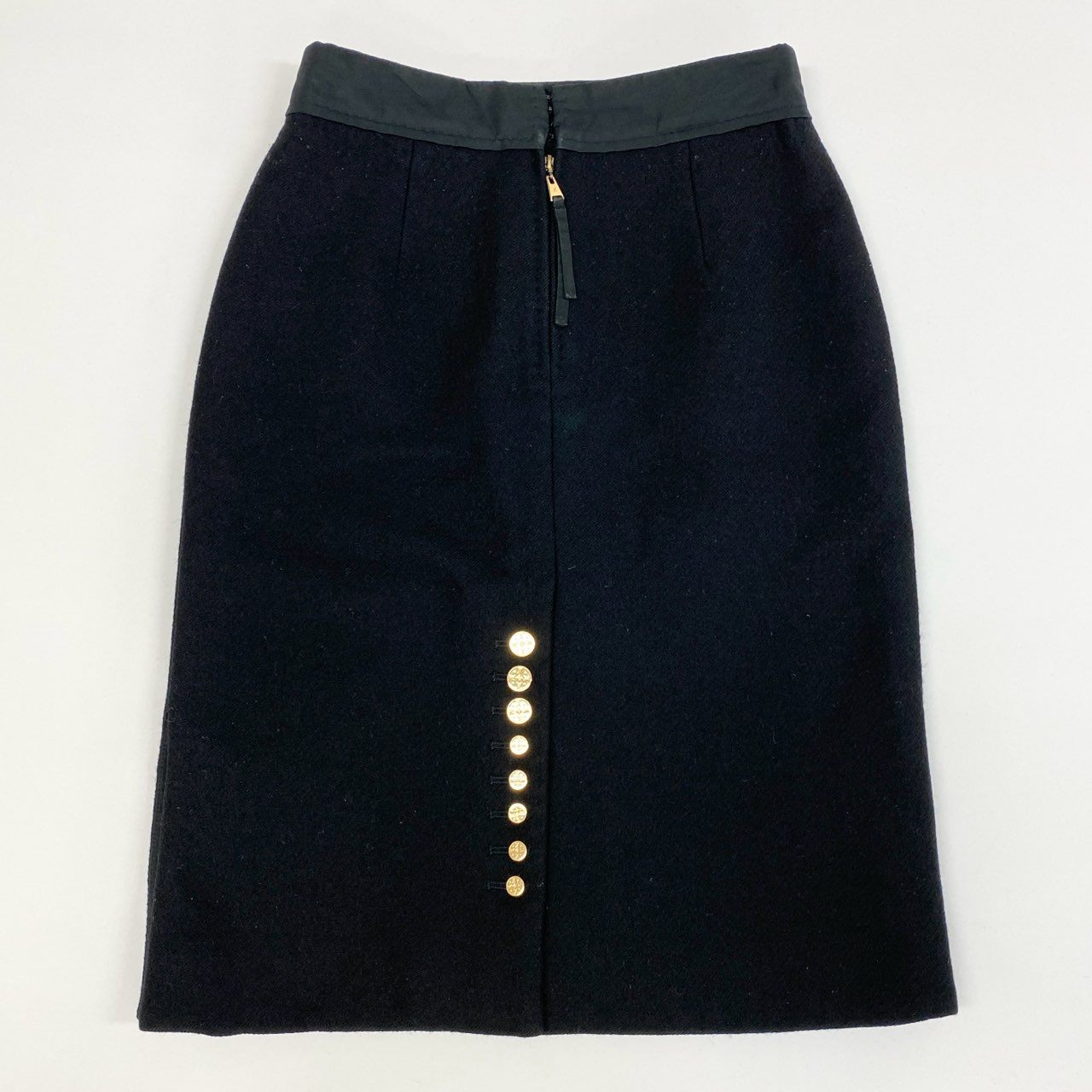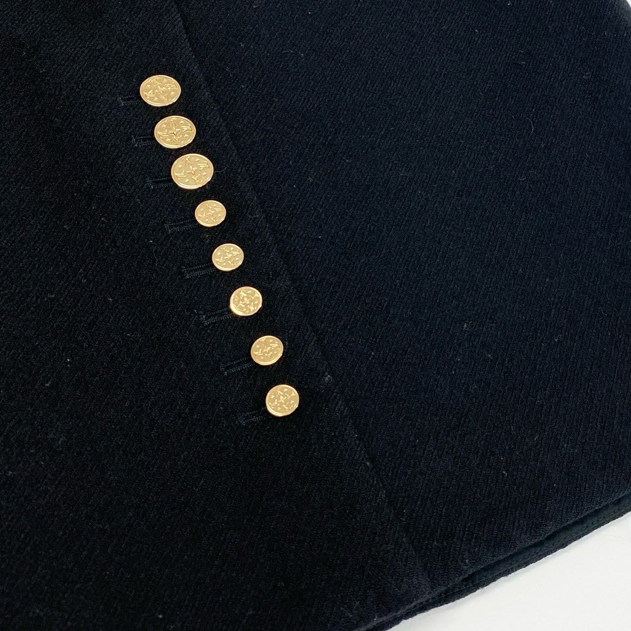 ルイヴィトンのウール製ひざ丈スカート。深みのあるブラックカラーに、裾サイドにあしらわれたゴールドのメタルボタンがラグジュアリーなアクセントを加えています。上質なウール素材が持つ温かみとマットな質感が、大人の女性らしさを演出。シンプルながらディテールに品格があり、ジャケットやブラウスとのコーディネートに最適。フォーマルシーンやオフィススタイルに重宝するエレガントな一着です。