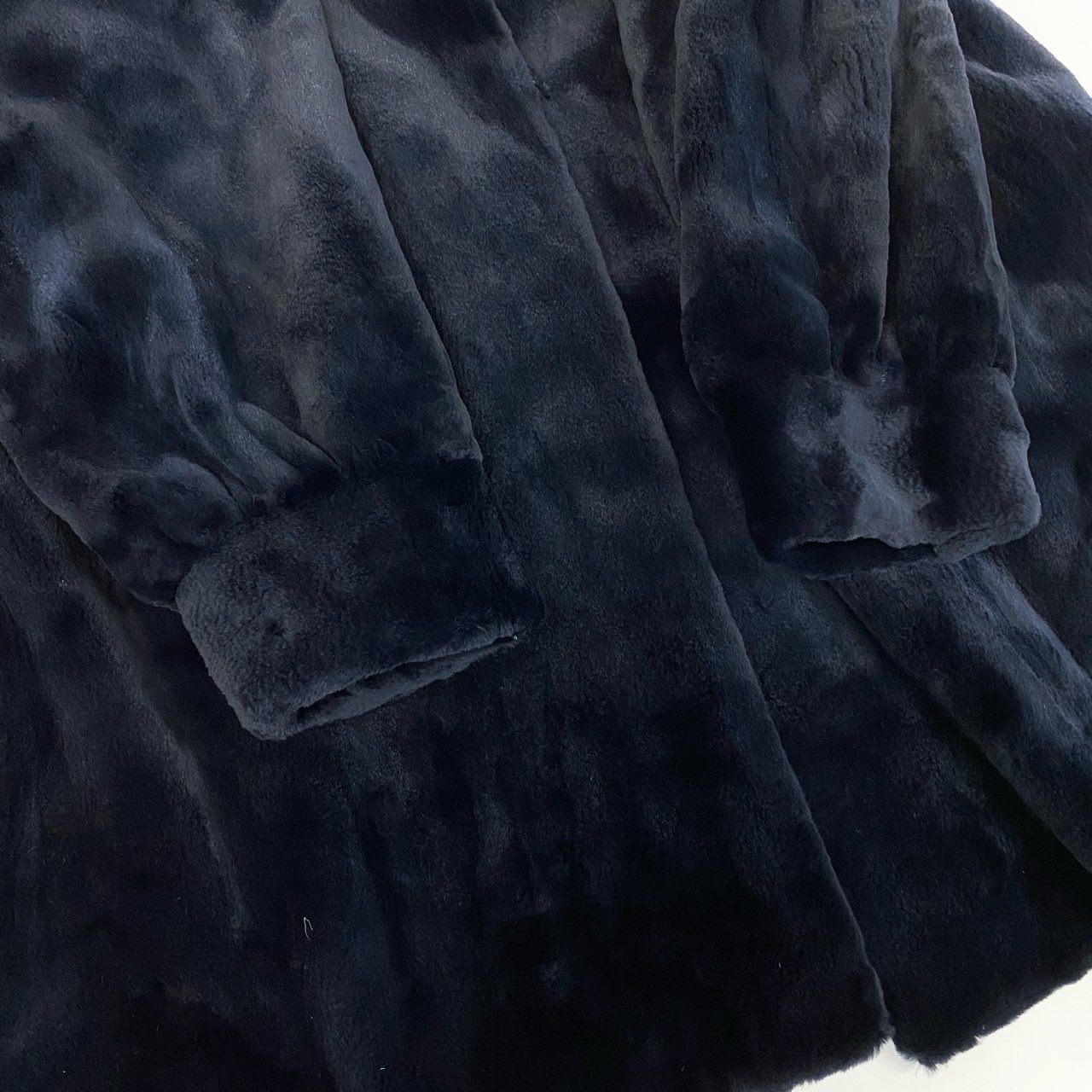 深みのあるダークネイビーに染め上げられたシェアードミンクファーコートです。毛足を短く整えたシェアード加工により、ビロードのように滑らかな質感と上品な光沢感が際立ちます。無地のミニマルなデザインに、立体感のあるスタンドカラーがエレガントな印象を演出。ドレスやセットアップはもちろん、シンプルなニットスタイルに合わせるだけで格調高い装いに仕上がる、特別感あふれる一着です。