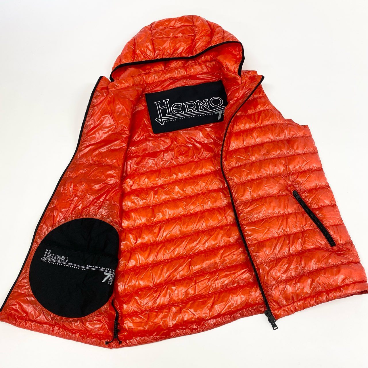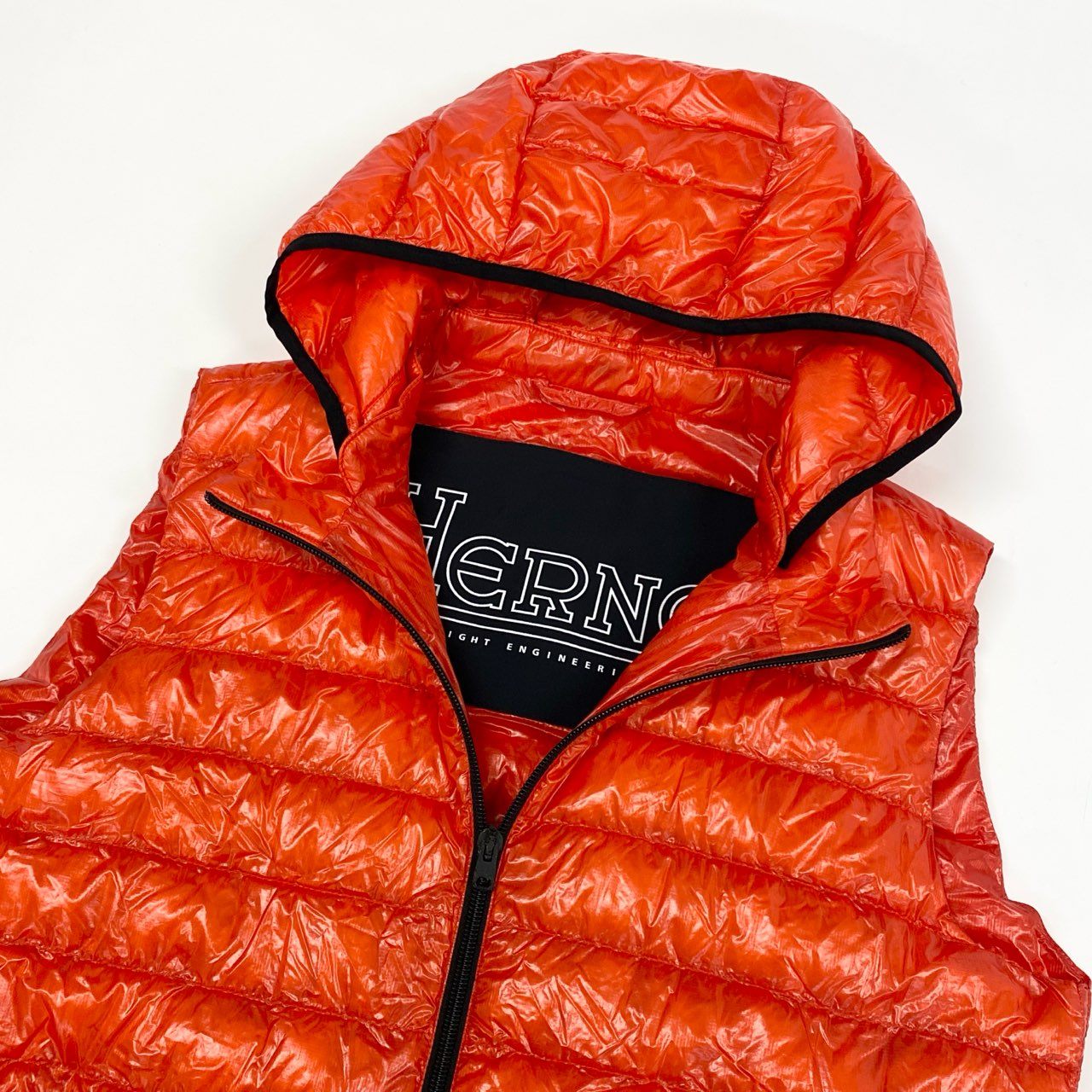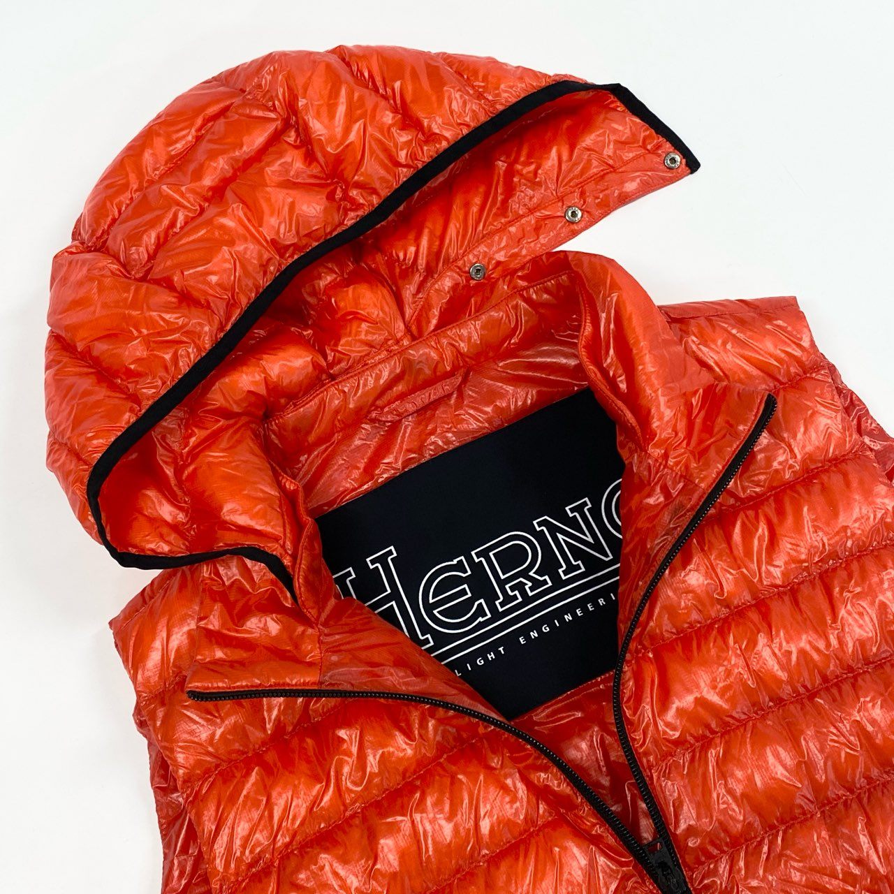 ヘルノの「17478-16333-3」フード付きライトダウンベスト。艶のあるブリックオレンジが印象的で、スタイリングのアクセントにも最適です。光沢ナイロン素材が上品なスポーティ感を演出し、ジップポケットやパイピングがシャープな印象に。軽量で着心地も抜群、フードは着脱可能で機能性も高く、タウンユースからアウトドアまで幅広く活躍する一着です。