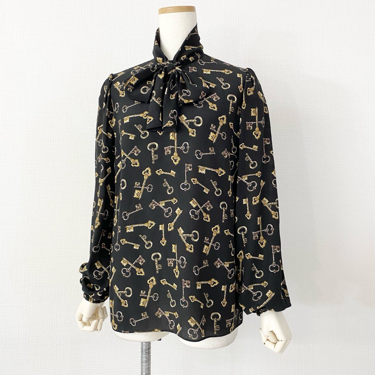 17f14 【美品】 DOLCE&GABBANA ドルチェ&ガッバーナ ボウタイ シルクブラウス 総柄ブラウス カギ キーデザイン サイズ40 ブラック シルク100% レディース