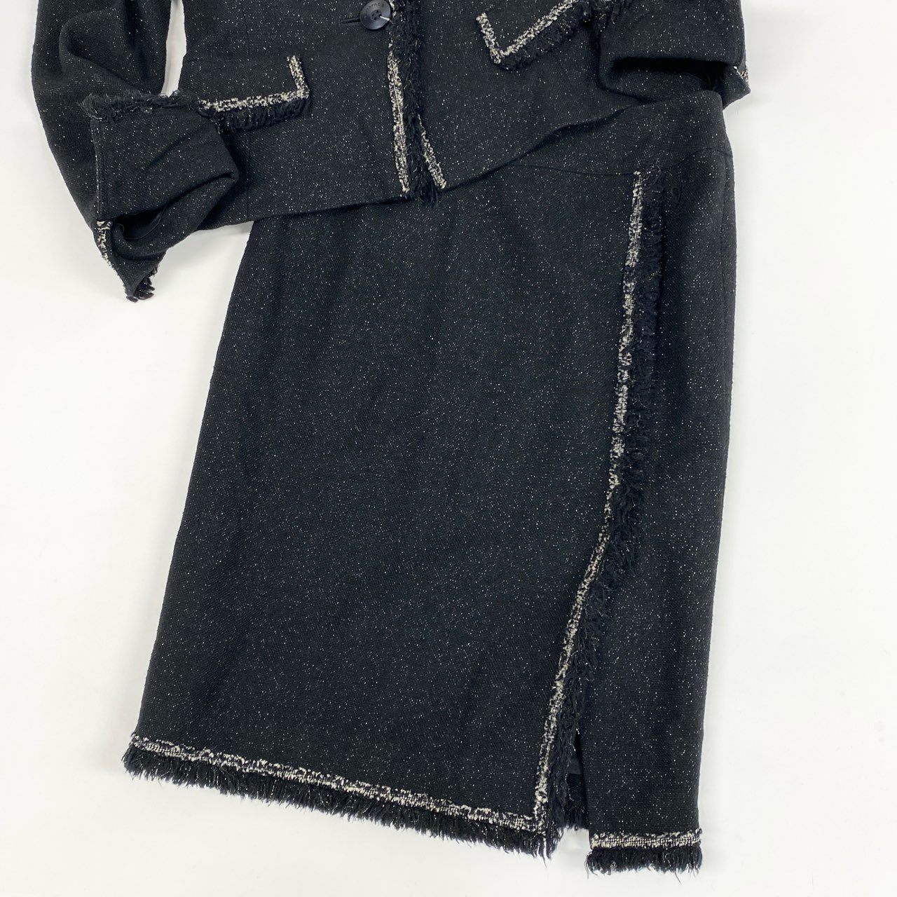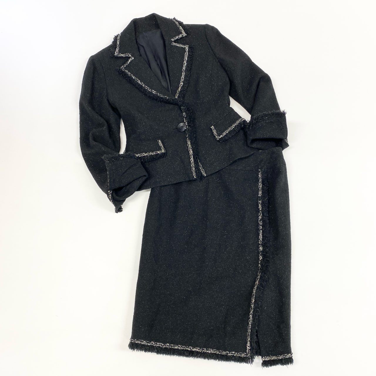 NOVESPAZIO(ノーベスパジオ)のツイードセットアップ「033-250920」。上品なブラックツイード生地にシルバーラメ糸の縁取りが施された、華やかでクラシカルなデザイン。マットなウール調素材が季節感を演出し、1つボタンのジャケットとスリット入りスカートが女性らしいシルエットを引き立てます。ビジネスからセレモニーまで、品格ある大人のスタイルを完成させる一着です。