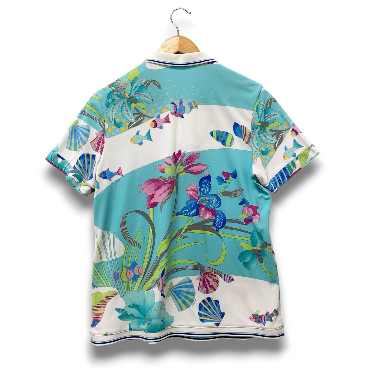 LEONARD らしい華やかなプリントが目を引く半袖ポロシャツです。ターコイズブルーを基調に、花柄や魚モチーフが描かれたマルチカラープリントが特徴的なデザイン。素材はさらりとしたマットなポリエステル生地で、軽やかで快適な着心地に仕上がっています。スポーティーなポロデザインにエレガントなアートプリントを組み合わせた一着で、リゾートスタイルやカジュアルコーデの主役として活躍します。
