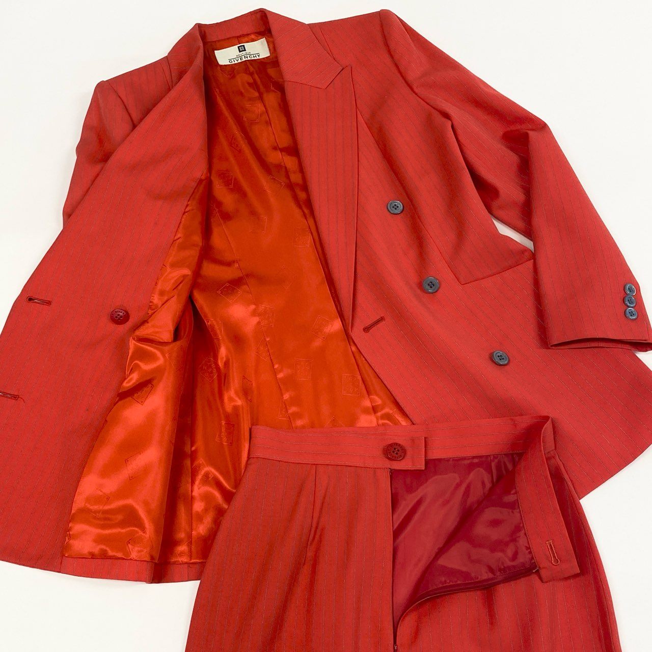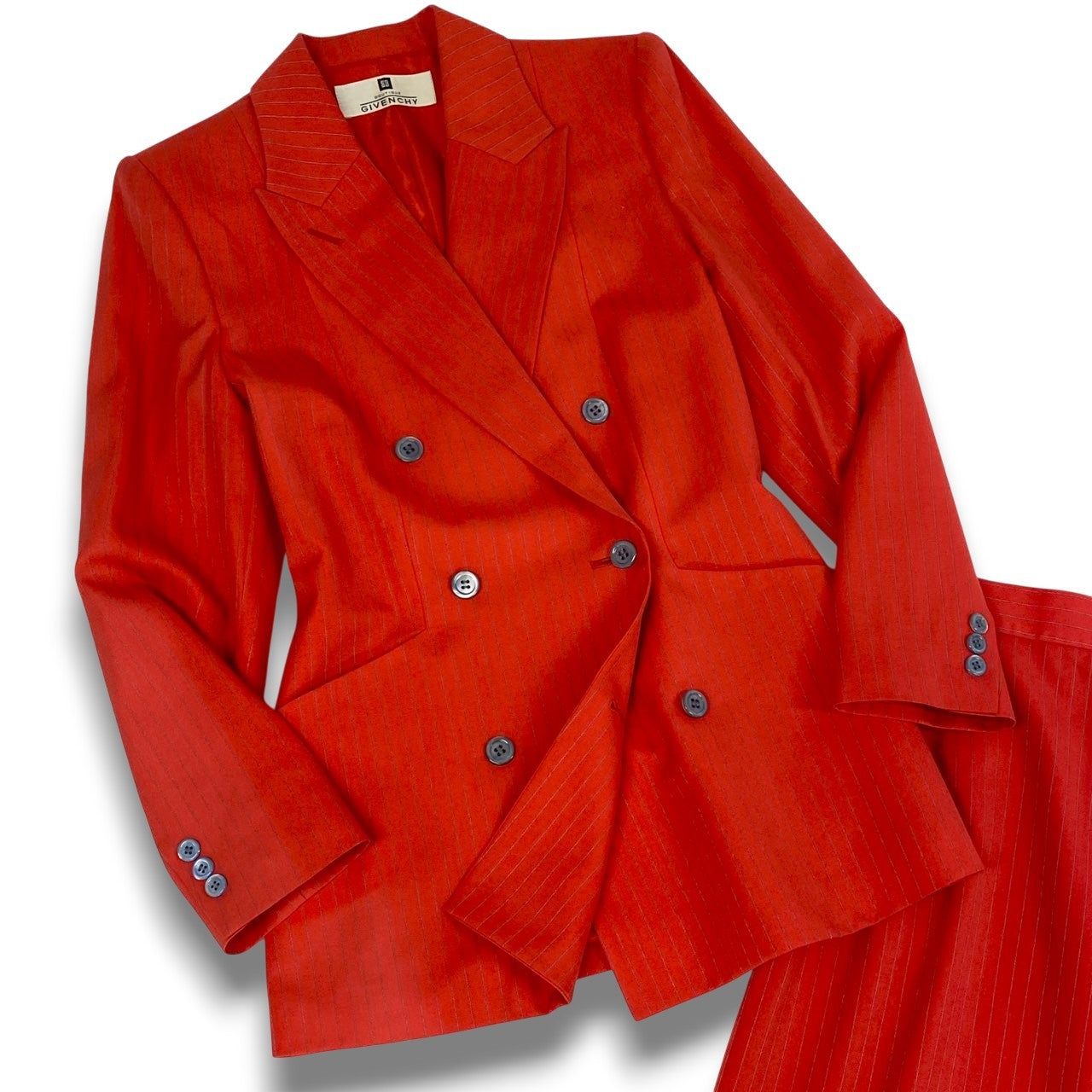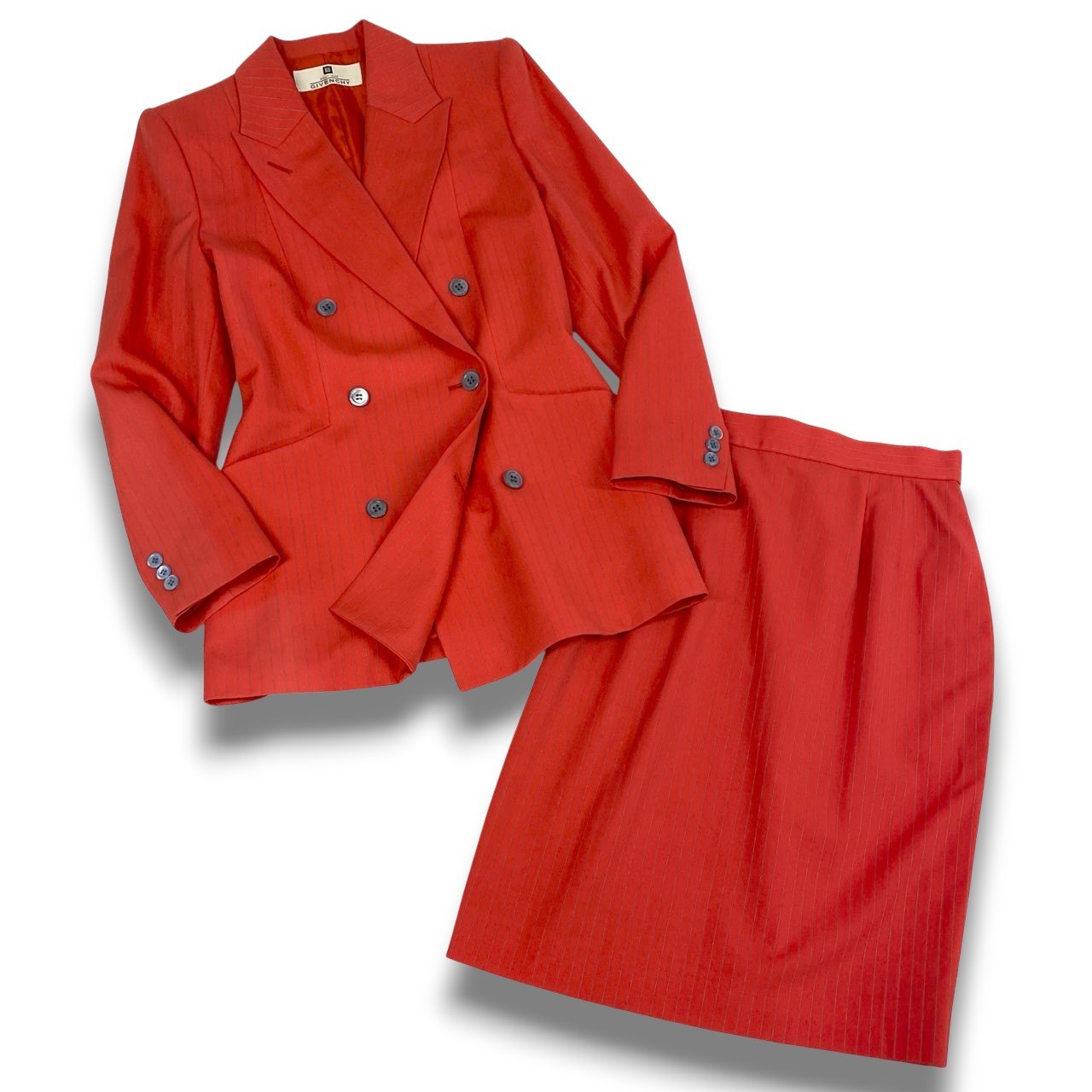 鮮やかなトマトレッド系カラーが印象的なジバンシーのスカートスーツセットアップです。細かなストライプ織りの入った上質でマットなウール調素材が、シャープで洗練された雰囲気を演出します。ダブルブレスト仕様にダークトーンのボタンがアクセントとなり、ウエストを美しくシェイプした立体的シルエットが魅力です。ビジネスシーンやフォーマルな場面はもちろん、式典やパーティーシーンでも存在感を放つ一着です。