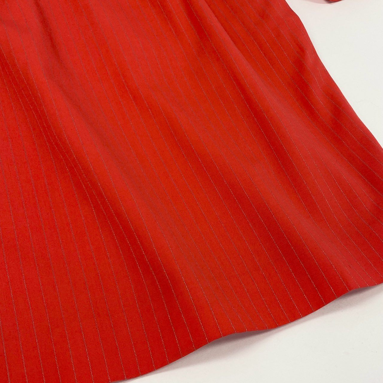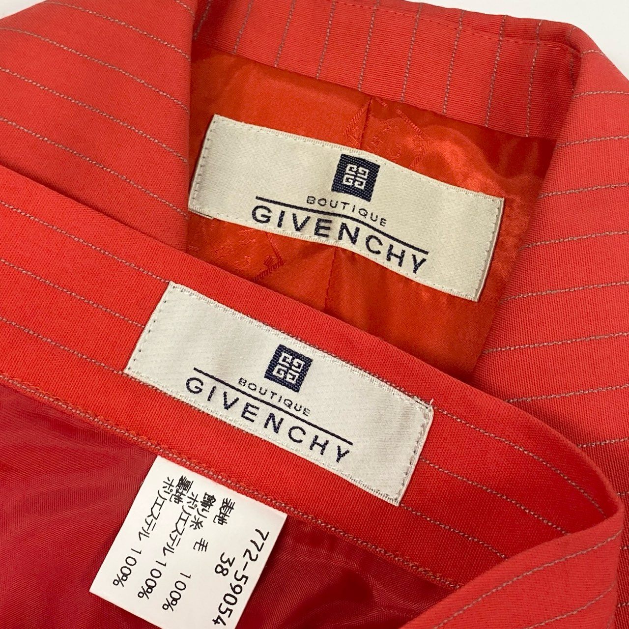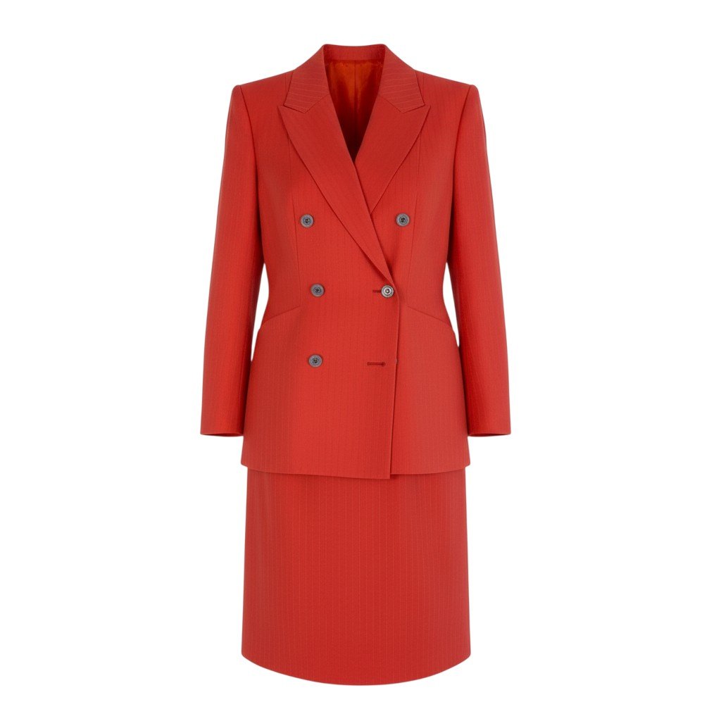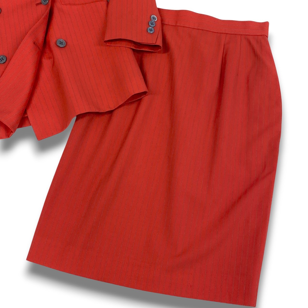 鮮やかなトマトレッド系カラーが印象的なジバンシーのスカートスーツセットアップです。細かなストライプ織りの入った上質でマットなウール調素材が、シャープで洗練された雰囲気を演出します。ダブルブレスト仕様にダークトーンのボタンがアクセントとなり、ウエストを美しくシェイプした立体的シルエットが魅力です。ビジネスシーンやフォーマルな場面はもちろん、式典やパーティーシーンでも存在感を放つ一着です。