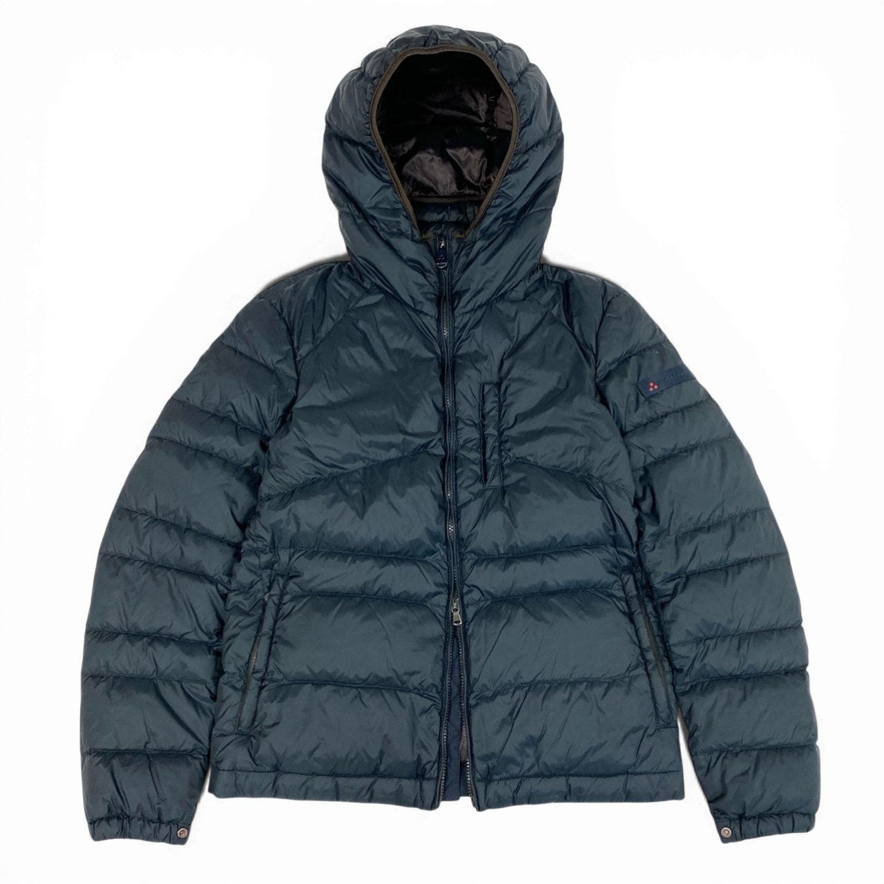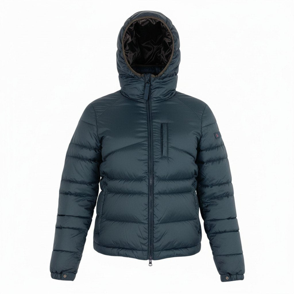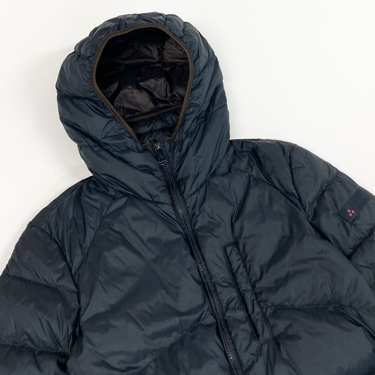 ミッドナイトネイビーの無地デザインで、光沢のあるナイロン素材が上品な印象を与えるPEUTEREYのグースダウンジャケットです。ボリューム感のあるフード付き仕様と水平キルティングが特徴で、防寒性と都会的なスタイルを両立します。左袖のブランドタグや胸元の縦ジップポケットがさりげないアクセントに。カジュアルからビジネスカジュアルまで幅広く活躍する一着です。