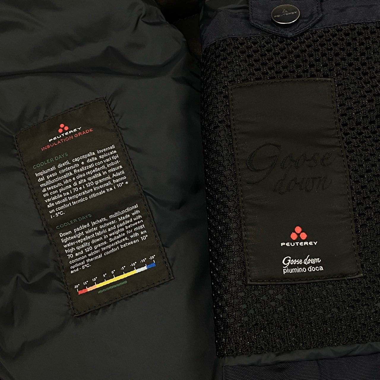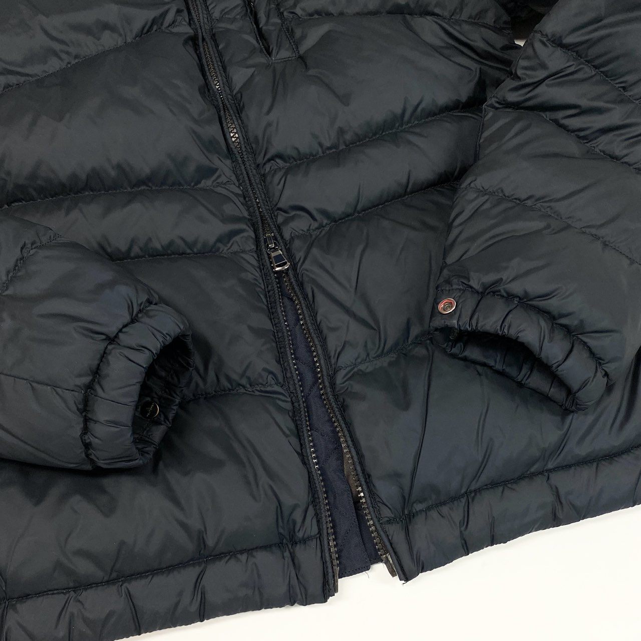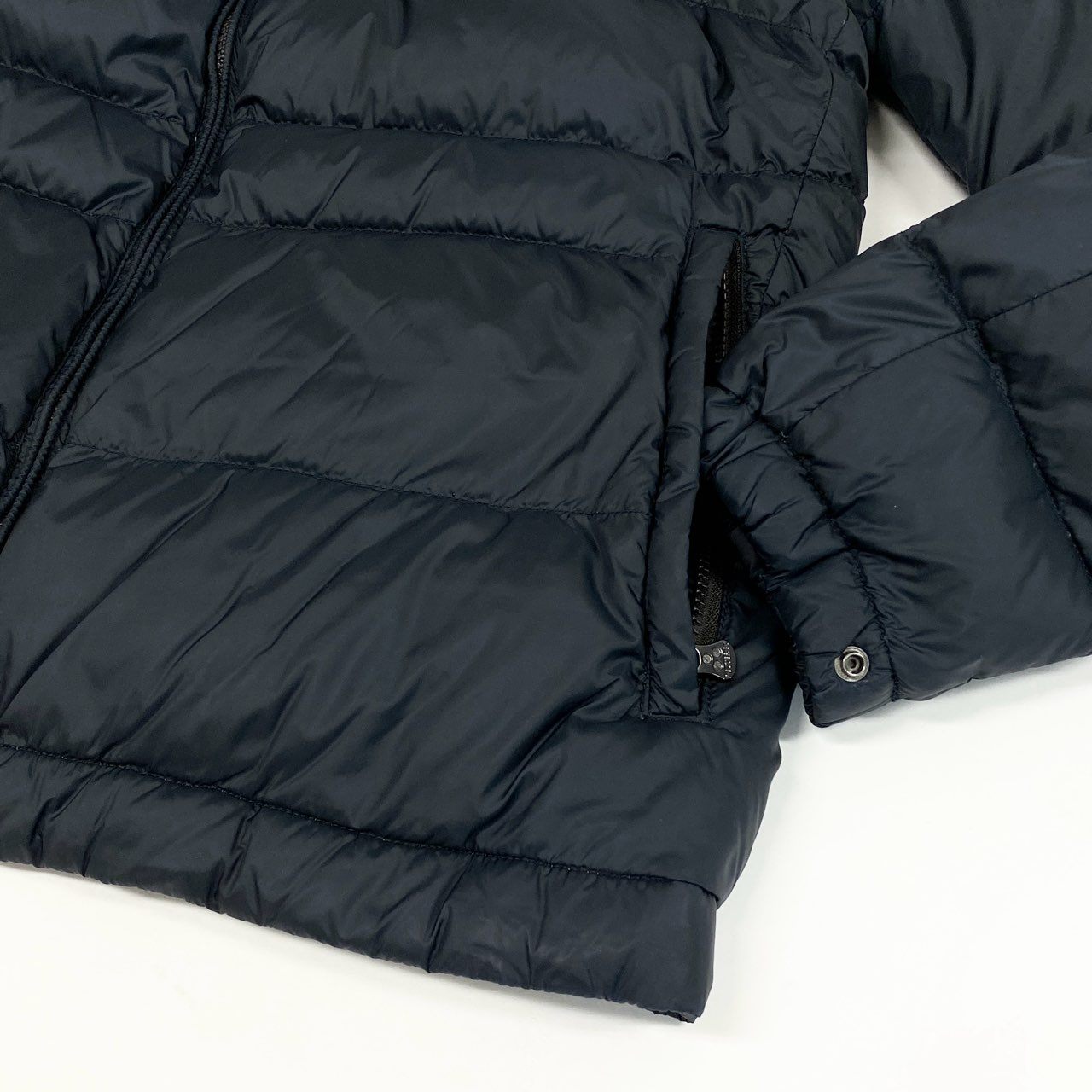 ミッドナイトネイビーの無地デザインで、光沢のあるナイロン素材が上品な印象を与えるPEUTEREYのグースダウンジャケットです。ボリューム感のあるフード付き仕様と水平キルティングが特徴で、防寒性と都会的なスタイルを両立します。左袖のブランドタグや胸元の縦ジップポケットがさりげないアクセントに。カジュアルからビジネスカジュアルまで幅広く活躍する一着です。