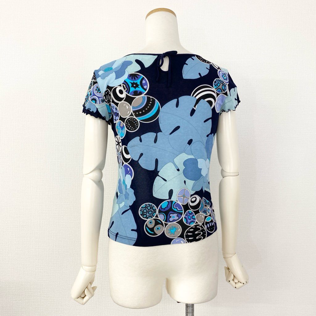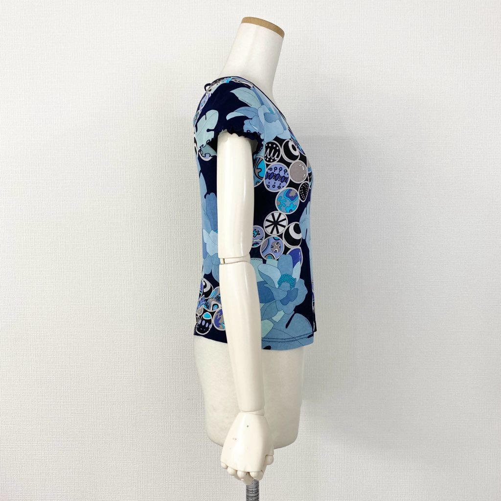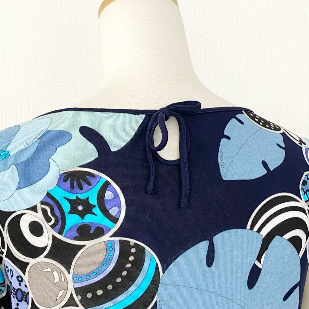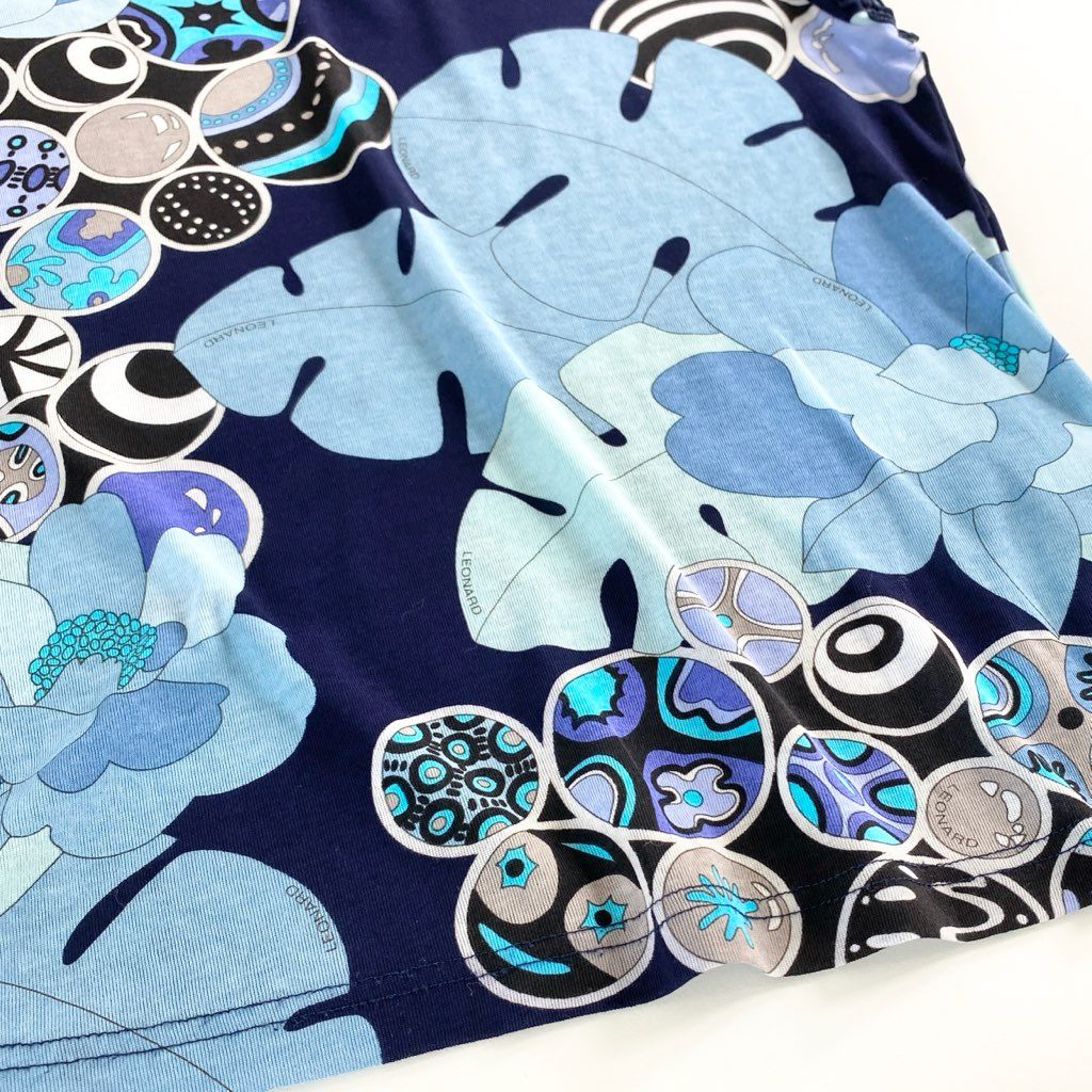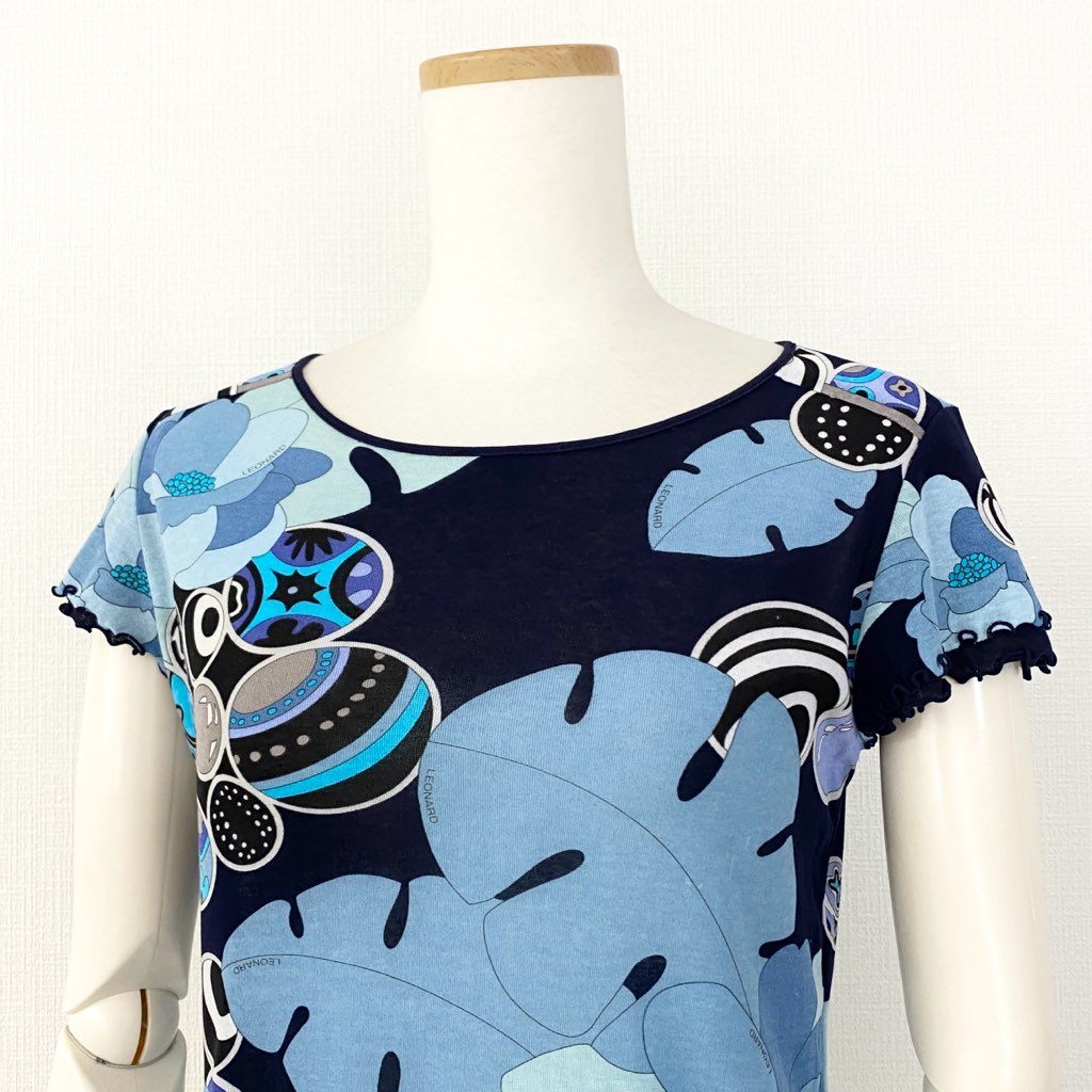 59e20 LEONARD SPORT レオナール スポーツ 半袖Tシャツ カットソー トップス 伸縮ストレッチ素材 サイズ38 ブルー マルチカラー コットン100% レディース 日本製