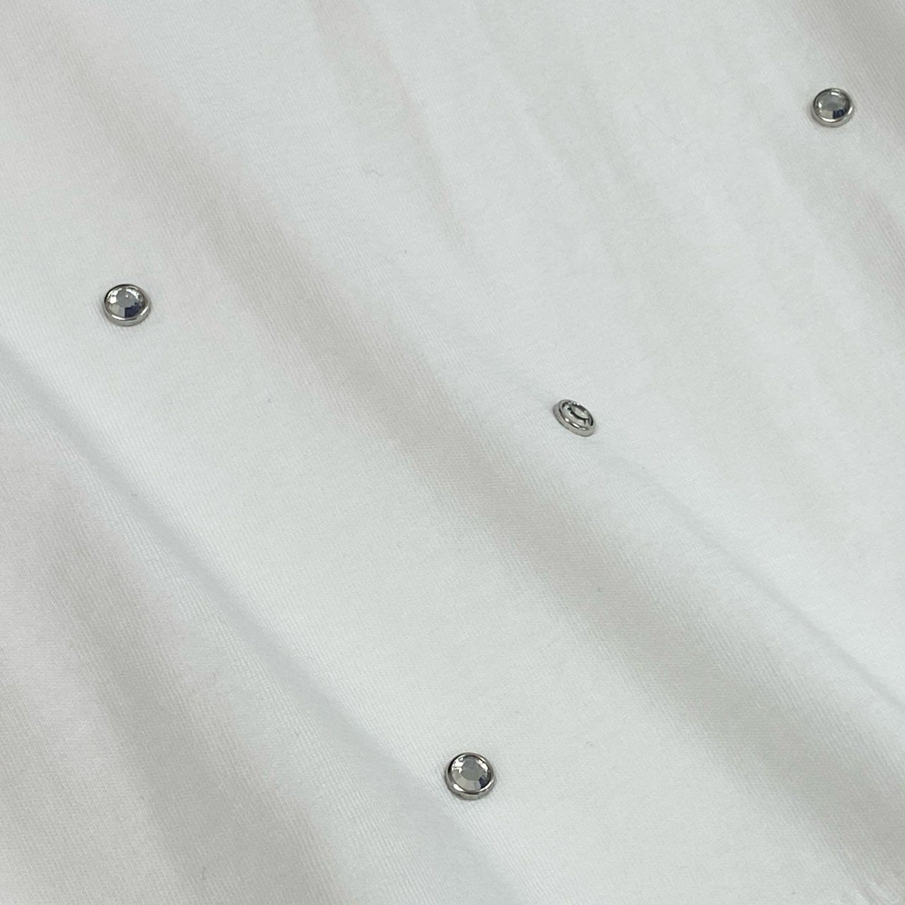 清潔感のあるホワイトカラーをベースに、全面に散りばめられたクリスタルスタッズが輝く華やかなTシャツ。フロントには**「ERMANNO」ロゴのプリント**を大胆に配置し、モード感をプラスしています。さらりとしたコットン素材で着心地も良く、1枚で主役になる存在感。デニムやスカートに合わせるだけで、カジュアルながらも上品なスタイルが完成します。