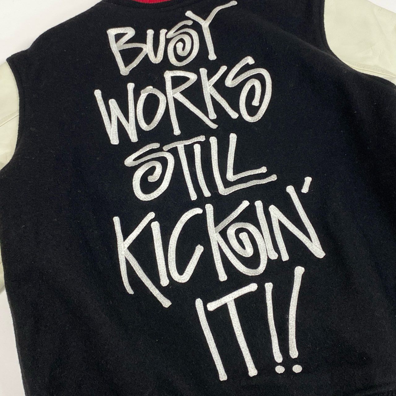 A BATHING APE × STUSSY コラボによる、存在感抜群のブラック×オフホワイト配色スタジャン。身頃はマットなウール素材、袖はスムースなレザー調素材で切り替えられた高級感ある仕上がりです。胸元の赤刺繍ワッペンロゴや、リブ部分のレッド×ホワイトラインがアクセントとなり、ストリート感を演出。カジュアルからモードまで幅広いスタイルにマッチする1着です。