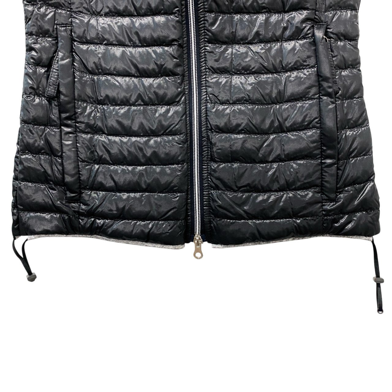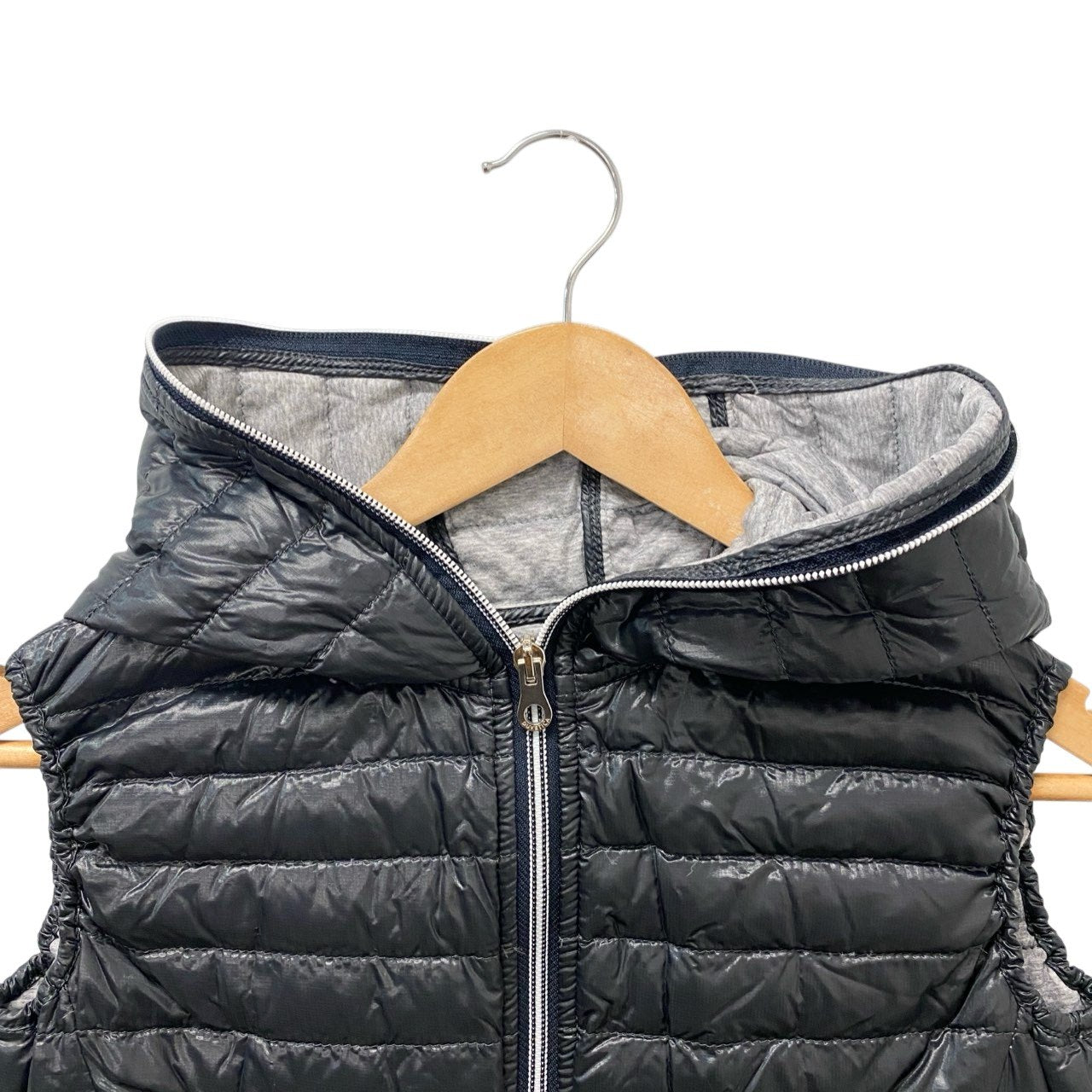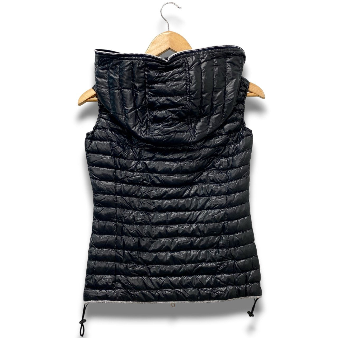艶感のあるブラックナイロン素材に、横段キルティングを施したフーディーダウンベストです。 光沢のある軽量ナイロンシェルと、ふっくらとしたダウンのボリューム感がスポーティーかつ洗練された印象を演出します。 ダブルジップ仕様と裾ドローコード付きで、シルエット調整が可能な実用的ディテールも魅力です。 パーカーやロンTに重ねたストリートスタイルから、きれいめカジュアルの外しアイテムとしても活躍する一着です。