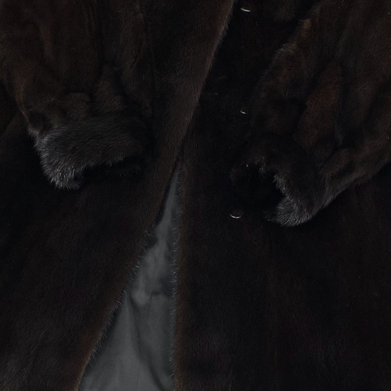 ランバンの「BLACKGLAMA」マホガニーミンクコートです。色味は深みのある「ダークブラウン」、毛足の長いミンクファー特有の艶やかで柔らかな質感が魅力です。装飾を抑えたシンプルなデザインで、高級感を際立たせています。ひざ丈のエレガントなシルエットはドレスアップシーンや特別な場面に最適です。寒冷地での防寒性にも優れ、永く愛用いただけるラグジュアリーな一着です。