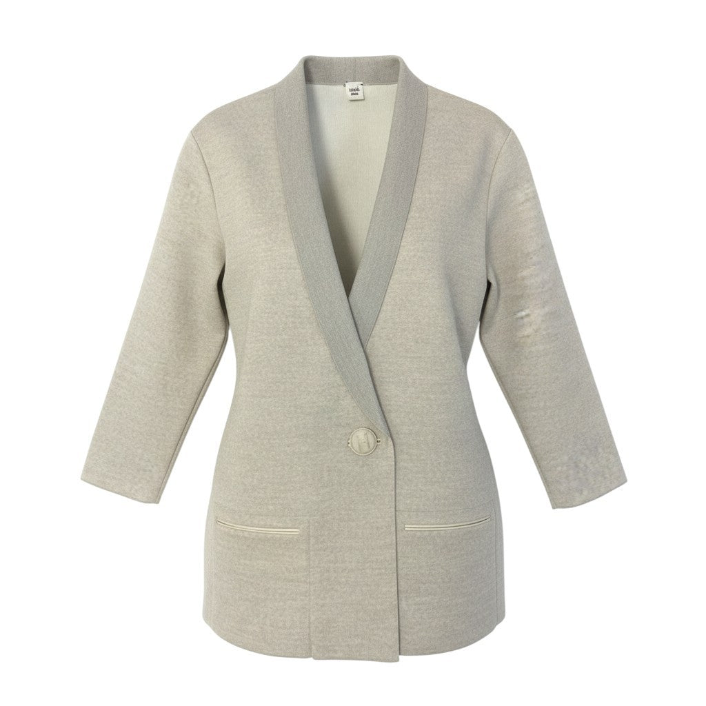柔らかなライトベージュカラーに、柄のない無地デザインが上品なエルメスのニットジャケットです。素材はきめ細かなハイゲージニットで、滑らかで落ち着いた質感が特徴。フロントにはHロゴ入りのレザーボタンを配し、さりげないブランド性と高級感を演出しています。カーディガン感覚で羽織れる軽さがあり、通勤やきれいめカジュアル、季節の変わり目のアウターとしても幅広く活躍する一着です。