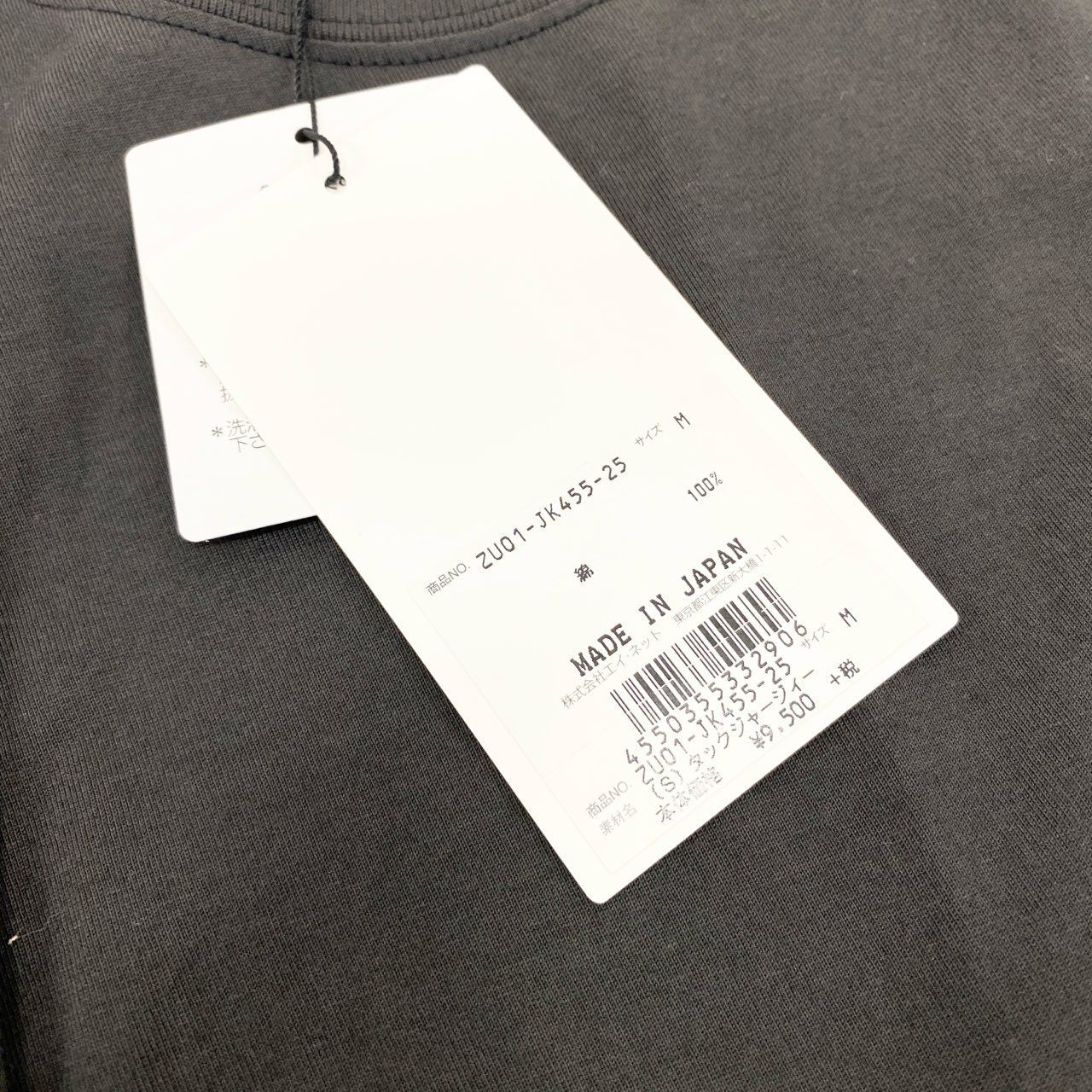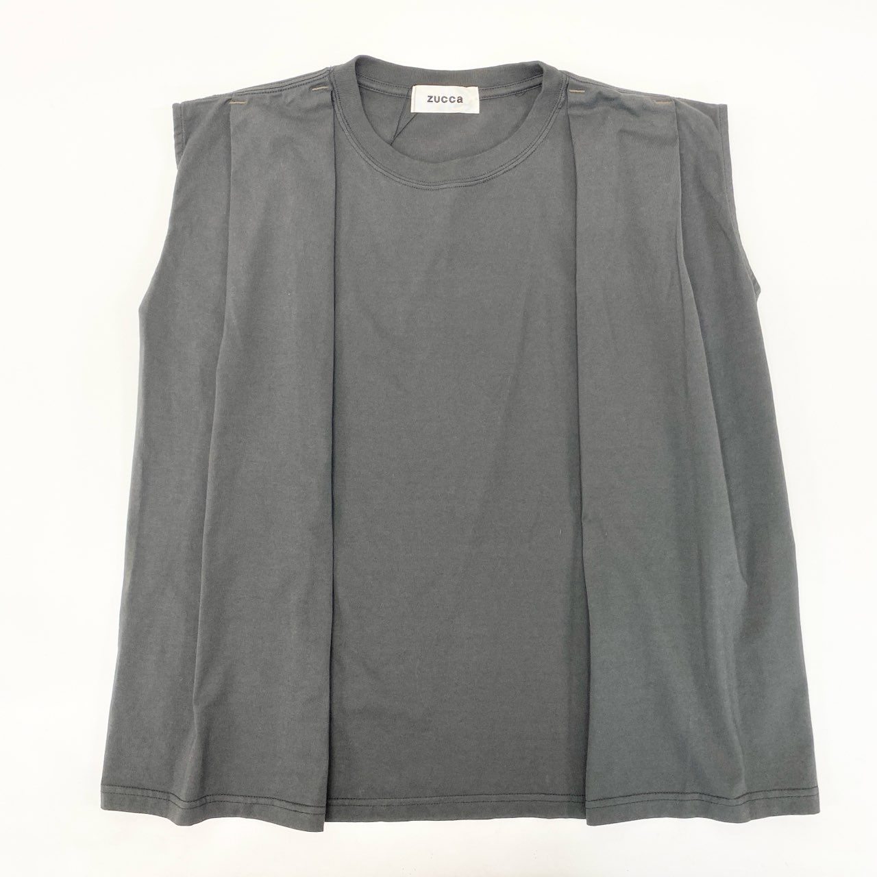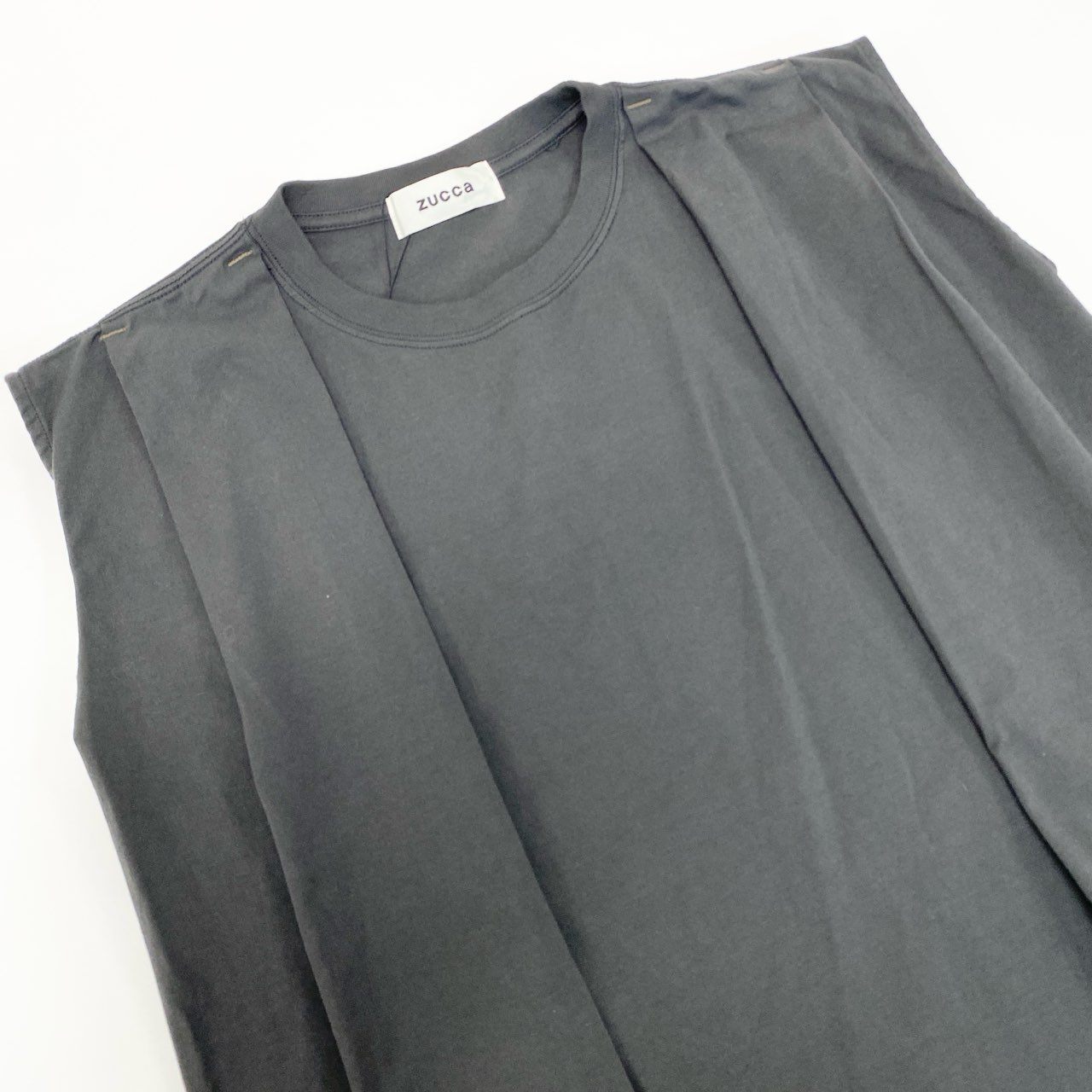 ズッカの「タックジャージー カットソー」です。色味は落ち着いたチャコールグレーで、マットなコットン素材が上品な印象を与えます。肩に施されたタックディテールが特徴で、シンプルながら立体感のあるデザインに仕上がっています。カジュアルからきれいめまで幅広いスタイルに合わせやすく、夏場の一枚着はもちろん、軽い羽織りのインナーとしても活躍します。