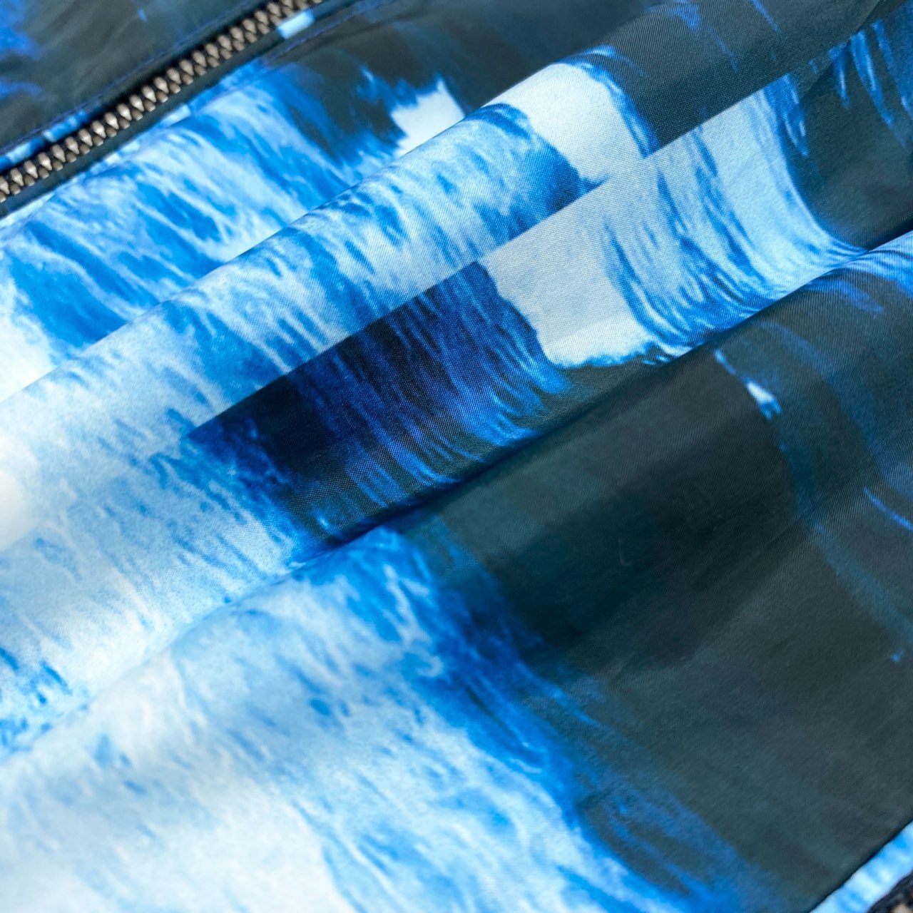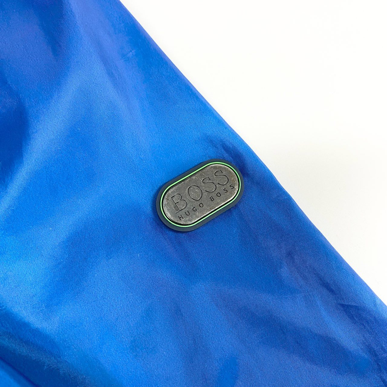 HUGO BOSS(ヒューゴボス)のウィンドブレーカー。鮮やかなオーシャンブルーを基調に、海辺の波を思わせるグラフィックプリントが印象的な一着です。素材は光沢のあるナイロンで、軽やかかつ防風性に優れています。フロントのダブルジップやハイネックデザインがスポーティかつスタイリッシュな印象を演出。アクティブシーンはもちろん、デイリーの差し色アウターとしても活躍するデザイン性の高いアイテムです。