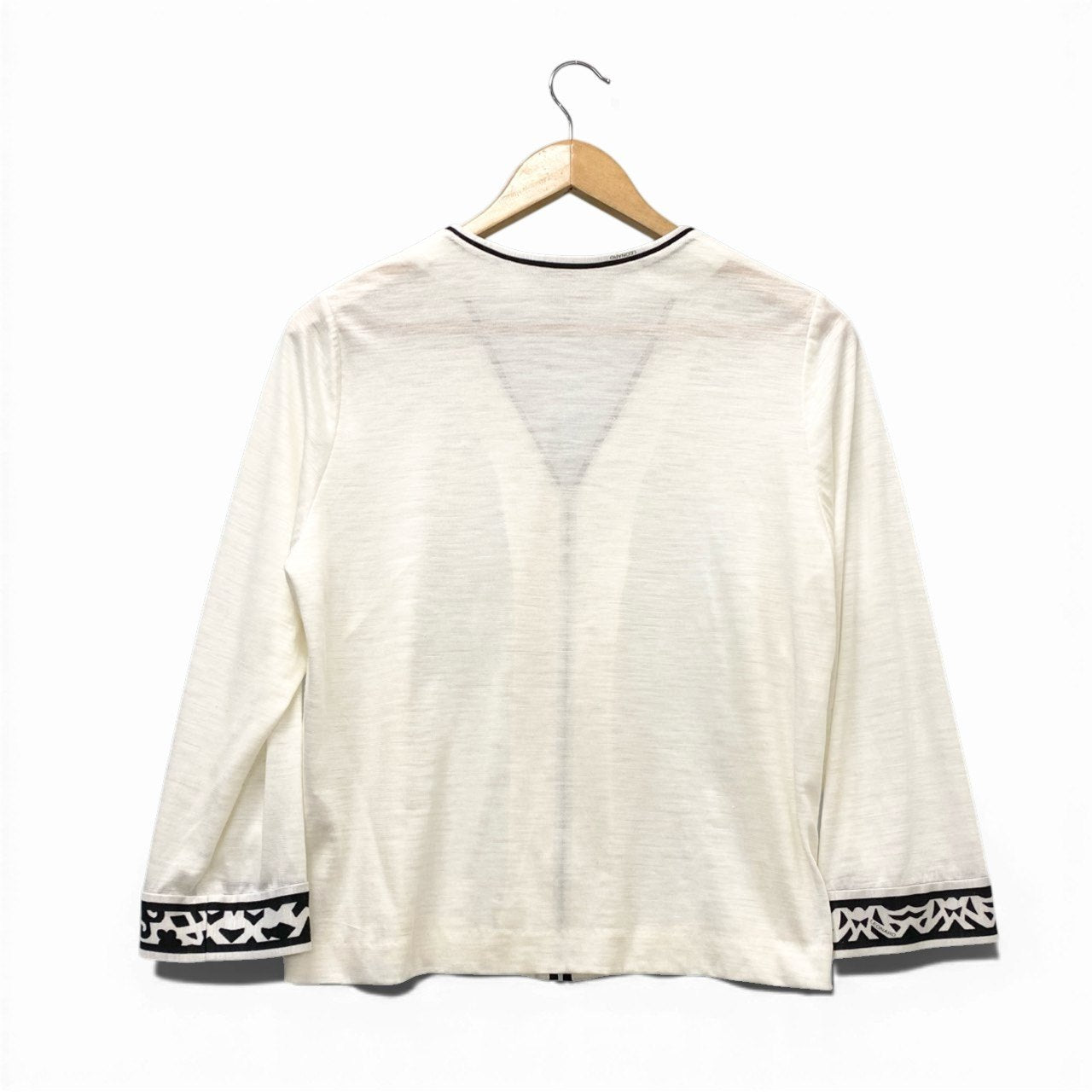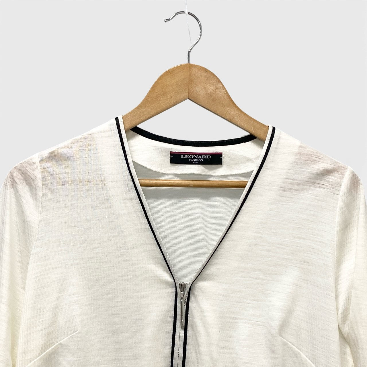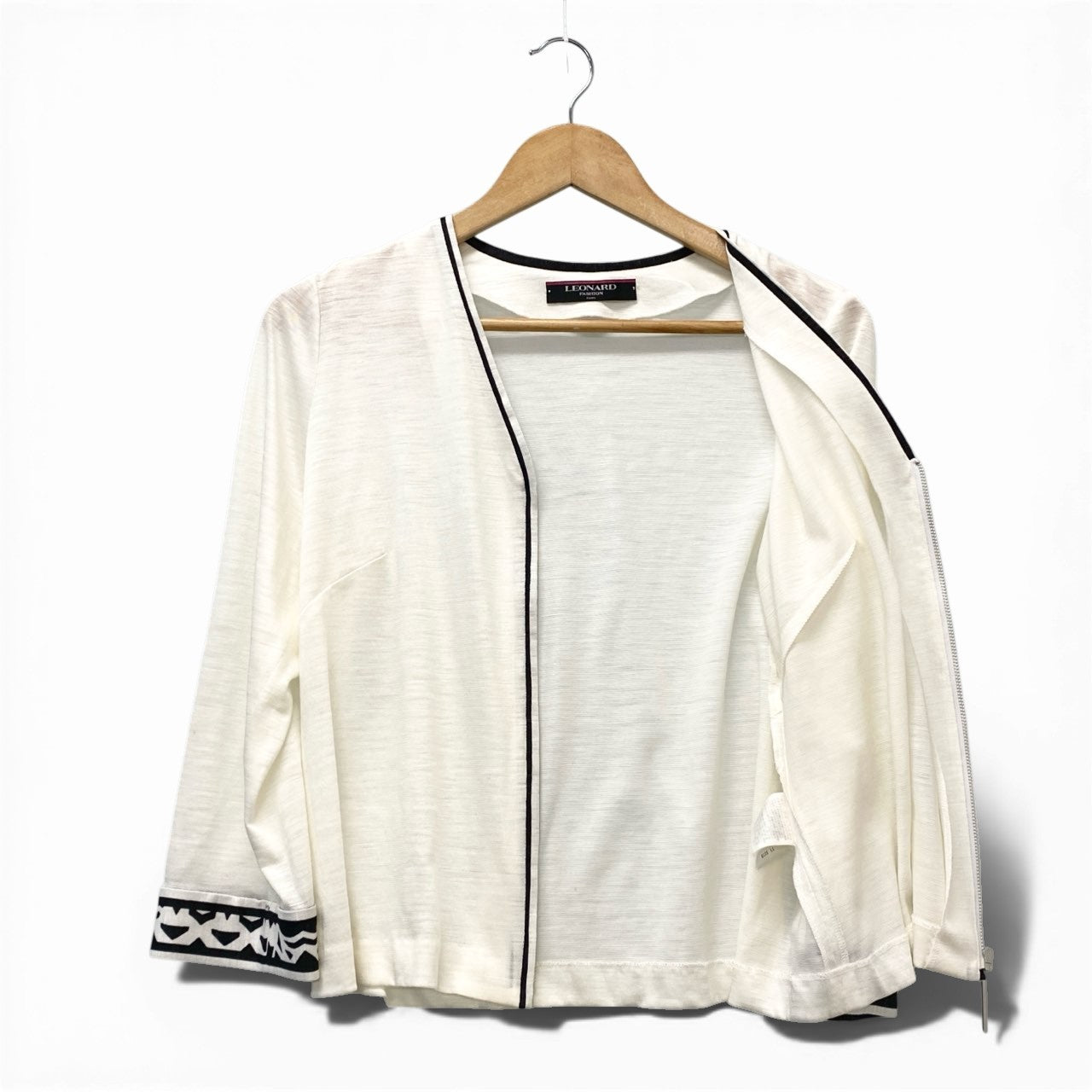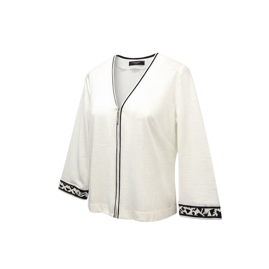 ナチュラルなアイボリーホワイトのリネン100%カーディガンです。 さらりとしたマットなリネン素材が特徴で、春夏に最適な軽やかな着心地。 フロントと袖口にはブラックのパイピングと幾何学柄トリムが施され、シンプルながらも上品なアクセントになっています。 ジップアップ仕様で着脱しやすく、ワンピースやパンツスタイルにさっと羽織れる大人のデイリーアイテムです。