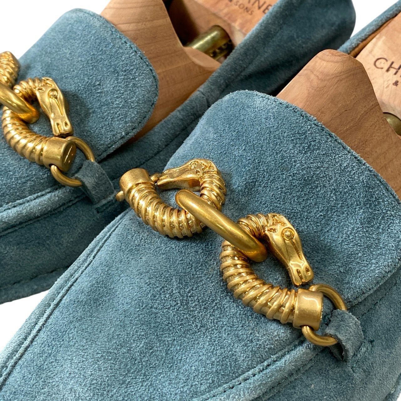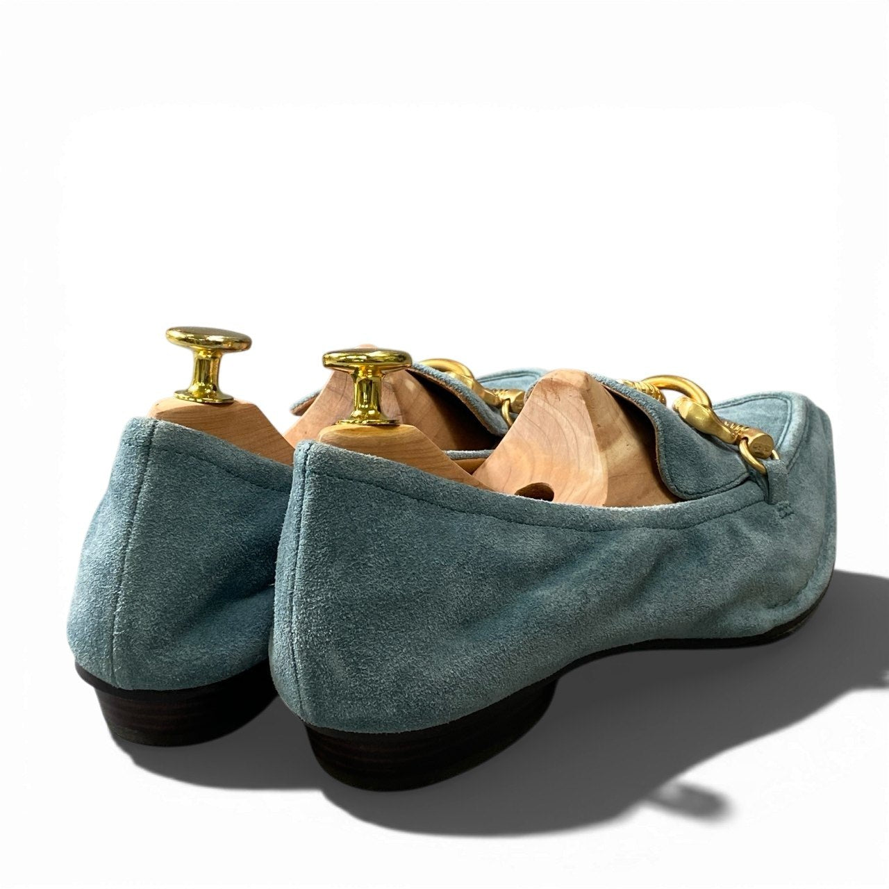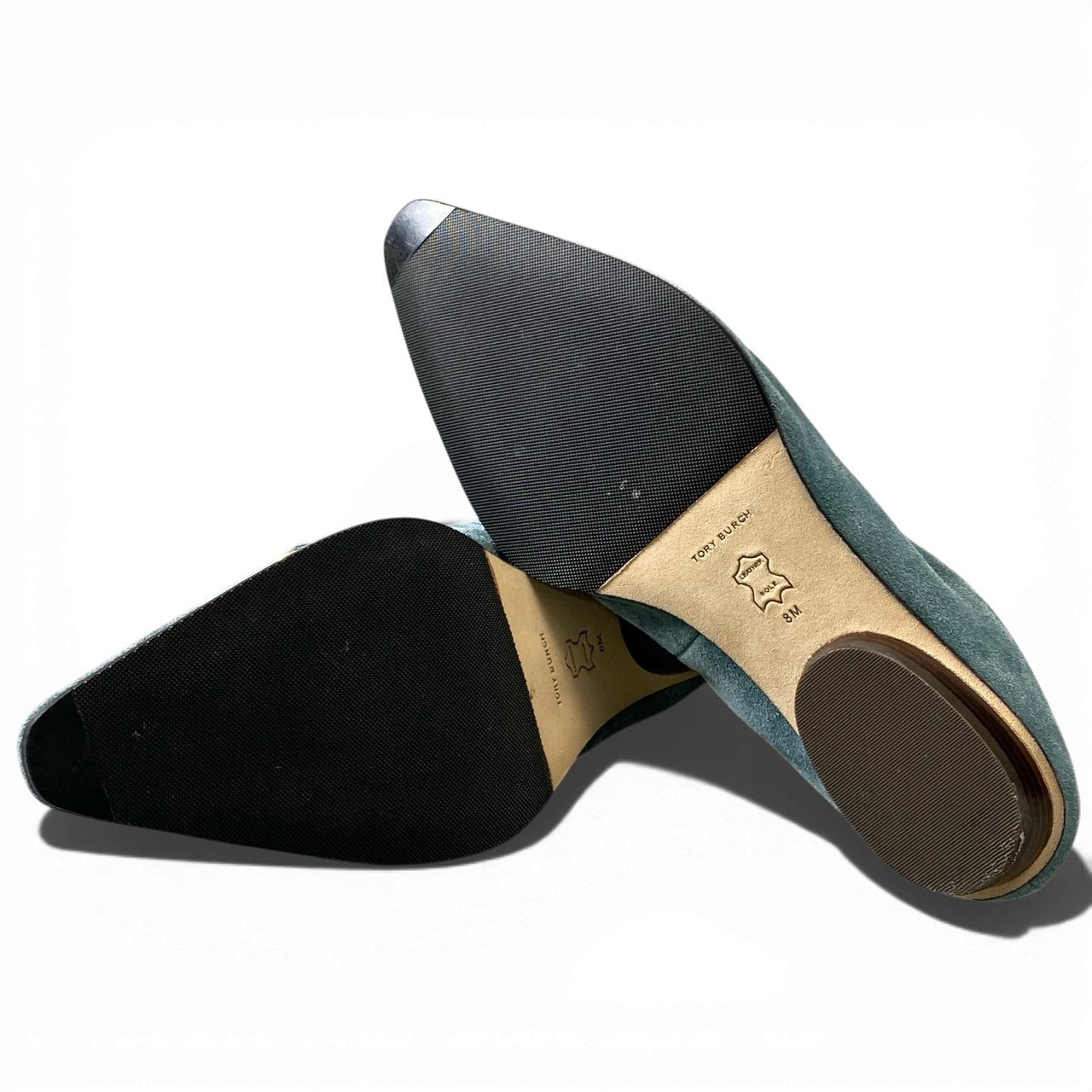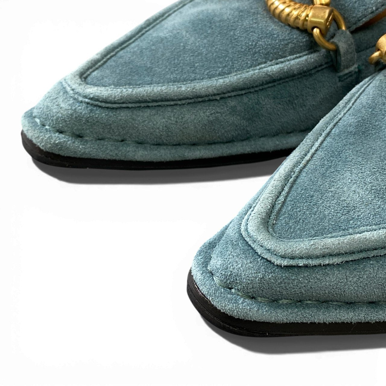 上品なブルーグリーン(ティール系)のスエード素材に、艶のあるゴールドカラーメタルのビット装飾が映えるローファーパンプスです。マットな質感のスエードが足元に柔らかな表情を与え、スクエア寄りのトゥで程よくモードな印象。低めヒールで安定感があり、きれいめカジュアルから通勤コーデまで幅広く活躍します。**TORY BURCH**らしい洗練と実用性を兼ね備えた一足です。